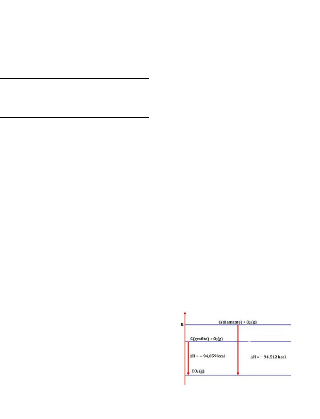 Lista de Exercícios – 2º ano 1. A tabela apresenta as entalpias de combustão para as diferentes substâncias, frequentemente utilizadas como combustíveis. Substância Entalpia de combustão (kJ/mol) (valores aproximados) - 890 - 2220 - 2878 - 5471 - 726 - 1368 Com base nessas informações, resolva as seguintes equações: a) Represente as equações termoquímicas das reações de combustão para cada combustível. b) Além de produzir o mínimo possível de poluição, a escolha de um combustível depende da quantidade de calor fornecida. Entre os combustíveis citados na tabela, qual libera a maior quantidade de calor por mol consumido? E por grama? (Nesta questão é importante pensar que quando se pergunta em relação a grama podemos fazer uma regra de três, já que na tabela o valor da entalpia se refere a cada mol consumido, portanto, mol pode ser convertido a massa através do cálculo de massa molar) c) Determine a quantidade de matéria de etanol (C2H5OH) a ser queimada para liberar 342 kJ d) Determine a quantidade de energia liberada na queima de 32,4 kg de gasolina, cujo componente principal é o octano (C8H18) e) Calcule a massa de etanol (C2H5OH) necessária para gerar a mesma quantidade de calor liberada na queima de 1 mol de octano (C8H18) CADERNO DE ATIVIDADE PG 5 e 6 2. A termoquímica estuda a energia que é liberada ou absorvida, sob a forma de calor, em pressão constante, em processos como mudanças de fases e reações químicas. Sobre a termoquímica, analise as afirmações a seguir e marque V para verdadeiro e F para falso. ( ) Uma reação de combustão é uma reação exotérmica, na qual a variação de entalpia tem sinal negativo. ( ) Quando uma reação endotérmica ocorre, o sistema formado pelos participantes dessa reação absorve calor das vizinhanças. ( ) Derramando-se gotas de propanona (H3CCOCH3(ℓ)) na pele, é provocada uma sensação de frio, justificada em razão de a evaporação ser um processo exotérmico. ( ) A dissolução do H2SO4 concentrado em água é um processo exotérmico, que pode ser confirmado pela diminuição da temperatura. ( ) O processo de fusão do gelo absorve calor da vizinhança, assim, a variação de entalpia tem sinal negativo. 3. Com base nos conceitos de Termoquímica, assinale V para as afirmativas verdadeiras e F para as falsas ( ) A combustão é uma reação química que ocorre com absorção de calor. ( ) Na prática, não se consegue medir a variação de entalpia de uma reação química. ( ) O calor da reação depende somente da(s) quantidade(s) de reagente(s) e de produto(s). ( ) A transformação da água sólida para a líquida ocorre com liberação de calor. 4. O diagrama a seguir apresenta as entalpias de combustão das variedades alotrópicas mais conhecidas do elemento carbono – a grafite e o diamante. Com base nas informações, responda: a) Qual dos alótropos é o mais estável? Justifique sua resposta. b) Determine a variação de entalpia do C(diamante) → C(grafite) 5. A síntese da amônia, sem o ajuste dos coeficientes estequiométricos, pode ser expressa pela representação da equação química: N2(g) + H2(g) ↔ NH3(g) com ΔH = –46,1 kJ mol–1 Considerando as informações apresentadas, assinale a alternativa correta: (A) Quando a entalpia dos produtos for menor do que a dos reagentes, o valor de ΔH será maior do que zero (B) Sendo considerada a decomposição da amônia, a entalpia dos produtos será maior do que a dos reagentes e ΔH será positivo. (C) A reação de síntese da amônia é um processo em que o sistema cede calor à vizinhança, caracterizando uma reação endotérmica. (D) Ao reagirem 6,0 mol de moléculas de gás hidrogênio (H2(g)), o processo absorverá 184,4 kJ de calor. (E) A entalpia de formação da amônia envolve a absorção de 46,1 kJ mol–1 6. O nitrato de amônio pode ser utilizado na fabricação de fertilizantes, herbicidas e explosivos. Sua reação de decomposição está representada abaixo: NH4NO3(s)→ N2O(g) + 2 H2O(g) ΔH = –37 kJ A energia liberada (em módulo) quando 90 g de água é formada por essa reação é: Dados: H: 1g/mol; O: 16 g/mol; N: 14 g/mol (A) 74 kJ (B) 92,5 kJ (C) 185 kJ (D) 60,5 kJ (A)