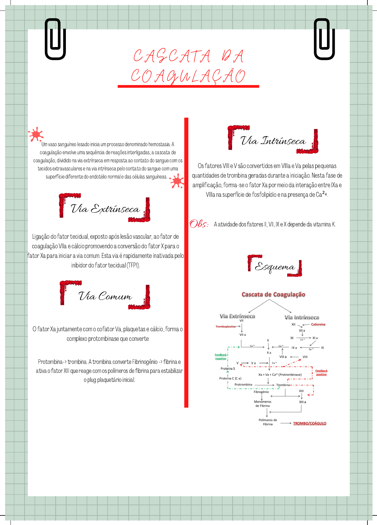C A S C A T A D A C OAGU L A Ç ÃO Um vaso sanguíneo lesado inicia um processo denominado hemostasia. A coagulação envolve uma sequência de reações interligadas, a cascata de coagulação, dividido na via extrínseca em resposta ao contato do sangue com os tecidos extravasculares e na via intrínseca pelo contato do sangue com uma superfície diferente do endotélio normal e das células sanguíneas. Via Extrínseca Via Comum Via Intrínseca Esquema Ligação do fator tecidual, exposto após lesão vascular, ao fator de coagulação VIIa e cálcio promovendo a conversão do fator X para o fator Xa para iniciar a via comum. Esta via é rapidamente inativada pelo inibidor do fator tecidual (TFPI). O fator Xa juntamente com o cofator Va, plaquetas e cálcio, forma o complexo protombinase que converte Protombina-> trombina. A trombina converte Fibrinogênio -> fibrina e ativa o fator XIII que reage com os polímeros de fibrina para estabilizar o plug plaquetário inicial. Os fatores VIII e V são convertidos em VIIIa e Va pelas pequenas quantidades de trombina geradas durante a iniciação. Nesta fase de amplificação, forma-se o fator Xa por meio da interação entre IXa e VIIIa na superfície de fosfolipídio e na presença de Ca²+. Obs: A atividade dos fatores II, VII, IX e X depende da vitamina K.