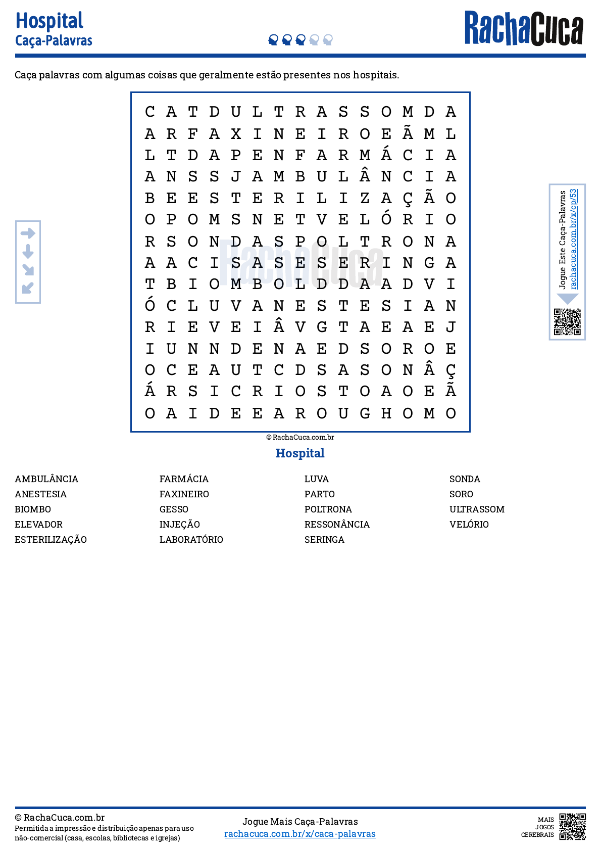 Caça palavras com algumas coisas que geralmente estão presentes nos hospitais. Hospital © RachaCuca.com.br Permitida a impressão e distribuição apenas para uso não-comercial (casa, escolas, bibliotecas e igrejas) Jogue Mais Caça-Palavras rachacuca.com.br/x/caca-palavras MAIS JOGOS CEREBRAIS AMBULÂNCIA ANESTESIA BIOMBO ELEVADOR ESTERILIZAÇÃO FARMÁCIA FAXINEIRO GESSO INJEÇÃO LABORATÓRIO LUVA PARTO POLTRONA RESSONÂNCIA SERINGA SONDA SORO ULTRASSOM VELÓRIO Hospital Caça-Palavras C A T D U L T R A S S O M D A A R F A X I N E I R O E Ã M L L T D A P E N F A R M Á C I A A N S S J A M B U L Â N C I A B E E S T E R I L I Z A Ç Ã O O P O M S N E T V E L Ó R I O R S O N D A S P O L T R O N A A A C I S A S E S E R I N G A T B I O M B O L D D A A D V I Ó C L U V A N E S T E S I A N R I E V E I Â V G T A E A E J I U N N D E N A E D S O R O E O C E A U T C D S A S O N Â Ç Á R S I C R I O S T O A O E Ã O A I D E E A R O U G H O M O © RachaCuca.com.br J o g u e E st e C a ç a -P a la v ra s ra c h a c u c a .c o m .b r/ x /c p /5 3 https://rachacuca.com.br/x/main/home/?src=RWSS1H&evt=copyright-footer/click https://rachacuca.com.br/x/caca-palavras/?src=RWSS1H&evt=play-more/click https://rachacuca.com.br/x/main/home/?src=RWSS1H&evt=logo/click https://rachacuca.com.br/x/main/home/?src=RWSS1H&evt=copyright-game/click https://rachacuca.com.br/x/cp/53/?src=RWSS1H&evt=link-widget/click Caça palavras com algumas coisas que geralmente estão presentes nos hospitais. © RachaCuca.com.br Permitida a impressão e distribuição apenas para uso não-comercial (casa, escolas, bibliotecas e igrejas) Jogue Mais Caça-Palavras rachacuca.com.br/x/caca-palavras MAIS JOGOS CEREBRAIS Hospital Caça-Palavras C A T D U L T R A S S O M D A A R F A X I N E I R O E Ã M L L T D A P E N F A R M Á C I A A N S S J A M B U L Â N C I A B E E S T E R I L I Z A Ç Ã O O P O M S N E T V E L Ó R I O R S O N D A S P O L T R O N A A A C I S A S E S E R I N G A T B I O M B O L D D A A D V I Ó C L U V A N E S T E S I A N R I E V E I Â V G T A E A E J I U N N D E N A E D S O R O E O C E A U T C D S A S O N Â Ç Á R S I C R I O S T O A O E Ã O A I D E E A R O U G H O M O © RachaCuca.com.br J o g u e E st e C a ç a -P a la v ra s ra c h a c u c a .c o m .b r/ x /c p /5 3 https://rachacuca.com.br/x/main/home/?src=RWSS1H&evt=copyright-footer/click https://rachacuca.com.br/x/caca-palavras/?src=RWSS1H&evt=play-more/click https://rachacuca.com.br/x/main/home/?src=RWSS1H&evt=logo/click https://rachacuca.com.br/x/main/home/?src=RWSS1H&evt=copyright-game/click https://rachacuca.com.br/x/cp/53/?src=RWSS1H&evt=link-widget/click