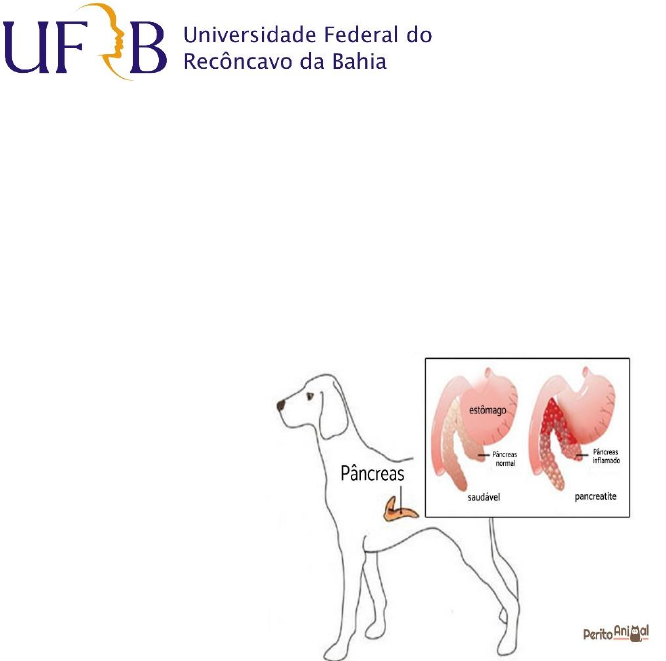 CENTRO DE CIÊNCIAS AGRÁRIAS, AMBIENTAIS E BIOLÓGICAS. GCCA 426 –ANATOMIA PATOLÓGICA VETERINÁRIA. DISCENTE: ERIVÂNIA S. NASCIMENTO. 1 Pancreatite aguda canina A pancreatite aguda é caracterizada por inflamação na porção exócrina do pâncreas, se desenvolve de forma abrupta em cães, podendo ser um processo reversível, causar danos locais ou sistêmicos e nos casos graves, pode levar a necrose tecidual e evoluir ao óbito do paciente. Sua causa pode haver vários fatores envolvido como: o acúmulo de tecido adiposo e ingestão de dietas gordurosas, deficiências na quebra de gorduras e lipídeos, obesidade, isquemia, alguns fármacos... A inflamação do pâncreas provoca ativação das enzimas digestivas pancreáticas, onde essas enzimas causam uma autodigestão tecidual. Fatores predisponentes Ocorre com maior prevalência em animais de meia idade, idosos, obesos castrados, acomete fêmeas e machos. A pancreatite aguda pode ocorrer em qualquer cão, mas as raças: Pastor Alemão, Cavalier King Charles Spaniel, Jack Russell Terrier, West Highland White Terrier, Yorkshire Terrier e Chow Chow são mais predispostas. Sinais clínicos Vômito, dor abdominal, anorexia, depressão, icterícia, fraqueza, desidratação, diarréia e febre. Achados microscópico Infiltrado inflamatório constituído por neutrófilos, linfócitos e macrófagos, necrose do parênquima. Achados macroscópico Necrose, edema, hemorragia, trombose, presença de fibrina, exsudato supurativo, pode ocorrer aderência entre o tecido pancreático e órgãos adjacentes. CENTRO DE CIÊNCIAS AGRÁRIAS, AMBIENTAIS E BIOLÓGICAS. GCCA 426 –ANATOMIA PATOLÓGICA VETERINÁRIA. DISCENTE: ERIVÂNIA S. NASCIMENTO. 2