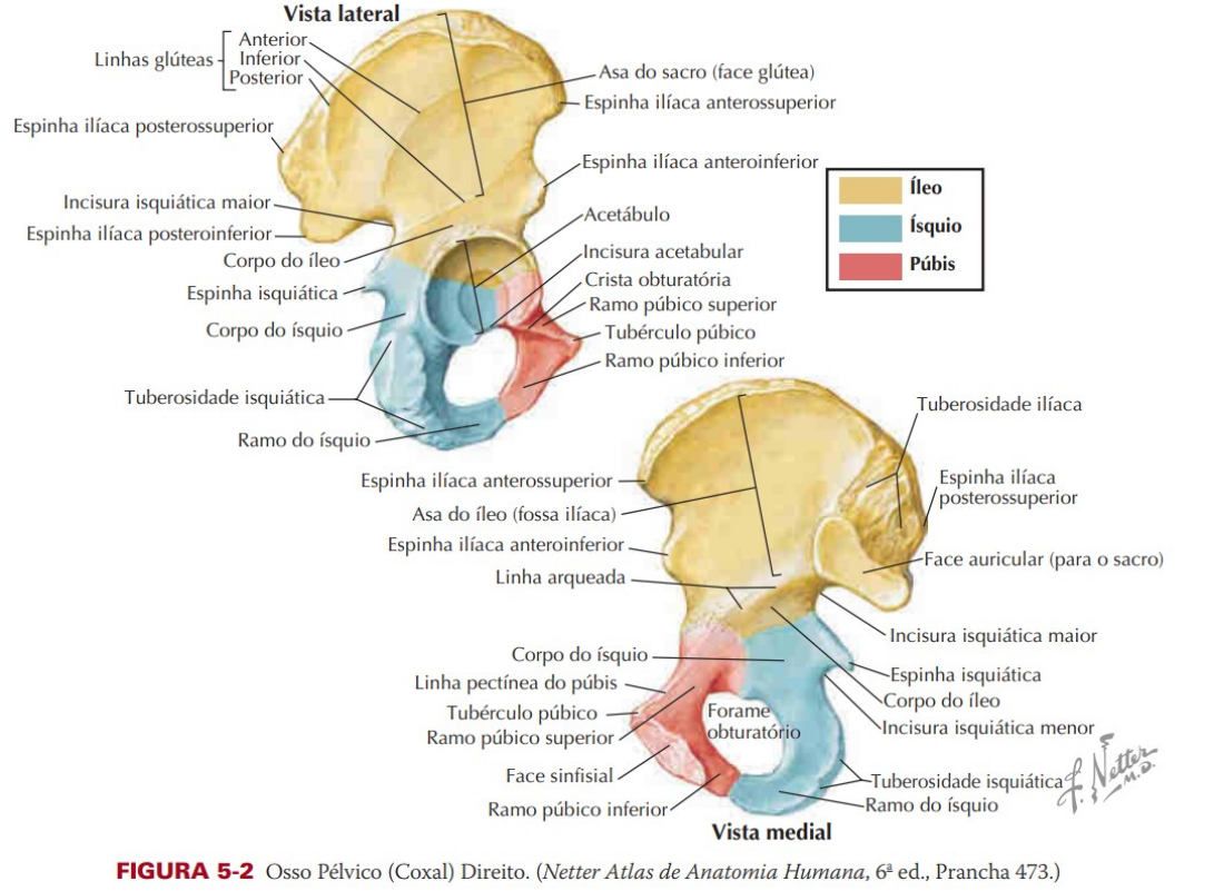 Anatomia: pelve Osso do quadril: Dois ossos: quadril Dois ossos e o sacro: pelve Anatomia muscular: Região glútea Glúteo máximo: Origem: face glútea do ílio, face dorsal do sacro e ligamento sacrotuberal Face glútea do ílio: Linha glútea posterior do íleo, sacro, cóccix e ligamento sacrotuberoso. Inserção: Tuberosidade glútea do fêmur. Inervação: Nervo Glúteo Inferior (L5 – S2). Ação: Extensão e rotação lateral do quadril. Trato iliotibial: joelho de corredor Formado pela união dos músculos glúteo máximo, médio e tensor da fáscia lata Estabiliza o quadril e o joelho na face lateral, auxilia o quadríceps na extensão do joelho e músculos isquiotibiais na flexão do joelho Se estende do tubérculo ilíaco até o côndilo lateral da tíbia (tubérculo de Gerdy) Glúteo médio: Glúteo mínimo: Sequência músculos profundos do quadril: rotadores externos do quadril: inserção no trocanter maior do fêmur Piriforme (relação com n ciático) Gêmeo superior: Obturador interno: Gêmeo inferior Quadrado da coxa ou femoral: Obturador externo: