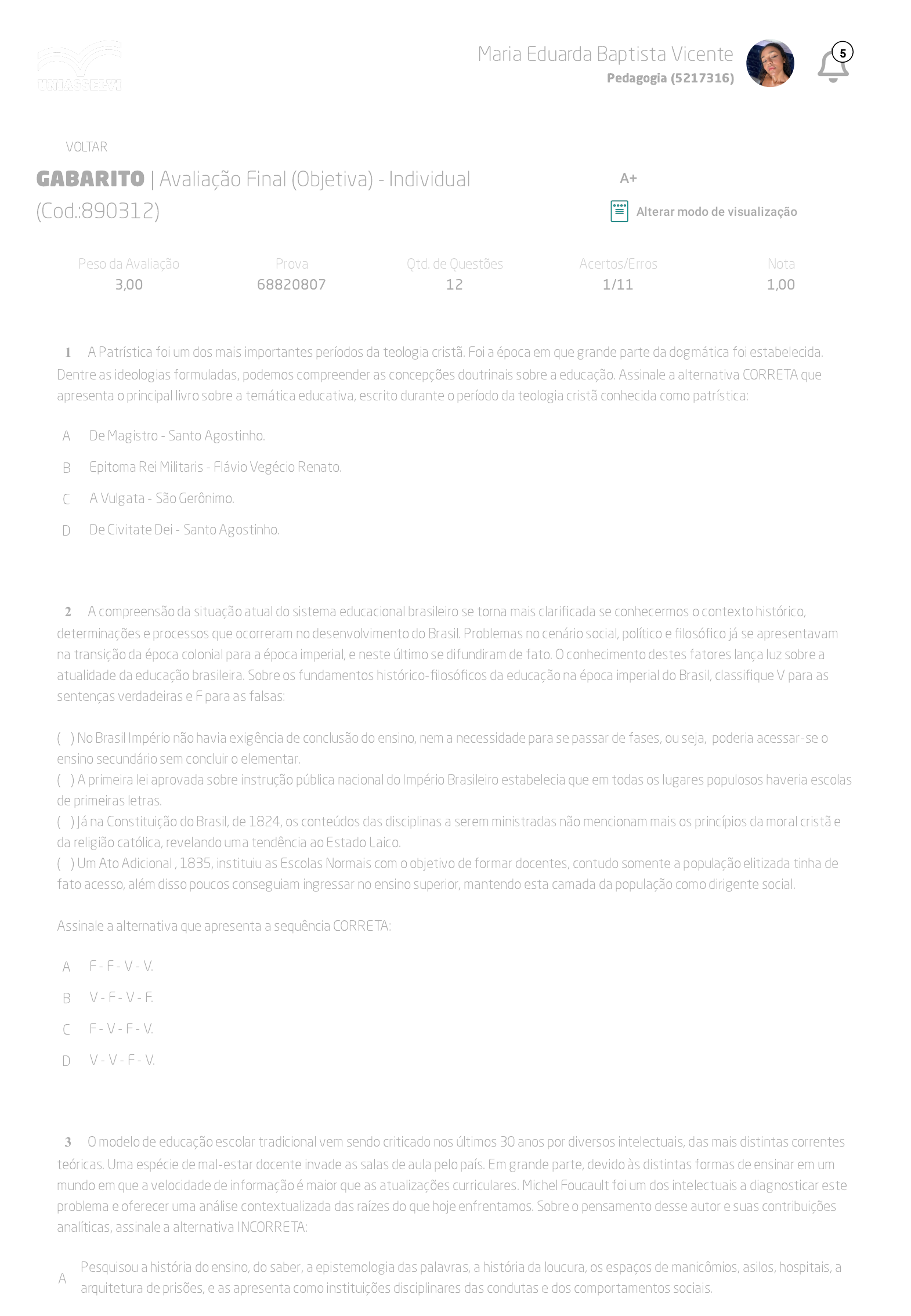 10/09/2023, 10:57 AVA https://ava2.uniasselvi.com.br/subject/grades-and-tests/answer-book/eyJ0ZXN0Ijp7InRlc3RDb2RlIjoiODkwMzEyIiwiZGVzY3JpcHRpb24iOiJBdmFsaWHDp8OjbyBGaW5hbCAoT2JqZXRpdmEpIC0gSW5kaXZpZHVhbCIsInBhcm… 1/5 GABARITO | Avaliação Final (Objetiva) - Individual (Cod.:890312) Peso da Avaliação 3,00 Prova 68820807 Qtd. de Questões 12 Acertos/Erros 1/11 Nota 1,00 A Patrística foi um dos mais importantes períodos da teologia cristã. Foi a época em que grande parte da dogmática foi estabelecida. Dentre as ideologias formuladas, podemos compreender as concepções doutrinais sobre a educação. Assinale a alternativa CORRETA que apresenta o principal livro sobre a temática educativa, escrito durante o período da teologia cristã conhecida como patrística: A De Magistro - Santo Agostinho. B Epitoma Rei Militaris - Flávio Vegécio Renato. C A Vulgata - São Gerônimo. D De Civitate Dei - Santo Agostinho. A compreensão da situação atual do sistema educacional brasileiro se torna mais clarificada se conhecermos o contexto histórico, determinações e processos que ocorreram no desenvolvimento do Brasil. Problemas no cenário social, político e filosófico já se apresentavam na transição da época colonial para a época imperial, e neste último se difundiram de fato. O conhecimento destes fatores lança luz sobre a atualidade da educação brasileira. Sobre os fundamentos histórico-filosóficos da educação na época imperial do Brasil, classifique V para as sentenças verdadeiras e F para as falsas: ( ) No Brasil Império não havia exigência de conclusão do ensino, nem a necessidade para se passar de fases, ou seja, poderia acessar-se o ensino secundário sem concluir o elementar. ( ) A primeira lei aprovada sobre instrução pública nacional do Império Brasileiro estabelecia que em todas os lugares populosos haveria escolas de primeiras letras. ( ) Já na Constituição do Brasil, de 1824, os conteúdos das disciplinas a serem ministradas não mencionam mais os princípios da moral cristã e da religião católica, revelando uma tendência ao Estado Laico. ( ) Um Ato Adicional , 1835, instituiu as Escolas Normais com o objetivo de formar docentes, contudo somente a população elitizada tinha de fato acesso, além disso poucos conseguiam ingressar no ensino superior, mantendo esta camada da população como dirigente social. Assinale a alternativa que apresenta a sequência CORRETA: A F - F - V - V. B V - F - V - F. C F - V - F - V. D V - V - F - V. O modelo de educação escolar tradicional vem sendo criticado nos últimos 30 anos por diversos intelectuais, das mais distintas correntes teóricas. Uma espécie de mal-estar docente invade as salas de aula pelo país. Em grande parte, devido às distintas formas de ensinar em um mundo em que a velocidade de informação é maior que as atualizações curriculares. Michel Foucault foi um dos intelectuais a diagnosticar este problema e oferecer uma análise contextualizada das raízes do que hoje enfrentamos. Sobre o pensamento desse autor e suas contribuições analíticas, assinale a alternativa INCORRETA: A Pesquisou a história do ensino, do saber, a epistemologia das palavras, a história da loucura, os espaços de manicômios, asilos, hospitais, a arquitetura de prisões, e as apresenta como instituições disciplinares das condutas e dos comportamentos sociais. VOLTAR A+ Alterar modo de visualização 1 2 3 Maria Eduarda Baptista Vicente Pedagogia (5217316) 5 10/09/2023, 10:57 AVA https://ava2.uniasselvi.com.br/subject/grades-and-tests/answer-book/eyJ0ZXN0Ijp7InRlc3RDb2RlIjoiODkwMzEyIiwiZGVzY3JpcHRpb24iOiJBdmFsaWHDp8OjbyBGaW5hbCAoT2JqZXRpdmEpIC0gSW5kaXZpZHVhbCIsInBhcm… 2/5 B Na obra de Foucault, encontra-se uma forte crítica aos processos de modernização da sociedade, bem como as estruturas dos governos que procuravam racionalizar de forma esmagadora os indivíduos. C Para o filósofo Michael Foucault, a escola era um local, assim como os quartéis, que visavam à construção de corpos dóceis, com a função de internalizar a disciplina como uma expressão cotidiana dos homens e das mulheres quando adultos. D Para eles, a escola era um local em que os professores propagavam as ideias que mantinham o Estado como um agente da classe burguesa, ao inculcar ideias de submissão dos seres humanos. As mudanças educacionais também alteraram as características políticas brasileiras. Durante a década de 1920 ocorreram vários movimentos e revoltas, como o Movimento dos 18 do Forte e a revolta Coluna Prestes. Isto tudo levou à Revolução de 1930 e como consequência muitas mudanças na educação brasileira. Sobre a educação brasileira nos anos de 1920 e após os anos de 1930, classifique V para as sentenças verdadeiras e F para as falsas: ( ) Ocorreu a realização de diversas reformas de abrangência estadual, como a de Lourenço Filho, no Ceará, em 1923; a de Anísio Teixeira, na Bahia, em 1925; e a de Francisco Campos e Mario Casassanta, em Minas, em 1927. ( ) Em 1932, um manifesto denominado Manifesto dos Pioneiros da Educação Nova, escrito durante o governo de Getúlio Vargas, por diferentes segmentos da elite intelectual, todos com os mesmos posicionamentos vislumbravam interferir na educação do país. ( ) Com o apoio substancial e total da Igreja, detentora de expressiva parcela de escolas da rede privada na sociedade, o manifesto conseguiu orientar (até os dias de hoje) algumas mudanças na concepção pedagógica e na forma de olhar para o ensino. ( ) Em 1930, havia sido criado o Ministério da Educação e Saúde. Da junção de diversas instituições foram fundadas algumas universidades, sendo que as primeiras a serem instituídas foram a Universidade do Distrito Federal, no Rio de Janeiro e a Universidade de São Paulo (USP). ( ) Na Constituição de 1937, avançou-se no sentido de que se incluiu o ensino profissionalizante e de que os grupos industriais e os sindicatos deveriam 