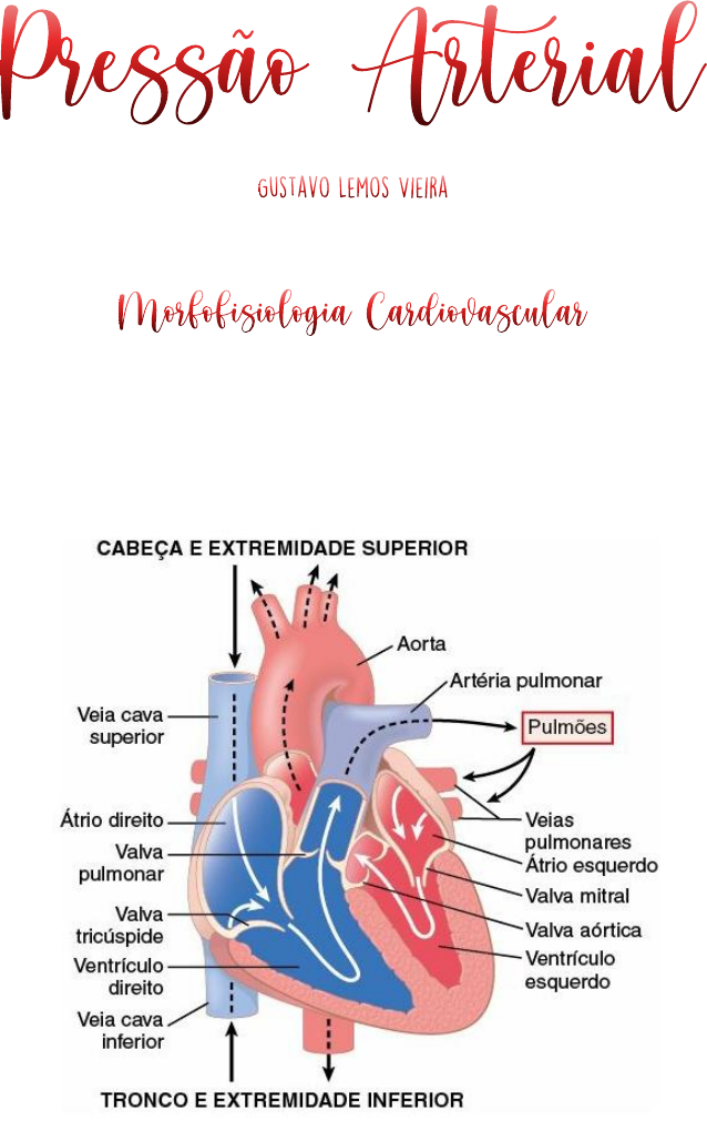 O coração é um órgão muscular formado por câmaras responsável pelo bombeamento de sangue para os tecidos corporais. O coração pode ser dividido em 2 sistemas, direito e esquerdo, devido à qualidade do sangue que circula em cada câmara e a separação por um septo dessas estruturas. As câmaras do lado direito trabalham com sangue rico em CO2 e pobre em O2 que está retornando ao coração. O sangue vem do corpo para o átrio direito por meio das veias cava superior e cava inferior, passa pela valva tricúspide para o ventrículo direito que manda o sangue para a artéria pulmonar para realizar hematose pulmonar. As câmaras do lado esquerdo trabalham com o sangue rico em O2 e pobre em CO2 que está chegando dos pulmões, pelas veias pulmonares, após a hematose e que deve ser bombeado para todo o corpo. As veias pulmonares carregam o sangue oxigenado até o átrio esquerdo, passa pela valva mitral para o ventrículo esquerdo, que bombeia o sangue para a artéria aorta, que distribuirá o sangue para todos os tecidos corporais. O controle do batimento cardíaco se dá devido a uma peculiaridade do músculo cardíaco: a existência de fibras de contração e a de fibras de condução. As fibras de contração, localizadas nos átrios e nos ventrículos possuem uma contração demorada, responsável pela expulsão do sangue da câmara cardíaca, enquanto as fibras de condução geram, autonomamente, e conduzem potenciais de ação, responsáveis por controlar o ritmo cardíaco. O cardiomiócito é a célula muscular estriada cardíaca responsável por esse sistema de condução e contração do coração. O impulso elétrico é disparado na forma de potencial de ação, isto é, na atuação de canais iônicos. O potencial de ação é iniciado quando a abertura de canais de sódio resulta em um rápido influxo de sódio para dentro do músculo cardíaco, aumentando o potencial de membrana de -90mV para +20mV (0). Após uma breve repolarização promovida pela bomba de Na+/K+ (1), canais de cálcio são abertos, promovendo o influxo de íons cálcio para dentro da célula e configurando o estágio do platô (2). O influxo de cálcio estimula a liberação do cálcio do retículo sarcoplasmático, desencadeiando o acoplamento excitação- contração, resultando na contração cardíaca. Os canais de cálcio então se abrem e promovem o efluxo de potássio (3), resultando na repolarização da célula cardíaca, que passa a manter o equilíbrio pela bomba de Na+/K+ (4). Todo esse sistema de potencial de ação é possibilitado pelo sistema de condução elétrica existente em meio ao músculo cardíaco. Essa aividade elétrica é espontânea e parte do Nó Sinoatrial, o marca passo cardíaco. Essa estrutura dá origem ao impulso elétrico e o conduz, inicialmente, pelos átrios, por meio das fibras internodais no átrio direito e do feixe de Bachmann no átrio esquerdo. As fibras internodais conduzem o impulso para o Nó Atrioventricular, que gera um retardo na condução do impulso, o que permite que os átrios se contraiam antes dos ventriculos, possibilitando o enchimento dessas estruturas. O Nó AV, então, conduz o impulso para o Feixe de Hiss, que se divide em ramo esquerdo e direito para despolarizar os ventrículos pelas Fibras de Purkinje. Todo o controle elétrico realizado pelas fibras é responsável pela coordenação do ciclo cardíaco: 1- Enchimento ventricular passivo: ventrículos relaxados, valvas atrioventriculares abertas (80% do sangue flui passivamente para os ventrículos) 2- Sístole atrial: contração dos átrios e ejeção dos 20% de sangue restantes para os ventrículos – onda P do ECG 3- Contração ventricular isovolumétrica: ventrículos se contraem, fechamento das valvas atrioventriculares (1ª bulha) – complexo QRS do ECG 4- Ejeção: ventrículos vencem a pressão arterial de 120mmHg, resultando na abertura das valvas semilunares das artérias – início da onda T do ECG 5- Relaxamento ventricular isovolumétrico: ventrículos relaxam, fechamento das valvas semilunares (2ª bulha), átrios começam a se encher Com o final do ciclo cardíaco o sangue é ejetado do coração e segue para os grandes vasos. O sangue que deixa o lado esquerdo do coração segue pela artéria aorta para irrigar todo o corpo. Da aorta ascendente aparecem as artérias coronárias, responsáveis por nutrir o músculo cardíaco. No arco da aorta saem 3 ramificações: tronco braquiocefálico, que irriga membro superior direito e porção direita da cabeça e pescoço; artéria carótida comum esquerda, que irriga a porção esquerda da cabeça e pescoço; e artéria subclávia esquerda, que irriga o membro superior esquerdo. O arco da aorta então prossegue na aorta descendente, com seu ramo torácico e abdominal até se ramificar em artérias ilíacas comuns, que seguem para irrigar os membros inferiores. O controle da circulação e do fluxo sanguíneo é realizado, em grande parte, localmente nos tecidos, mas o sistema nervoso tem a capacidade de controlar globalmente a circulação, distribuindo o fluxo sanguíneo para diferentes áreas do corpo, aumentando ou diminuindo a atividade do coração e controlando a PA de maneira rápida, principalmente sob atuação do sistema nervoso autônomo simpático. Fibras nervosas vasomotoras simpáticas saem da medula espinal pelos nervos espinais torácicos e pelo primeiro ou dois primeiros nervos lombares. A seguir, passam imediatamente para as cadeias simpáticas, situadas nos dois lados da coluna vertebral. Daí, seguem para a circulação por meio de duas vias: por nervos simpáticos específicos que inervam principalmente a vasculatura das vísceras intestinais e do coração ou quase imediatamente para os segmentos periféricos dos nervos espinais, distribuídos para a vasculatura das áreas periféricas. As fibras nervosas simpáticas inervam, na maioria dos tecidos, todos os vasos, exceto os capilares. A inervação 