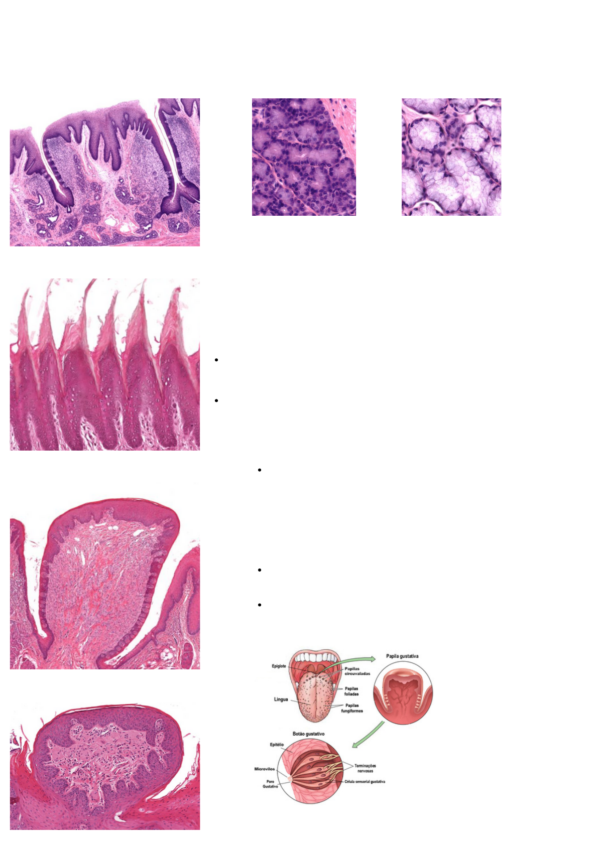 Laboratório 5 - 3º estação Histologia da língua - papilas linguais Papilas folhadas Glândulas serosas: secretam um fluido que contém enzimas digestivas. Glândulas mucosas: secretam um líquido que contém muco (glicoproteínas conhecidas como mucinas). Papilas filiformes Essas papilas são mecânicas e proporcionam fricção para segurar o alimento durante a mastigação. Não contém papilas gustativas . Linhas paralelas de projeções pontiagudas levemente queratinizadas que cobrem a maior parte da superfície anterior da língua. Papilas circunvaladas Papilas fungiformes A superfície apical microvilosa das células epiteliais gustativas interage com os sabores através de receptores de proteínas ou canais iônicos. A partir desse ponto, os estímulos químicos são transduzidos através da célula sensitiva. O impulso elétrico é conduzido até o tronco encefálico, através das fibras nervosas gustativas aferentes. Qual a função das papilas linguais? Perguntas: Filiforme. Qual papila gustativa não apresenta botões gustativos? células sensoriais, células de sustentação e células basais. Quais os tipos de células estão presentes nos botões gustativos? Como as papilas estão distribuídas na língua?