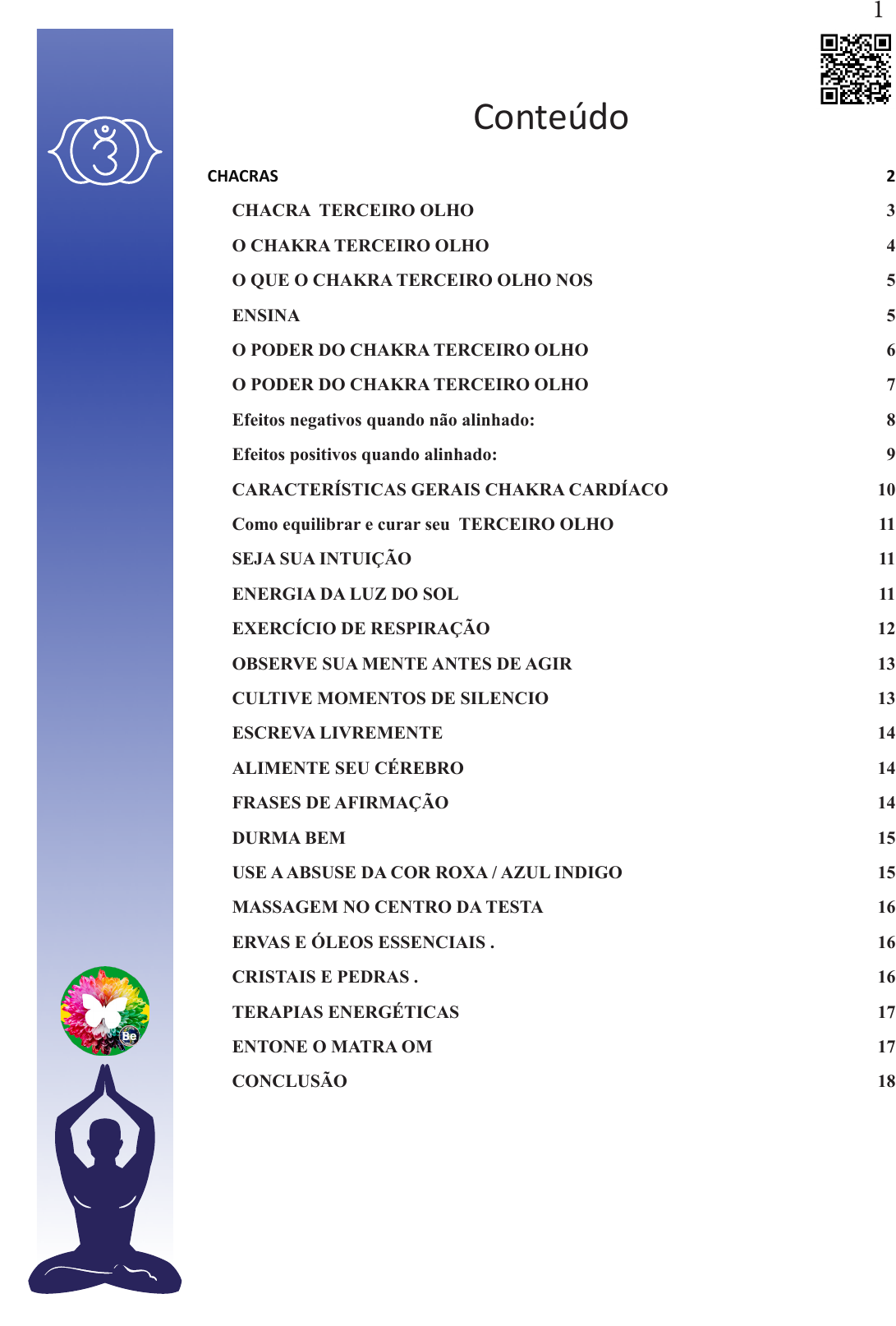 1 Conteúdo CHACRAS 2 CHACRA TERCEIRO OLHO 3 O CHAKRA TERCEIRO OLHO 4 O QUE O CHAKRA TERCEIRO OLHO NOS 5 ENSINA 5 O PODER DO CHAKRA TERCEIRO OLHO 6 O PODER DO CHAKRA TERCEIRO OLHO 7 Efeitos negativos quando não alinhado: 8 Efeitos positivos quando alinhado: 9 CARACTERÍSTICAS GERAIS CHAKRA CARDÍACO 10 Como equilibrar e curar seu TERCEIRO OLHO 11 SEJA SUA INTUIÇÃO 11 ENERGIA DA LUZ DO SOL 11 EXERCÍCIO DE RESPIRAÇÃO 12 OBSERVE SUA MENTE ANTES DE AGIR 13 CULTIVE MOMENTOS DE SILENCIO 13 ESCREVA LIVREMENTE 14 ALIMENTE SEU CÉREBRO 14 FRASES DE AFIRMAÇÃO 14 DURMA BEM 15 USE A ABSUSE DA COR ROXA / AZUL INDIGO 15 MASSAGEM NO CENTRO DA TESTA 16 ERVAS E ÓLEOS ESSENCIAIS . 16 CRISTAIS E PEDRAS . 16 TERAPIAS ENERGÉTICAS 17 ENTONE O MATRA OM 17 CONCLUSÃO 18 Conteúdo licenciado para Andressa Freitas dos Reis Nascimento - 100.686.297-88 2 CHACRAS Chacras são centros de energia conectados ao longo da coluna, que servem para absorver a energia vital, distribuí-la pelo corpo, mente e espírito, para então liberá-la para o exterior. Eles podem se manifestar em aspectos mentais, físicos ou emocionais. São a pura vibração e frequência. Podem ser vistosos como vortex energéticos espalhados pelo corpo. Cada um com sua própria função e trabalho específico no funcionamento do todo. São nossos órgãos energéticos, fundamentais para a sobrevivência e existência humana. Uma existência próspera, de bem-estar, com saúde e qualidade de vida está diretamente relacionada à boa qualidade e fluxo dessas energias, em cada ser humano. Os chacras podem estar abertos ou fechados. Quando estão equilibrados, a energia flui livremente, porém, se estão fechados, a energia é incapaz de circular e podem surgir desequilíbrios. Para revigorar e equilibrar os chacras, cada um deles possuem uma pedra ou cristal específico para estimular o poder de auto-cura, pelas vibrações emitidas. A seguir, veremos cada um deles, organizados ao longo de uma hierarquia evo- lutiva das necessidades humanas, começando com o instinto de sobrevivência e evoluindo em direção à transformação espiritual. Conteúdo licenciado para Andressa Freitas dos Reis Nascimento - 100.686.297-88 3 CHACRA TERCEIRO OLHO O Ajna, que significa centro de controle em sânscrito, é o sexto chakra e tem seu nome mais conhecido como terceiro olho, está fisicamente atrelado à glândula hipófise, aos olhos e nariz, e é o responsável pelo controle de todos os chakras. Dentre os 7 chakras principais, ele é o que envia todos os nossos comandos ao corpo. Por associar-se ao lobo frontal, sua energia influencia diretamente os nossos raciocínios, a capacidade de absorver informações e aprendizados e claro, a intuição. É através deste chakra que somos representados em nosso corpo espiritual, é um ponto fácil de ser equilibrado, pois ele é ativado praticamente a todo momento através da nossa visão, ou seja, os nossos olhos o alimenta continuamente. Sua representação possui somente duas pétalas, porque ele é o símbolo da dualidade e governa os dois lados do cérebro. Este chacra nos permite forta- lecer a nossa intuição, o que nos passará maior segurança em nossas deci- sões e avaliações sobre assuntos da vida. Nossas emoções residem fisicamente em nossos corpos. Em um nível sutil, nossos corpos se comunicam com as energias ao nosso redor e certos impul- sos energéticos geralmente se relacionam diretamente com uma determinada parte do corpo e chacra que está enfraquecido ou desequilibrado. Cada chakra representa uma lição de vida espiritual ou desafio para nos ajudar a obter uma compreensão mais profunda de nosso poder pessoal e espiritual. Isso, por sua vez, nos ajuda a aprender como superar obstáculos, liberar bloqueios emocionais e trilhar o caminho em direção à consciência es- piritual. Conteúdo licenciado para Andressa Freitas dos Reis Nascimento - 100.686.297-88 4 O CHAKRA TERCEIRO OLHO O Chacra do Terceiro Olho é Intuitivo Este é o chakra da intuição, sabedoria e nosso sexto sentido. Nas filosofias orien- tais, é conhecido como nosso ‘terceiro olho’ e o centro espiritual, que interage com a mente racional a fim de aprofundar nosso insight intuitivo para ver além do véu da ilusão que é chamado de “Maya”. O Chacra do Terceiro Olho é uma Mente Aberta Abrir a mente e discriminar pensamentos motivados por força, medo e ilusão são desafios do Sexto Chakra. É aprender a desenvolver uma mente impessoal e desapegar-se das ilusões físicas e mentais. Podemos transcender nossos pensamentos, preocupações e medos para conhecer nossas almas verdadeiramente de dentro. O terceiro olho contém uma combinação única de fatos, medos, experiências pessoais e memórias que estão continuamente ativas na energia do corpo men- tal. O Chacra do Terceiro Olho é a Verdade Decifrar o que acreditamos ser verdade e o que é genuinamente verdadeiro está no centro deste chakra. Às vezes, uma memória negativa pode se manifestar como verdade para um indivíduo mais tarde na vida. Por exemplo, se uma pessoa é levada a acreditar que é feia durante toda a vida, isso pode se manifestar como um fato dentro de seus padrões de pensamento e, como resultado, ela desenvolverá dismorfia corporal e baixa autoestima. O Chacra do Terceiro Olho é a Base da Sabedoria O simbolismo do Chacra do Terceiro Olho está adquirindo sabedoria além de nossas percepções autoinfligidas. Está quebrando estereótipos, vendo além da ilusão da mídia e alcançando o distanciamento das realidades sociais. O poder do Chakra do Terceiro Olho está testemunhando sua liberdade além dos reinos da ‘ilusão realista’. Em última análise, nada o está prendendo - é apenas a sua mente que tem poder sobre você e se você pode controlar a mente, você pode ascender quaisquer limitações que você tem atualmente. Conteúdo licenciado para Andressa Freitas dos Reis Nascimento - 100.686.297-88 5 O QUE O CHAKRA TERCEI