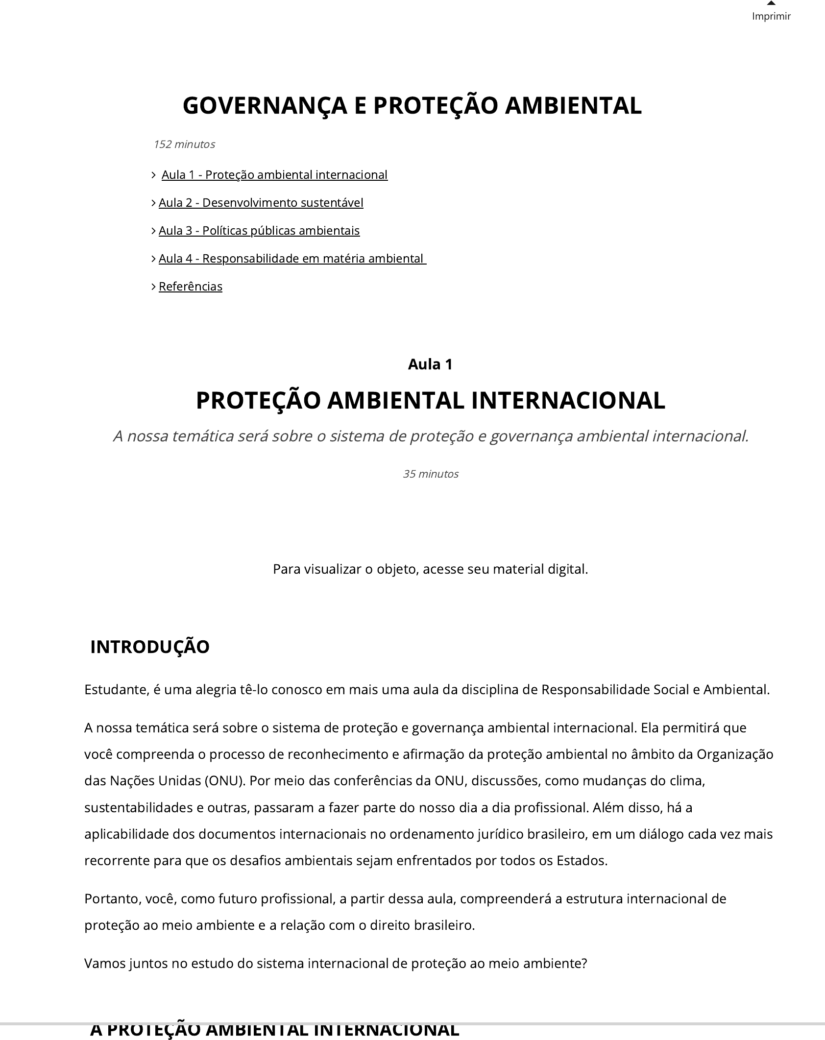 30/08/2023, 15:37 wlldd_231_u2_res_soc_amb https://www.colaboraread.com.br/integracaoAlgetec/index?usuarioEmail=geilmaarmil2019%40gmail.com&usuarioNome=GEILMA+AZEVEDO+DA+SILVA&disciplinaDescricao=&atividadeId=3658393&atividadeDesc… 1/30 Imprimir INTRODUÇÃO Estudante, é uma alegria tê-lo conosco em mais uma aula da disciplina de Responsabilidade Social e Ambiental. A nossa temática será sobre o sistema de proteção e governança ambiental internacional. Ela permitirá que você compreenda o processo de reconhecimento e a�rmação da proteção ambiental no âmbito da Organização das Nações Unidas (ONU). Por meio das conferências da ONU, discussões, como mudanças do clima, sustentabilidades e outras, passaram a fazer parte do nosso dia a dia pro�ssional. Além disso, há a aplicabilidade dos documentos internacionais no ordenamento jurídico brasileiro, em um diálogo cada vez mais recorrente para que os desa�os ambientais sejam enfrentados por todos os Estados. Portanto, você, como futuro pro�ssional, a partir dessa aula, compreenderá a estrutura internacional de proteção ao meio ambiente e a relação com o direito brasileiro. Vamos juntos no estudo do sistema internacional de proteção ao meio ambiente? A PROTEÇÃO AMBIENTAL INTERNACIONAL Para visualizar o objeto, acesse seu material digital. Aula 1 PROTEÇÃO AMBIENTAL INTERNACIONAL A nossa temática será sobre o sistema de proteção e governança ambiental internacional. 35 minutos GOVERNANÇA E PROTEÇÃO AMBIENTAL Aula 1 - Proteção ambiental internacional Aula 2 - Desenvolvimento sustentável Aula 3 - Políticas públicas ambientais Aula 4 - Responsabilidade em matéria ambiental Referências 152 minutos 30/08/2023, 15:37 wlldd_231_u2_res_soc_amb https://www.colaboraread.com.br/integracaoAlgetec/index?usuarioEmail=geilmaarmil2019%40gmail.com&usuarioNome=GEILMA+AZEVEDO+DA+SILVA&disciplinaDescricao=&atividadeId=3658393&atividadeDesc… 2/30 O arcabouço da proteção e da governança ambiental tem os seus aspectos mais importantes nas instâncias internacionais, pois as questões ambientais não estão limitadas às de�nições de fronteiras entre países, o u seja, os desa�os são transfronteiriços ou transnacionais e discuti-los e enfrentá-los exige a cooperação comum entre os Estados. As deliberações são estabelecidas nos arranjos das organizações supranacionais. A temática ambiental entrou na agenda global na década de 1960, a partir das preocupações com os efeitos da explosão demográ�ca mundial e do aumento da poluição. Em um período de forte expansão do comércio e das atividades econômicas, houve a constatação dos limites desse crescimento, que se tornou um assunto de debates entre pesquisadores e atores das instâncias internacionais. O sistema internacional contemporâneo é relativamente recente, com origem no �nal da Segunda Guerra Mundial, com a Conferência de São Francisco, de 1945, que aprovou a Carta de São Francisco, de criação da Organização das Nações Unidas (ONU). O propósito primordial da ONU é o de garantir a paz mundial, mas também o de “conseguir uma cooperação internacional para resolver os problemas internacionais de caráter econômico, social, cultural ou humanitário [...]” e de “ser um centro destinado a harmonizar a ação das nações para a consecução desses objetivos comuns” (BRASIL, 1945, [s. p.]). Nota-se, pois, que a ONU se tornou, assim, o centro das discussões globais, atuando por meio de seus conselhos – Segurança; Econômico e Social; outros –, de suas comissões – Direitos Humanos (que desde 2006 se transformou em Conselho) e outras – e de suas agências especializadas – Organização das Nações Unidas para a Educação, a Ciência e a Cultura (Unesco); Organização das Nações Unidas para a Alimentação e Agricultura (FAO); Fundo Monetário Internacional (FMI). Além da ONU, organizações foram criadas em âmbito regional, como a Organização dos Estados Americanos (OEA), em 1948, pelos países das Américas. Na Europa, foram criados o Conselho da Europa, em 1949, e a Comissão Europeia, em 1951. Esses compõem, hoje, o arcabouço da União Europeia, a qual, por sua vez, foi criada em 1993. No que se refere ao direito internacional, em que os principais sujeitos são os Estados, é preciso destacar o papel da ONU, que se tornou os lócus de formação de um arcabouço de normas e instituições em várias áreas, como direitos humanos, educação, cultura e meio ambiente. Com essa perspectiva, a discussão entre Estados é fundamental para a formação de normas ambientais internacionais, com o objetivo comum de proteção ao meio ambiente em todas as suas dimensões. Vários problemas ambientais são de caráter transnacional e exigem ações multilaterais e cooperativas (BURSZTYN; BURSZTYN, 2012). A formalização da proteção ambiental no âmbito internacional se dá essencialmente por meio de dois tipos de atos: tratados e declarações. Os tratados são �rmados entre Estados e podem ser bilaterais (dois Estados) ou multilaterais (vários Estados). Um tratado possui força jurídica vinculante, assim, é chamado de hard law. Os tratados podem ser globais, quando estabelecidos em organizações de abrangência mundial (por exemplo, ONU), ou regionais, quando �rmados por países de uma determinada região do mundo ou em uma organização delimitada geogra�camente (por exemplo, OEA). Os tratados de direito ambiental frequentemente recebem a denominação de convenção, porque costumam ser oriundos de conferências especí�cas para debater temáticas ambientais. Já as declarações, no direito ambiental, não têm força jurídica vinculante, são chamadas 30/08/2023, 15:37 wlldd_231_u2_res_soc_amb https://www.colaboraread.com.br/integracaoAlgetec/index?usuarioEmail=geilmaarmil2019%40gmail.com&usuarioNome=GEILMA+AZEVEDO+DA+SILVA&disciplinaDescricao=&atividadeId=3658393&atividad