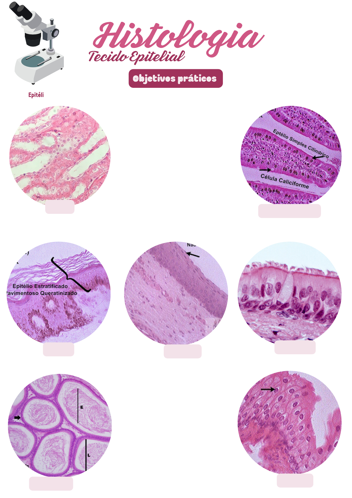 Histologia Tecido Epitelial Objetivos práticos Epitélio simples cúbico Epitélio simples Prismático(colunar ou cilindrico) Intestino Delgado (HE)Rim (HE) Epitélio pseudoestratificado colunar ciliado com células caliciformes Epitélio estratificado pavimentoso não queratinizado Epitélio estratificado pavimentos queratinizado Esôfago(HE) epitélio pseudoestratificado cilíndrico com estereocílios epitélio de transição Bexiga (HE) Traqueia (HE) Epidídimo (HE) Pele (HE) Monitora: Luana Nepomuceno