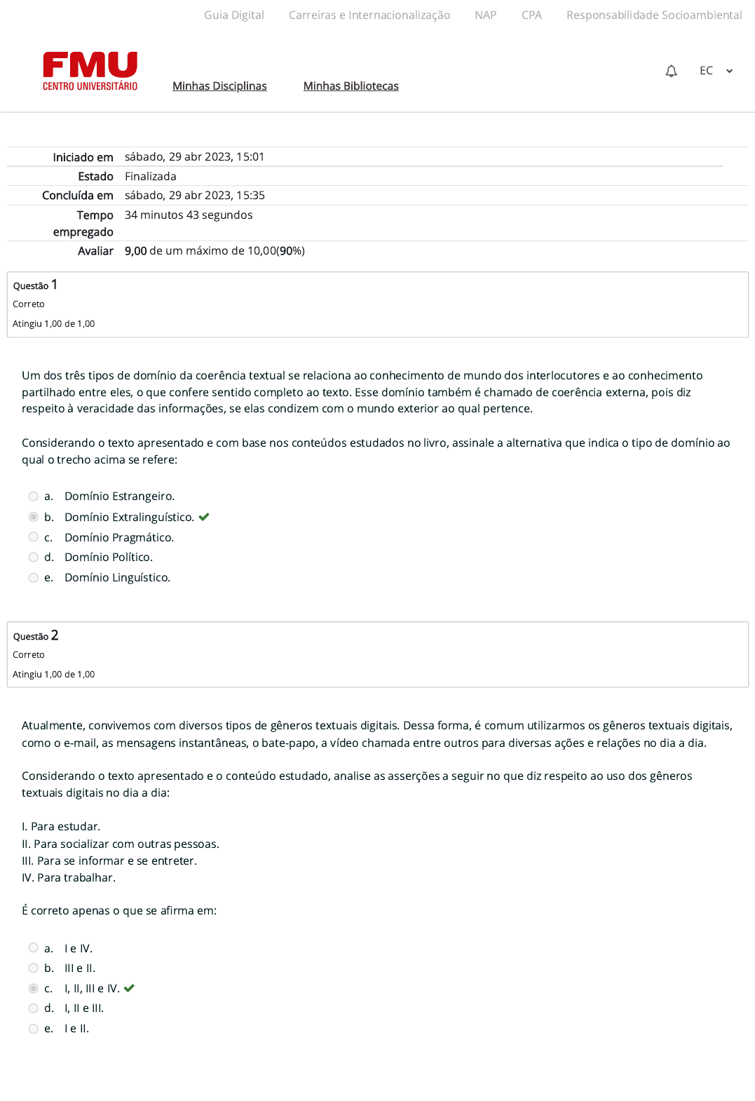 30/05/2023, 15:49 Atividade 2 (A2): Revisão da tentativa https://ambienteacademico.com.br/mod/quiz/review.php?attempt=2098393&cmid=780958 1/5 Iniciado em sábado, 29 abr 2023, 15:01 Estado Finalizada Concluída em sábado, 29 abr 2023, 15:35 Tempo empregado 34 minutos 43 segundos Avaliar 9,00 de um máximo de 10,00(90%) Questão 1 Correto Atingiu 1,00 de 1,00 Questão 2 Correto Atingiu 1,00 de 1,00 Um dos três tipos de domínio da coerência textual se relaciona ao conhecimento de mundo dos interlocutores e ao conhecimento partilhado entre eles, o que confere sentido completo ao texto. Esse domínio também é chamado de coerência externa, pois diz respeito à veracidade das informações, se elas condizem com o mundo exterior ao qual pertence. Considerando o texto apresentado e com base nos conteúdos estudados no livro, assinale a alternativa que indica o tipo de domínio ao qual o trecho acima se refere: a. Domínio Estrangeiro. b. Domínio Extralinguístico. c. Domínio Pragmático. d. Domínio Político. e. Domínio Linguístico. Atualmente, convivemos com diversos tipos de gêneros textuais digitais. Dessa forma, é comum utilizarmos os gêneros textuais digitais, como o e-mail, as mensagens instantâneas, o bate-papo, a vídeo chamada entre outros para diversas ações e relações no dia a dia. Considerando o texto apresentado e o conteúdo estudado, analise as asserções a seguir no que diz respeito ao uso dos gêneros textuais digitais no dia a dia: I. Para estudar. II. Para socializar com outras pessoas. III. Para se informar e se entreter. IV. Para trabalhar. É correto apenas o que se a�rma em: a. I e IV. b. III e II. c. I, II, III e IV. d. I, II e III. e. I e II. Guia Digital Carreiras e Internacionalização NAP CPA Responsabilidade Socioambiental Minhas Disciplinas Minhas Bibliotecas EC https://codely-fmu-content.s3.amazonaws.com/Moodle/GuiaDigital/Guia+digital/index.html https://carreiras.fmu.br/ https://codely-fmu-content.s3.amazonaws.com/Moodle/NAP/inicial/nap/fmu/index.html https://codely-fmu-content.s3.amazonaws.com/Moodle/CPA/landing_CPA/index.html https://portal.fmu.br/sustentabilidade https://ambienteacademico.com.br/ https://ambienteacademico.com.br/ https://ambienteacademico.com.br/course/view.php?id=236 30/05/2023, 15:49 Atividade 2 (A2): Revisão da tentativa https://ambienteacademico.com.br/mod/quiz/review.php?attempt=2098393&cmid=780958 2/5 Questão 3 Correto Atingiu 1,00 de 1,00 Questão 4 Incorreto Atingiu 0,00 de 1,00 Com a chegada e a evolução das tecnologias digitais propiciaram o surgimento de novas formas de construir os textos, a partir da utilização de elementos visuais e sonoros além da escrita, o que não é possível no texto impresso. Considerando o texto apresentado e com base nos conteúdos estudados no livro, assinale a alternativa que apresenta somente exemplos de gêneros textuais digitais: a. Blog, manual de instruções, fórum, mensagens instantâneas e homepage. b. E-mail, blog, mensagens instantâneas, fórum e homepage. c. Blog, e-mail, outdoor, mensagens instantâneas e fórum. d. E-mail, blog, jornal impresso, fórum e homepage. e. E-mail, blog, mensagens instantâneas, revista impressa e homepage. Em um dos três tipos de domínio da coerência textual é possível perceber como características o uso coerente de recursos gramaticais e a seleção adequada de palavras e expressões, a �m de esclarecer sobre o ocorrido, não havendo contradição em nenhum momento. Neste caso, o texto progride com novas informações sendo acrescentadas, o que contribuiu para a progressão textual e, consequentemente, para a coerência textual. Considerando o texto apresentado e com base nos conteúdos estudados no livro, assinale a alternativa que indica o tipo de domínio ao qual o trecho acima se refere: a. Domínio Extralinguístico. b. Domínio Pragmático. c. Domínio Político. d. Domínio Linguístico. e. Domínio Estrangeiro. Guia Digital Carreiras e Internacionalização NAP CPA Responsabilidade Socioambiental Minhas Disciplinas Minhas Bibliotecas EC https://codely-fmu-content.s3.amazonaws.com/Moodle/GuiaDigital/Guia+digital/index.html https://carreiras.fmu.br/ https://codely-fmu-content.s3.amazonaws.com/Moodle/NAP/inicial/nap/fmu/index.html https://codely-fmu-content.s3.amazonaws.com/Moodle/CPA/landing_CPA/index.html https://portal.fmu.br/sustentabilidade https://ambienteacademico.com.br/ https://ambienteacademico.com.br/ https://ambienteacademico.com.br/course/view.php?id=236 30/05/2023, 15:49 Atividade 2 (A2): Revisão da tentativa https://ambienteacademico.com.br/mod/quiz/review.php?attempt=2098393&cmid=780958 3/5 Questão 5 Correto Atingiu 1,00 de 1,00 Questão 6 Correto Atingiu 1,00 de 1,00 Sabemos que de acordo com Charroles (1988) e Fonseca (1992), os princípios básicos da coerência são a continuidade, a progressão, a não contradição e a articulação. Todos estes princípios são fundamentais para garantir a coerência de um texto. Fonte: CHARROLES, M. Introdução aos problemas da coerência dos textos. In: GALVES, C.; ORLANDI, E. P.; OTONI, P. (Orgs.). O texto: escrita e leitura. São Paulo: Pontes, 1988, p. 39-85. Fonte: FONSECA, J. Linguística e texto/discurso: teoria, descrição, aplicação. Lisboa: Ministério da Educação, Instituto de Cultura e Língua Portuguesa, 1992. Considerando o texto apresentado e o conteúdo estudado, analise as asserções a seguir no que diz respeito aos elementos do princípio da articulação: I. Encadeamento lógico. II. Organização das informações. III. Retomada de informações relevantes. IV. Acréscimo de novas informações. É correto apenas o que se a�rma em: a. II, III e IV. b. I e II. c. II e III. d. I, III e IV. e. I e IV. Quando falamos em hipertextos, facilmente percebemos a presença da multimodalidade nos gêneros digitais. Um exemplo disso são os emoticons, ícones utilizados em conversas online para transmitir a emoção dos indivíduos. Consider
