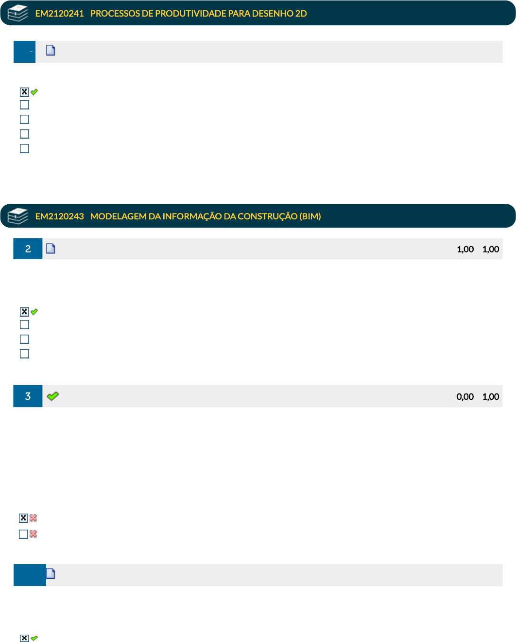 12/09/2023, 18:33 EPS 12/09/2023, 18:33 EPS 12/09/2023, 18:33 EPS EM2120241 - PROCESSOS DE PRODUTIVIDADE PARA DESENHO 2D 1. Ref.: 5843113 Pontos: 1,00 / 1,00 Em relação ao comando Hatch, assinale a alternativa incorreta: Não permite ser editado depois de colocado no desenho. Devem ser colocados elementos com escala compatível com a impressão. Deve ser usado com moderação para não carregar o desenho. Devemos sempre modi car a escala da hachura, e não a escala do desenho. É interessante colocar em layer separada, caso seja necessário congelar a layer por algum motivo. MODELAGEM DA INFORMAÇÃO DA CONSTRUÇÃO (BIM) - EM2120243 2 . Ref.: 5437962 Pontos: 1 , 00 / 1 , 00 A respeito dos forros feitos no Revit, pode-se dizer que: · Só podem ter o gesso como material. Eles servem como hospedeiros para componentes. São completamente desnecessários em qualquer situação. Eles não permitem edição de altura. São feitos na planta de piso. 3 . Ref.: 5437952 Pontos: 0 , 00 / 1 , 00 Ano: 2019 Banca: IADES Órgão: AL-GO Quanto às ferramentas úteis ao trabalho do arquiteto e urbanista em projetos de arquitetura e urbanismo, é correto a rmar que são ferramentas: · De edição de fotogra a (Raster) o Photoshop, o GIMP, o LightRoom e o Adobe InDesign. · Direcionados para projetos de infraestrutura o Infraworks, o Civil 3D e o AutoCAD Architecture. · De sistemas de informação geográ ca o ArcGIS, o VectorWorks, o Quantum GIS e o AutoCAD MAP 3D. De simulação/modelagem baseada em agentes (ABM) o NETLOGO, o MESA, o SWARM e o Volare. Centrais em ecossistemas BIM o Revit, o AECOSim, o ALLPLAN, o Civil 3D e o Catia. 4. Ref.: 5452952 Pontos: 1,00 / 1,00 No Revit, existem algumas opções prede nidas de elementos que podem ser utilizados. No entanto, é comum que esses elementos não atendam à necessidade do projeto. Dessa forma, o Revit permite a criação/alteração de elementos. Para criar ou alterar um elemento no Revit, devemos seguir os seguintes passos: Menu propriedades -> editar tipo -> clica-se no botão duplicar e de ne-se um nome para o novo elemento. Em seguida alteram-se suas propriedades conforme necessário. · Menu con gurações -> editar tipo -> clica-se no botão duplicar e de ne-se um nome para o novo elemento. Em seguida alteram-se suas propriedades conforme necessário. · Menu ribbon -> editar tipo -> clica-se no botão duplicar e de ne-se um nome para o novo elemento. Em seguida alteram-se suas propriedades conforme necessário. · Menu acesso rápido -> editar tipo -> clica-se no botão duplicar e de ne-se um nome para o novo elemento. Em seguida alteram-se suas propriedades conforme necessário. · Menu navegador de projeto -> editar tipo -> clica-se no botão duplicar e de ne-se um nome para o novo elemento. Em seguida alteram-se suas propriedades conforme necessário. ENSINEME : DESENHO TÉCNICO E PROCEDIMENTOS BÁSICOS DE DESENHO 5. Ref.: 3993216 Pontos: 1,00 / 1,00 Um ângulo externo de um triângulo ABC, em graus, mede 2x, conforme a gura. A medida do ângulo α é igual a: · 23° 21° 24° 22° 25° ENSINEME : REPRESENTAÇÃO BIDIMENSIONAL DE ELEMENTOS SÓLIDOS 6. Ref.: 3993108 Pontos: 1,00 / 1,00 Sobre a projeção do objeto mostrada na gura abaixo podemos a rmar, EXCETO: o centro de projeção é um ponto visualmente identi cado, pois está bem próximo do objeto as linhas projetantes são paralelas entre si e perpendiculares ao plano de projeção a projeção do objeto no plano é de mesma dimensão do que o objeto real (verdadeira grandeza) a superfície gerada pelas linhas projetantes perpendiculares ao plano de projeção é cilíndrica ortogonal · a fonte luminosa puntiforme é posicionada no in nito, sobre o centro do objeto 7. Ref.: 3993127 Pontos: 1,00 / 1,00 Sobre a projeção do objeto mostrada na gura abaixo podemos a rmar, EXCETO: · a projeção do objeto no plano está em verdadeira grandeza o centro de projeção (O), de onde saem as linhas projetantes, está a uma determinada distância do objeto, portanto, designamos como centro de projeção impróprio as linhas projetantes são paralelas entre si, partindo do centro de projeção (O), que está posicionado no centro do objeto a superfície gerada pelas linhas projetantes é cilíndrica se afastarmos (para cima) ou aproximarmos (para baixo) o centro de projeção (O) do objeto, a projeção do objeto irá variar de tamanho ENSINEME : REPRESENTAÇÃO GRÁFICA DE PEÇAS MECÂNICAS SIMPLES 8. Ref.: 4095376 Pontos: 1,00 / 1,00 Analise as sentenças a seguir referentes aos conceitos de desenho isométrico e de suas vistas ortográ cas (projeção no 1º diedro): I. Qualquer reta paralela a um eixo isométrico é chamada linha não isométrica, portanto as perspectivas das arestasde um cubo e as linhas a elas paralelas, são linhas isométricas. II. As perspectivas das faces do cubo, e outras que forem a elas paralelas, são chamadas faces isométricas, portantoas faces isométricas são paralelas a um dos planos do triedro. III. As linhas não paralelas aos eixos isométricos são linhas isométricas, portanto as arestas de um objeto nãoparalelas aos eixos do triedro têm como perspectiva linhas isométricas. IV. Linhas isométricas e não isométricas não podem ser representadas numa mesma vista ortográ ca ou mesmo emperspectiva. Está(ão) correta(s), apenas: · I e IV · II e III · I e II II II e IV 9. Ref.: 4098263 Pontos: 1,00 / 1,00 São condições apresentadas na NBR 8402, EXCETO: · Para facilitar a escrita, deve ser aplicada a mesma largura de linha para letras maiúsculas e minúsculas No caso de larguras de linha diferentes, a distância deve corresponder à da linha mais estreita Os caracteres devem ser claramente distinguíveis entre si, para evitar qualquer troca ou algum desvio mínimo da forma ideal · As principais exigências na escrita em desenhos técnicos são: legibilidade, uniformidade e adequação à micro lmagem e a outros processos de reprodução · A