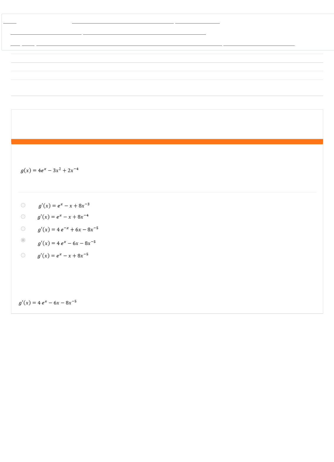 Iniciado em terça, 12 set 2023, 22:56 Estado Finalizada Concluída em quarta, 13 set 2023, 00:04 Tempo empregado 1 hora 7 minutos Avaliar 6,00 de um máximo de 6,00(100%) Questão 1 Correto Atingiu 0,60 de 0,60 Marque a alternativa que corresponde a derivada da função. a. b. c. d. e. Sua resposta está correta. A resposta correta é: Painel / Minhas Disciplinas / BACHARELADO EM ENGENHARIA DE PRODUÇÃO-3123- CÁLCULO / PROVA CURRICULAR - REALIZAÇÃO DIA 11/09/2023 a 12/09/2023 - VALOR 6,0 PONTOS / CLIQUE AQUI PARA REALIZAR A PROVA CURRICULAR - DIA 11/09/2023 a 12/09/2023- VALOR 6,0 PONTOS - 2ª OPORTUNIDADE https://www.eadunifatecie.com.br/course/view.php?id=18190 https://www.eadunifatecie.com.br/my/ https://www.eadunifatecie.com.br/course/view.php?id=18190 https://www.eadunifatecie.com.br/course/view.php?id=18190#section-12 https://www.eadunifatecie.com.br/mod/quiz/view.php?id=679016 Questão 2 Correto Atingiu 0,60 de 0,60 Uma função é uma relação que a cada elemento de A associa um único elemento de B, e é indicada por f : A→B. A relação entre os conjuntos A e B é dada através de uma regra de associação expressa na forma y = f (x). Podemos representar funções por meio de equações, diagramas ou pelos conjuntos numéricos. Considere os diagramas (f, g, h, t, d, e, j, k) descrevendo relações f: A→B. Com base nas informações, assinale a alternativa correta. a. Apenas f, t, d são funções b. Todas as relações são funções c. As relações d, e, k não são funções d. Nenhuma das relações é função e. Nenhuma das alternativas está correta Sua resposta está correta. A resposta correta é: As relações d, e, k não são funções Questão 3 Correto Atingiu 0,60 de 0,60 Questão 4 Correto Atingiu 0,60 de 0,60 Com base do que foi abordado em integrais de funções bem definidas, como funções logarítmicas, determine a integral indefinida e marque a alternativa correta. a. b. c. d. e. Sua resposta está correta. A resposta correta é: Marque a alternativa que seja a derivada da função: a. b. c. d. e. Sua resposta está correta. A resposta correta é: Questão 5 Correto Atingiu 0,60 de 0,60 Questão 6 Correto Atingiu 0,60 de 0,60 Dada a função: Marque a alternativa que corresponde a derivada da função. a. b. c. d. e. Sua resposta está correta. A resposta correta é: Sabendo que o e que o o produto entre os limites é: a. 4 b. Nenhuma das alternativas c. d. e. Sua resposta está correta. A resposta correta é: Questão 7 Correto Atingiu 0,60 de 0,60 Questão 8 Correto Atingiu 0,60 de 0,60 Em um sítio há 12 árvores. Cada árvore possui 12 galhos e em cada galho tem 12 mangas. Quantas mangas existem no sítio? Utilize as propriedades de potência vista em seu material didático. a. 144 b. Nenhuma das alternativas c. 1224 d. 1728 e. 1564 Sua resposta está correta. A resposta correta é: 1728 Fornecida a função f(x) = 3x -1, pode-se dizer que: I – É uma função linear, com coeficiente linear igual a -1 e coeficiente angular igual a +3. II – É uma função crescente. III – Quando x = 10 o valor de f(x)=29. É(são) correta(s) as afirmativas: a. I, II e III b. Apenas II c. Nenhuma das afirmativas d. Apenas I e. II e III Sua resposta está correta. A resposta correta é: I, II e III Questão 9 Correto Atingiu 0,60 de 0,60 Questão 10 Correto Atingiu 0,60 de 0,60 Fazendo a distributiva do integrando, marque a alternativa com o resultado da integral. a. b. c. d. e. Sua resposta está correta. A resposta correta é: Em algumas funções, ao calcular o limite, chega-se a um resultado que pode ser considerado matematicamente indeterminado. Quando isso acontece, diz-se que ocorreu uma indeterminação no cálculo do limite. Isso não significa que é impossível resolver o limite. O que é preciso fazer é usar alguma manipulação matemática para escrever a função de outra maneira que seja possível encontrar o valor do limite. Existem quatro principais técnicas que são comumente usadas, são elas: a. Nenhuma das alternativas b. Pitágoras; Bhaskara; regra de três simples; regra de três composta c. Fatoração usando o algoritmo de Briot-Rufini; racionalização da expressão; mudança de variável; regra de L´Hospital d. Fatoração usando o algoritmo de Briot-Rufini; Progressão geométrica; mudança de variável; regra de L´Hospital e. Binômio de Newton; racionalização da expressão; mudança de variável; regra de L´Hospital Sua resposta está correta. A resposta correta é: Fatoração usando o algoritmo de Briot-Rufini; racionalização da expressão; mudança de variável; regra de L´Hospital ◄ ENQUETE DE SATISFAÇÃO - EAD UNIFATECIE Seguir para... CLIQUE AQUI PARA REALIZAR A PROVA SUBSTITUTIVA - DIA 15/09/2023 - VALOR 6,0 PONTOS ► https://www.eadunifatecie.com.br/mod/feedback/view.php?id=679014&forceview=1 https://www.eadunifatecie.com.br/mod/quiz/view.php?id=679017&forceview=1