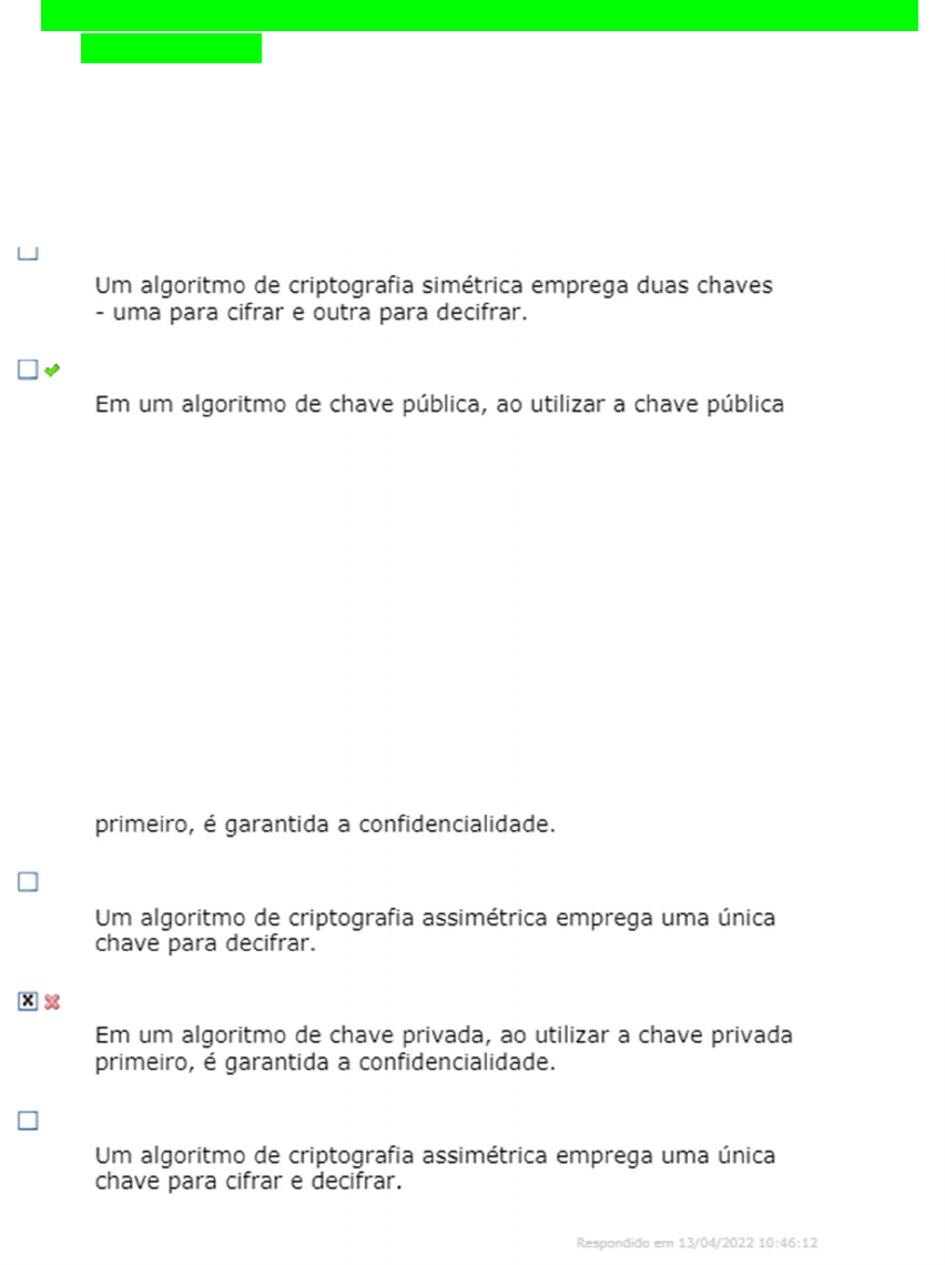 A criptografia é um recurso utilizado desde tempos antigos, e a Cifra de César é um dos algoritmos mais conhecidos. Acerca das técnicas decriptografia, assinale a alternativa correta: Um algoritmo de criptografia simétrica emprega duas chaves - uma para cifrar e outra para decifrar. Em um algoritmo de chave pública, ao utilizar a chave pública primeiro, é garantida a confidencialidade. Um algoritmo de criptografia assimétrica emprega uma única chave para decifrar. Em um algoritmo de chave privada, ao utilizar a chave privada primeiro, é garantida a confidencialidade. Um algoritmo de criptografia assimétrica emprega uma única chave para cifrar e decifrar.
