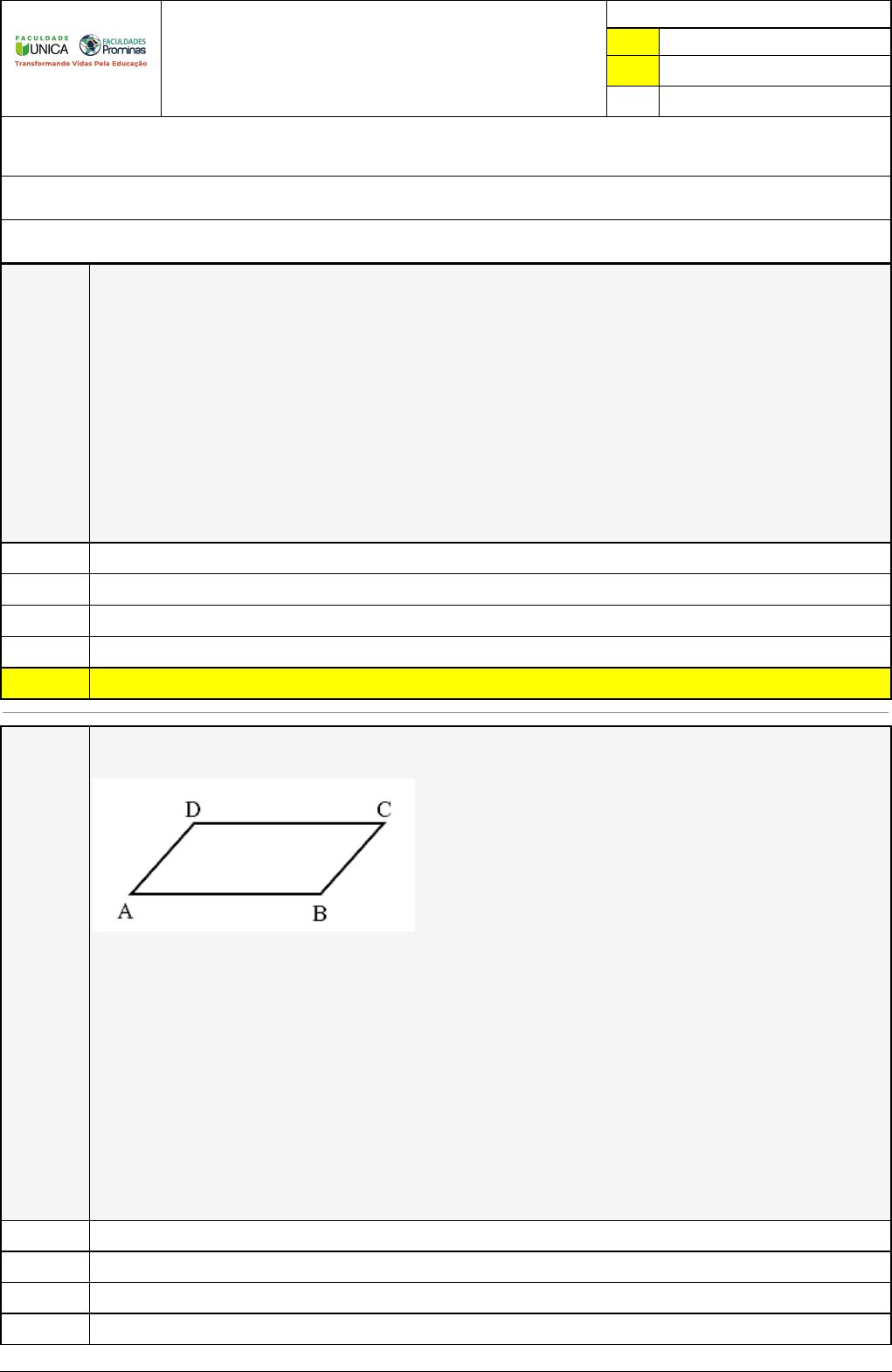 Pincel Atômico - 12/09/2023 18:26:31 1/4 TIAGO GOMES PINTO Exercício Caminho do Conhecimento - Etapa 4 (21438) Atividade finalizada em 07/09/2023 22:57:11 (1174278 / 1) LEGENDA Resposta correta na questão # Resposta correta - Questão Anulada X Resposta selecionada pelo Aluno Disciplina: GEOMETRIA: FUNDAMENTOS E MÉTODOS DE ENSINO E PRÁTICAS PEDAGÓGICAS [835319] - Avaliação com 8 questões, com o peso total de 1,67 pontos [capítulos - 2] Turma: Segunda Graduação: Segunda Graduação 6 meses - Licenciatura em Matemática - Grupo: FPD-FEV2022 - SGegu0A300323 [88028] Aluno(a): 91452060 - TIAGO GOMES PINTO - Respondeu 8 questões corretas, obtendo um total de 1,67 pontos como nota [359903_1528 98] Questão 001 (CESGRANRIO/2016/Petrobras - adaptada) Considere a construção geométrica descrita a seguir. Com alguma inclinação sobre o segmento de reta AB dado, traça-se uma semirreta auxiliar s, com origem num dos extremos A ou B. Sobre esse segmento auxiliar, e a partir da origem escolhida, marcam-se comprimentos iguais, com uma abertura qualquer de compasso, de acordo com o número (n) de divisões desejadas, achando- se os pontos 1, 2, 3, ... , n. Une-se o último ponto marcado com o outro extremo do segmento de reta AB e traçam-se paralelas a essa linha que passam pelos pontos marcados na semirreta auxiliar s. Após realizar esse procedimento descrito, obtém-se a construção geométrica denominada de: Triângulo equilátero com lado igual a AB. Paralela à reta AB. Perpendicular à reta AB. Hexágono de lado igual a AB. X Divisão do segmento AB. [359905_1524 87] Questão 002 (UFRJ-NCE/2017/ ELETROBRAS/ Administração Geral – adaptada) Considere o paralelogramo ABCD representado na figura abaixo: Considere as retas: • r que passa por A e B; • s que passa por B e C; • t que passa por A e D; • u que passa por B e D; • v que passa por A e C. Analise as afirmativas abaixo: • I – u é perpendicular à v; • II – t é paralela à s; • III – r é perpendicular à s. É ou são verdadeira (s) somente as afirmativas I e II. I, II e III. II e III. I. Pincel Atômico - 12/09/2023 18:26:31 2/4 X II. [359903_1528 96] Questão 003 Não há dúvidas que os instrumentos e as técnicas utilizados nas construções geométricas são essenciais para que os axiomas e postulados da Geometria Euclidiana Plana sejam preservados e os objetos desenhados sejam, de fato, representativos das ideias abstratas e lógico-dedutivas subjacentes. Considere as seguintes afirmativas e julgue-as como verdadeiras (V) ou falsas (F): ( ) Com os ângulos disponíveis no par de esquadros é possível substituir um transferidor na medição de qualquer ângulo. ( ) Por usarem medidas internacionalmente aceitas, os instrumentos de desenho geométrico são adequados para construções mais simples em que a técnica axiomática precisa ser utilizada. ( ) Apenas uma régua graduada é suficiente para construir retas perpendiculares. Um compasso não é um instrumento adequado para fornecer a leitura direta de medidas, apesar de ser um instrumento utilizado para transportá-las. A sequência correta que preenche as lacunas é: F – F – F – V. F – V – V – V. X F – V – F – V. V – V – F – V. V – V – V – V. [359903_1524 85] Questão 004 (EXATUS/2016/Oficial da PM ES/Combatente – adaptada) Acerca das posições relativas entre retas no plano, analise as seguintes afirmações e assinale V para as que forem verdadeiras e F para as que forem falsas: ( ) Por um ponto da reta r pode-se traçar infinitas retas perpendiculares à reta r. ( ) Por um ponto situado fora de uma reta, existe uma reta paralela à reta dada que passa por esse ponto. ( ) Se duas retas distintas são paralelas a uma terceira reta, então elas são paralelas entre si. ( ) Três retas concorrentes num mesmo ponto são coplanares. A sequência correta de V e F que completa as lacunas acima é X F – V – V – V. V – V – V – V. F – V – F – F. V – F – V – F. F – F – F – V. [359903_1528 89] Questão 005 Analise a seguinte figura. Nela, representamos alguns segmentos de reta. Considerando-se esses segmentos de reta representados e as relações existentes entre eles, pode-se afirmar que: X e são segmentos consecutivos. Pincel Atômico - 12/09/2023 18:26:31 3/4 e são segmentos consecutivos e colineares. e são segmentos colineares. ⊂ , pois são segmentos consecutivos. ⊃ , pois são segmentos consecutivos. [359903_1524 83] Questão 006 Apesar de não se definir, formalmente, os conceitos de ponto, reta e plano, nem se provar ou demonstrar os axiomas e postulados, a Geometria Euclidiana Plana teve o seu desenvolvimento e suas aplicações baseados nessas premissas que não foram propostas de forma despretensiosa, mas a partir de um método axiomático-dedutivo que deu sentido e robustez às teorias subjacentes a essas noções. Assim, analise as seguintes afirmações em relação aos postulados de determinação e os aspectos subjacentes aos pontos e às retas: I – Uma reta e um ponto fora dela, da mesma forma que três pontos distintos, com um desses pontos não colinear aos outros dois, são algumas das condições para determinação de um plano qualquer. II – Dado um ponto qualquer num plano, há infinitas retas que passam por esse ponto. III – Uma reta pode passar por infinitos pontos colineares. Em relação às afirmações, pode-se concluir que: Apenas III está correta. X Todas estão corretas. Apenas I e III estão corretas. Apenas I está correta. Apenas II e III estão corretas. [359903_1528 92] Questão 007 Considere os axiomas de medição de segmentos. Tendo em vista que a todo segmento de reta corresponde um número maior ou igual a zero (ou seja, um número que corresponde ao comprimento ou à distância entre os pontos que definem um segmento de reta) e que os extremos que definem um segmento possuem correspondência biunívoca com os números reais, podem