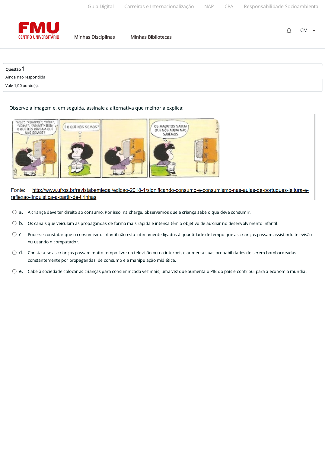 30/05/23, 13:17 Atividade 4 (A4) https://ambienteacademico.com.br/mod/quiz/attempt.php?attempt=2349277&cmid=787286 1/9 Questão 1 Ainda não respondida Vale 1,00 ponto(s). Observe a imagem e, em seguida, assinale a alternativa que melhor a explica: a. A criança deve ter direito ao consumo. Por isso, na charge, observamos que a criança sabe o que deve consumir. b. Os canais que veiculam as propagandas de forma mais rápida e intensa têm o objetivo de auxiliar no desenvolvimento infantil. c. Pode-se constatar que o consumismo infantil não está intimamente ligados à quantidade de tempo que as crianças passam assistindo televisão ou usando o computador. d. Constata-se as crianças passam muito tempo livre na televisão ou na internet, e aumenta suas probabilidades de serem bombardeadas constantemente por propagandas, de consumo e a manipulação midiática. e. Cabe à sociedade colocar as crianças para consumir cada vez mais, uma vez que aumenta o PIB do país e contribui para a economia mundial. Guia Digital Carreiras e Internacionalização NAP CPA Responsabilidade Socioambiental Minhas Disciplinas Minhas Bibliotecas CM https://codely-fmu-content.s3.amazonaws.com/Moodle/GuiaDigital/Guia+digital/index.html https://carreiras.fmu.br/ https://codely-fmu-content.s3.amazonaws.com/Moodle/NAP/inicial/nap/fmu/index.html https://codely-fmu-content.s3.amazonaws.com/Moodle/CPA/landing_CPA/index.html https://portal.fmu.br/sustentabilidade https://ambienteacademico.com.br/ https://ambienteacademico.com.br/ https://ambienteacademico.com.br/course/view.php?id=236 30/05/23, 13:17 Atividade 4 (A4) https://ambienteacademico.com.br/mod/quiz/attempt.php?attempt=2349277&cmid=787286 2/9 Questão 2 Ainda não respondida Vale 1,00 ponto(s). Observe a imagem a seguir: Esse é Arya Permana, que, em 2016, aos 10 anos de idade, era considerado a “criança mais gorda do mundo”, com 188 kg. Na época, Arya, que havia parado de ir à escola por conta de seu peso, ingeria dois pratos (macarrão, almôndegas ou mingau) cinco vezes por dia. Ele havia recém iniciado uma dieta, composta por arroz vermelho, legumes e frutas. A situação de Arya aponta para uma das questões mais complexas que cerca a infância contemporânea: a obesidade infantil. Observe a seguir, algumas assertivas a respeito do tema: I.A obesidade infantil tem diversas causas, sendo impossível apontar um motivo único. Entre as causas, porém, podemos apontar o aumento do consumo de alimentos processados e do sedentarismo, mais comum às culturas economicamente mais desenvolvidas, porém, não exclusivo. II.Entre outras consequências da obesidade infantil, podemos destacar o desenvolvimento de doenças crônicas como a diabetes, de forma precoce, o que pode comprometer toda a vida adulta dessas crianças. III.O combate à obesidade infantil é um assunto importante e que deve passar por programas públicos e pelas famílias. À escola, contudo, não compete participar desse processo, já que não se trata de uma questão pedagógica. Está correto apenas o que se a�rma em: a. I b. II e III c. I e II d. I e III e. II Guia Digital Carreiras e Internacionalização NAP CPA Responsabilidade Socioambiental Minhas Disciplinas Minhas Bibliotecas CM https://codely-fmu-content.s3.amazonaws.com/Moodle/GuiaDigital/Guia+digital/index.html https://carreiras.fmu.br/ https://codely-fmu-content.s3.amazonaws.com/Moodle/NAP/inicial/nap/fmu/index.html https://codely-fmu-content.s3.amazonaws.com/Moodle/CPA/landing_CPA/index.html https://portal.fmu.br/sustentabilidade https://ambienteacademico.com.br/ https://ambienteacademico.com.br/ https://ambienteacademico.com.br/course/view.php?id=236 30/05/23, 13:17 Atividade 4 (A4) https://ambienteacademico.com.br/mod/quiz/attempt.php?attempt=2349277&cmid=787286 3/9 Questão 3 Ainda não respondida Vale 1,00 ponto(s). Em pesquisa realizada pela AVG Technologies em 2016 com famílias de todo o mundo, 66% das crianças entre três e cinco anos de idade conseguiam usar jogos de computador, 47% sabiam como usar um smartphone, mas apenas 14% eram capazes de amarrar os sapatos sozinhos. No caso das crianças brasileiras, o levantamento apontou que 97% das crianças entre seis e nove usam a internet, e 54% têm per�l no Facebook (PLANALTO, 2017). Sabemos que as crianças são vulneráveis aos apelos da mídia, por serem ainda indivíduos em formação. No ano de 2014 foi promulgada a Resolução 163 que procura regulamentar alguns apelos mediáticos às crianças. Assinale a alternativa referente à Resolução 163: a. Proíbe o direcionamento à criança de anúncios impressos, comerciais televisivos, spots de rádio, banners e sites, embalagens, promoções, merchandising, ações em shows e apresentações e nos pontos de venda. b. Proíbe somente o direcionamento à criança de comerciais televisivos. c. Proíbe o direcionamento à criança de anúncios impressos, comerciais televisivos, spots de rádio. d. Proíbe o direcionamento à criança de embalagens, promoções, merchandising. e. Proíbe o direcionamento à criança de banners e sites. Guia Digital Carreiras e Internacionalização NAP CPA Responsabilidade Socioambiental Minhas Disciplinas Minhas Bibliotecas CM https://codely-fmu-content.s3.amazonaws.com/Moodle/GuiaDigital/Guia+digital/index.html https://carreiras.fmu.br/ https://codely-fmu-content.s3.amazonaws.com/Moodle/NAP/inicial/nap/fmu/index.html https://codely-fmu-content.s3.amazonaws.com/Moodle/CPA/landing_CPA/index.html https://portal.fmu.br/sustentabilidade https://ambienteacademico.com.br/ https://ambienteacademico.com.br/ https://ambienteacademico.com.br/course/view.php?id=236 30/05/23, 13:17 Atividade 4 (A4) https://ambienteacademico.com.br/mod/quiz/attempt.php?attempt=2349277&cmid=787286 4/9 Questão 4 Ainda não respondida Vale 1,00 ponto(s). Observe a imagem a seguir: Sobre ela, podemos dizer que: a. Traz uma defesa das escolas que se organizam em tempo integral, voltando-se cada vez mais às at