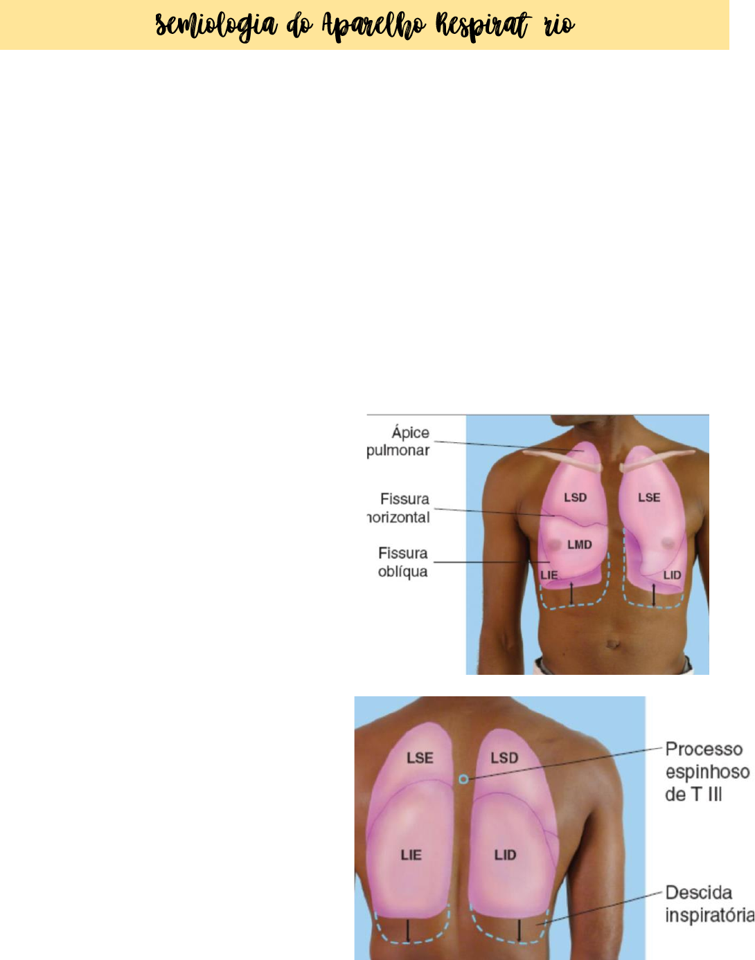 ó DESCREVER ANORMALIDADE ENCONTRADA NO TÓRAX • Localizar no eixo vertical e ao redor da circunferência torácico MARCOS ANATOMICOS • 2EIC: inserção da agulha em casos de pneumotórax hipertensivo: hipertimpanismo, dispneia • 4 EIC: inserção de dreno • TIV: 4 vertebra torácicas: para margem inferior do tubo endotraqueal na radiografia de tórax • Existem estruturas neurovasculares ao longo da margem inferior de cada costela: agulhas e tubos devem ser introduzidos na margem superior • Ângulo de Louis: ângulo do esterno → referência para o 2EIC (2 focos cardíacos) • Espaço entre as costelas VII e VIII: ponta da escapula → toracocentese com a inserção da agulha a cima da costela VIII • Extremidade inferior da escapula: nivel da costela VII • Pescoço flexionado para frente: CVII → processo espinhoso mais protuso LINHAS • Linha medioesternal • Linha medioclavicular • Linha axilar anterior • Linha escapular • Linha vertebral → processos transversos PROJEÇÕES • Pulmões, fissuras e lobos, mentalmente projetados na parede torácica • Regiao anterior: ápice eleva-se 2 a 4cm acima do terço interno da clavícula • Borda inferior do pulmão cruza a costela VI na LHC e costela VIII LAM • Regiao posterior: borda inferior a nivel do p.e. TX • Fissura oblíqua: linha traçada a partir de TIII ate a costela VI na LHC • Lobo superior posterior: TIII processo espinhoso MUSCULATURAS • Diafragma • Musculatura acessória » M. intercostais → tiragem intercostal » M. esternocleidomastóideo » M. escalenos • Pacientes dispneicos utilizam a musculatura acessória ANAMNESE • Sinais e sintomas • Dor torácica • Tosse • Dispneia • Sibilos • Expectoração com sangue → hemoptise DISPNEIA E SIBILOS • Desconforto desproporcional para determinado nivel de esforço físico • Sibilos: sons musicais audíveis pelo paciente e outros TOSSE • Resposta reflexa a estímulos que irritam receptores localizados na laringe, traqueia e brônquios calibrosos » Muco, pus, sangue, corpo estranho • Características » Aguda (3semanas), subaguda (3-8semanas), cronica (>8semanas) » Seca x produtiva » Expectoração: coloração, volume, odor, consistência • Sinais/sintomas uteis incluem: » Febre e tosse produtiva na pneumonia » Sibilos na asma » Dor torácica, dispneia, ortopneia nas SCA HEMOPTISE • Sangue expelido pela tosse das vias respiratórias inferiores » Variação entre raia de sangue a sangue vivo » Analisar volume eliminado, circunstancia do episódio, atividade e sinais/sintomas associados • Confirmar causa de sangramento: proveniente nariz, boca, faringe ou sistema digestório TECNICAS DE EXAME • Paciente sentado: ausculta tórax posterior • Anterior: paciente sentado ou em DD • Braços cruzados a frente do paciente para aumentar o campo pulmonar na regiao posterior • FR: <25irmp • Esforço/musculatura acessória • Cianose • Forma e cor das unhas das maos: baqueteamento digital (arredondadas) » Neoplasia de pulmão/cardiopatias congênitas/fibrose cística • Razão entre diâmetro anteroposterior (AP) e diâmetro torácico lateral geralmente 0,7 e 0,75 até 0,9 e aumenta com o avanço da idade » Pode estar alterado em algumas patologias • Inspeção • Palpação • Percussão • Ausculta Inspeção • Observar formato, movimento do tórax • Procurar deformidade, assimetrias na expansão do tórax • Retração muscular anormal nos espaços intercostais ou durante a inspiração • Alterações unilaterais ou bilaterais do movimento respiratório ou retardo unilateral desse movimento DEFORMIDADES • Pectus escavatum: pode alterar as válvulas cardíacas → pode estar associado a prolapso de válvula mitral • Tórax em tonel ou barril: aumento do diâmetro anteroposterior → (AP) relacionado a hipoxia cronica (tabagista), aumenta com os anos • Pectus carinatum: tórax deslocado anteriormente, cartilagens costais deprimidas ALTERAÇÕES DE RITMOS RESPIRATÓRIOS • Bradipneia: lenta → uremia, depressão respiratória induzida por farmaco e aumento da pressão intracraniana • Respiração suspirosa → hiperventila e pode gerar sincope • Rapida e superficial (taquipneia) • Obstrutiva: expiração prolongada e inspira rapido por ter mais dificuldade (asma) • Respiração rapida profunda (hiperpneia e hiperventilação) » HIPERPNEIA: demanda metabólica → atividade física, altitude elevada, sepse e anemia » HIPERVENTILAÇÃO: independente da demanda metabólica, exceto na acidose respiratória • Atáxica: Biot → irregular com períodos de apneias alternados com respiração profunda regular → meningite, depressão respiratória e lesão cerebral (nivel de bulbo) Palpação • Expansão torácica: por tras → coloca as maos espalmadas, pede para o paciente respirar e observa se elas se movimentarão simetricamente; polegares paralelos na coluna • Frêmito toracovocal » Vibrações sentidas na maos quando o paciente fala → transmissão do ar dentro do pulmão » Maos espalmadas » Normal: simétrica » Falar “33” » O frêmito desaparece quando a transmissão das vibrações da laringe para a superfície do tórax está comprometida por parede torácica espessa; obstrução cronica; DPOC ou derrame pleural, fibrose, ar (pneumotórax) ou tumor infiltrante » Obstrução de vias aéreas » Diminui o frêmito: principalmente derrame pleural e pneumotórax » Distancia entre as pleuras e caixa torácica: se houver muio catarro, frêmito aumentado → sente muito bem » Caixa torácica, pulmão, pleuras compsotas por liquido » Aumenta nas consolidações: pneumonia » Locais para palpação de frêmito Percussão • Normal: som claro pulmonar • Hipertimpânico: pneumotórax • Hepatização pulmonar: maciço → quando cheio de catarro • Frêmito diminuído: derrame (maciço) ou pneumotórax (hipertimpânico) → percussão diferencia a patologia • M