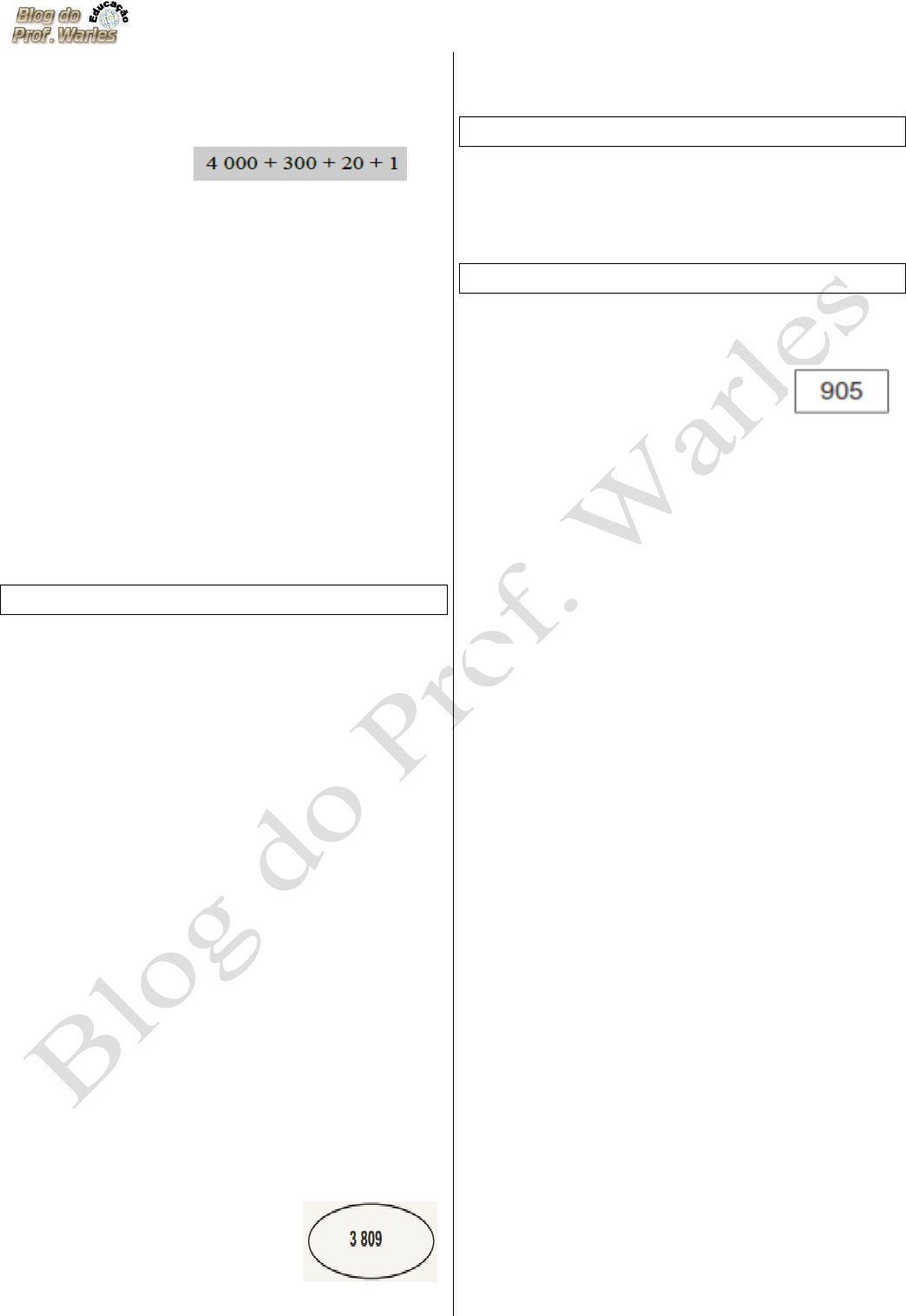 D15 - Reconhecer a decomposição de números naturais nas suas diversas ordens. 1 EEM PADRE RODOLFO FERREIRA DA CUNHA Eletiva- Matemática para o SPAECE Prof. Arnaldo Alves 1ª.(2ª P.D – Seduc-GO 2012). Qual é o número formado pela adição abaixo? A) 1 234 B) 2 134 C) 3 214 D) 4 321 2ª. (Saresp - 2010). O número 30 456 é igual a A) 30 000 + 4 000 + 50 + 6 B) 30 000 + 400 + 50 + 6 C) 3 000 + 40 + 50 + 6 D) 3 000 + 400 + 50 + 6 3ª. (SPAECE). Qual é o número abaixo formado por 3 unidades de milhar, 5 centenas e 4 unidades? A) 354 B) 3 504 C) 30 504 D) 3 000 5004 4ª. (SPAECE). Um garoto completou 1.960 bolinhas de gude em sua coleção. Esse número é composto por: A) 1 unidade de milhar, 9 dezenas e 6 unidades B) 1 unidade de milhar, 9 centenas e 6 dezenas C) 1 unidade de milhar, 60 unidades D) 1 unidade de milhar, 90 unidades 5ª. (SPAECE). A professora de João pediu para ele decompor um número e ele fez da seguinte forma: 4 x 1000 + 3 x 10 + 5 x 1 Qual foi o número pedido? A) 4035 B) 4305 C) 5034 D) 5304 6ª. (Sobral – CE). O número 5 682, pode ser escrito na forma de (A) 5 dezenas de milhar, 6 centenas, 8 dezenas e 2 unidades. (B) 5 dezenas de milhar, 6 dezenas, 8 centenas e 2 unidades. (C) 5 unidades de milhar, 6 centenas, 8 dezenas e 2 unidades. (D) 5 unidades de milhar, 6 dezenas, 8 centenas e 2 unidades. 7ª. (PROEB). O algarismo 2 ocupa a ordem da centena simples no número A) 1 258 B) 2 185 C) 5 821 D) 8 512 8ª. (SAEPI). Uma das decomposições do número 2 893 é A) 2 unidades de milhar, 89 centenas e 3 unidades. B) 2 unidades de milhar, 8 centenas, 9 dezenas e 3 unidades. C) 28 unidades de milhar, 9 dezenas e 3 unidades. D) 289 centenas e 3 unidades. 9ª. (SADEAM). Observe abaixo o número que Sérgio escreveu para sua irmã decompor. Qual é uma das decomposições desse número? A) 38 unidades de milhar e 9 unidades. B) 38 centenas e 9 unidades. C) 38 centenas e 90 unidades. D) 3 unidades de milhar e 89 unidades. 10ª. (SAEMI - PE). Observe abaixo uma das decomposições de um número. 2 x 100 + 5 x 10 + 3 Essa é a decomposição de qual número? A) 21005103 B) 215103 C) 2 513 D) 253 11ª. (SAEMI - PE). Observe abaixo a decomposição de um número. 5 000 + 300 + 1 Essa é uma das decomposições do número A) 531 B) 5 031 C) 5 301 D) 50003001 12ª. (SAEMI - PE). Ester escreveu no quadro abaixo o número da casa onde ela mora. Uma das decomposições desse número é A) 9 + 0 + 5 B) 90 + 5 C) 900 + 5 D) 900 + 50 13ª. (SAEMI - PE). O número total de ônibus que circulam em uma cidade é formado por 2 unidades de milhar, 84 dezenas e 6 unidades simples. Quantos ônibus circulam, ao todo, nessa cidade? A) 2 846 B) 2 086 C) 20 846 D) 28 406 14ª. (SAEB 2013). Usando somente os algarismos 2, 5 e 8, escrevi todos os números de três algarismos diferentes possíveis. O maior número que escrevi foi (A) 528 (B) 258 (C) 825 (D) 852 15ª. (SAEB 2013). Um número foi decomposto em: 2 unidades de milhar, 4 centenas e 5 unidades. Esse número é (A) 2 045 (B) 2 450 (C) 2 405 (D) 245 16ª. (SAEP 2013). O Sr. Telmo tem um hobby de colecionar camisas dos clubes de futebol do Brasil. No momento consta na coleção dele 1.230 camisas. Esse número é composto de (A) 1 unidade de milhar, 2 dezenas e 30 unidades. (B) 1 unidade de milhar, 230 unidades. (C) 1 unidade de milhar, 2 centenas, 3 dezenas. (D) 1 unidade de milhar, 230 unidades. 17ª. O número 2 046 pode ser escrito como A) 2 + 04 + 6 B) 20 + 4 + 6 C) 200 + 40 + 6 D) 2 000 + 40 + 6 18ª. (PROVA BRASIL-2009). Um garoto completou 1960 bolinhas de gude em sua coleção. Esse número é composto por (A) 1 unidade de milhar, 9 dezenas e 6 unidades. (B) 1 unidade de milhar, 9 centenas e 6 dezenas. (C) 1 unidade de milhar, 60 unidades. (D) 1 unidade de milhar, 90 unidades. 19ª. O número 5.001 é igual a (A) 500 + 1 (B) 500 + 10 (C) 5.000 + 1 (D) 5.000 + 10 D15 - Reconhecer a decomposição de números naturais nas suas diversas ordens. 2 20ª. A população de Vila Isabel, bairro da zona norte da cidade do Rio de Janeiro, onde nasceu o poeta Noel Rosa, é, aproximadamente, de 82 000 pessoas. O número 82 000, decomposto em diferentes ordens, fica (A) 8 centenas de milhar + 2 unidades de milhar. (B) 8 centenas de milhar + 2 unidades. (C) 8 dezenas de milhar + 2centenas. (D) 8 dezenas de milhar + 2 unidades de milhar. 21ª. Tem-se o número 8.567. A ordem do algarismo 5 é (A) 5 (B) 50 (C) 567 (D) 500 22ª. (Saresp – 2007). O algarismo que está na ordem da centena do número 8.543 é? (A) 8 (B) 5 (C) 4 (D) 3 23ª. (Saresp 2007). Fazendo a decomposição do número 572, temos: (A) 5 x 100 + 7 x 10 + 2 (B) 7 x 100 + 5 x 10 + 2 (C) 5 x 10 + 7 + 2 (D) 5 x 1000 + 7 x 100 + 2 23ª. (Saresp 2010). No número 2010, o algarismo 1 ocupa a ordem das (A) dezenas simples. (B) centenas simples. (C) unidades de milhar. (D) dezenas de milhar. 24ª. (Prova cidade 2009). Rafael está brincando com seu amigo Rodrigo e pede para ele adivinhar qual é o número cuja decomposição é: 5 centenas de milhar, 7 dezenas de milhar, 1 unidade de milhar, 8 centenas, 2 dezenas e 3 unidades. Que número é esse? (A) 571 823 (B) 328 175 (C) 58 823 (D) 57 182 25ª. (1ª PD – 2012). Ao entrar em sala de aula, Junior viu no quadro-negro a seguinte atividade que a professora tinha deixado para a turma. O número que está faltando na atividade é (A) 70 (B) 80 (C) 700 (D) 800 26. (1ª PD – 2012). Edmar tem um álbum que cabe 356 figurinhas. Para Edmar preencher todo o álbum serão necessários: (A) 3 centenas, 6 dezenas e 5 unidades de figurinhas. (B) 6 centenas, 5 dezenas e 3 unidades de figurinhas. (C) 5 centenas, 3 dezenas e 6 unidades de figurinhas. (D) 3 centenas, 5 dezenas e 6 unidades de figurinhas. 27ª. (Projeto conseguir-DC). Há alguns anos atrás acreditava-se que a cidade de Duque de Caxias ocupa uma área de 464 573 quilômetros quadrados. Decompondo esse número em suas diversas ordens, tem-se: (A) 46 unidades de milhar e 4573 unid