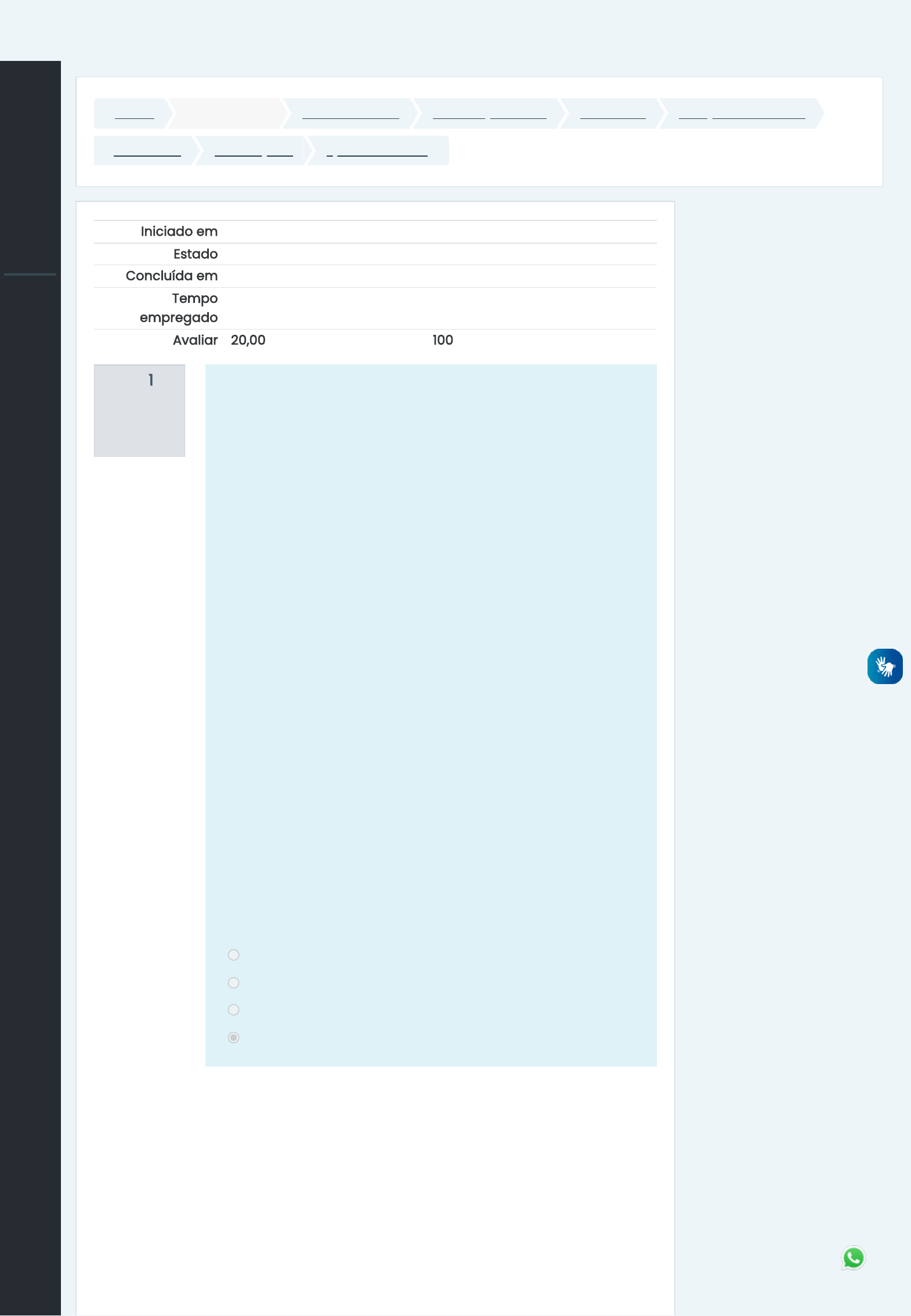 27/06/2023, 08:40 QUESTIONÁRIO 1 https://ava.funec.br/mod/quiz/review.php?attempt=460480&cmid=2175 1/7 Painel Meus cursos CURSOS FUNEC Graduação - EAD Aluno EAD JUNÇÕES DE TURMA Libras - Gr AVALIAÇÕES QUESTIONÁRIO 1 Questão 1 Completo Atingiu 2,00 de 2,00 Iniciado em Tuesday, 27 Jun 2023, 08:34 Estado Finalizada Concluída em Tuesday, 27 Jun 2023, 08:40 Tempo empregado 6 minutos 26 segundos Avaliar 20,00 de um máximo de 20,00(100%) Relacione a primeira coluna com a segunda: 1. LÍNGUAS ORAIS ( ) Utilizam o mecanismo espaço visual para produção e recepção linguística. 2. LÍNGUAS DE SINAIS ( ) Criam de forma arbitrária seus vocábulos, sem uma relação lógica de forma e significado. ( ) Organizam suas sentenças de forma simultânea, já que possuem vários mecanismos de produção linguística. ( ) A iconicidade esta presente na maioria de seus vocábulos. Marque a opção CORRETA: Escolha uma opção: a. 1; 2; 1; 1. b. 1; 2; 1; 2. c. 2; 1; 2; 1. d. 2; 1; 2; 2. https://ava.funec.br/my/ https://ava.funec.br/course/index.php?categoryid=10 https://ava.funec.br/course/index.php?categoryid=17 https://ava.funec.br/course/index.php?categoryid=19 https://ava.funec.br/course/index.php?categoryid=77 https://ava.funec.br/course/view.php?id=309 https://ava.funec.br/course/view.php?id=309#section-3 https://ava.funec.br/mod/quiz/view.php?id=2175 javascript:void(0); https://ava.funec.br/user/index.php?id=309 https://ava.funec.br/badges/view.php?type=2&id=309 https://ava.funec.br/admin/tool/lp/coursecompetencies.php?courseid=309 https://ava.funec.br/grade/report/index.php?id=309 https://ava.funec.br/my/ https://ava.funec.br/?redirect=0 https://ava.funec.br/calendar/view.php?view=month&course=309 javascript:void(0); https://ava.funec.br/user/files.php https://ava.funec.br/course/view.php?id=2011 https://ava.funec.br/course/view.php?id=2012 https://ava.funec.br/course/view.php?id=757 https://ava.funec.br/course/view.php?id=1328 https://ava.funec.br/course/view.php?id=692 https://ava.funec.br/course/view.php?id=1263 https://ava.funec.br/course/view.php?id=1639 https://ava.funec.br/course/view.php?id=309 https://ava.funec.br/course/view.php?id=1994 https://ava.funec.br/course/view.php?id=2018 https://ava.funec.br/my/ 27/06/2023, 08:40 QUESTIONÁRIO 1 https://ava.funec.br/mod/quiz/review.php?attempt=460480&cmid=2175 2/7 Questão 2 Completo Atingiu 2,00 de 2,00 Questão 3 Completo Atingiu 2,00 de 2,00 Acerca dos aspectos linguísticos que envolvem a LIBRAS podemos AFIRMAR: I- Os substantivos em LIBRAS quando sinalizados juntamente com olhos arregalados, marcam o gênero masculino, em contrapartida, quando sinalizamos fazendo um biquinho com a boca marca-se o gênero feminino. II- A repetição do sinal no espaço de sinalização gera a pluralização do mesmo. III- A combinação dos parâmetros: configuração de mãos, ponto de articulação, orientação, movimento e expressões não manuais compõe os sinais em LIBRAS. IV- Assim como no Português o tempo dos verbos pode ser incorporado ao sinal, dando origem a novas expressões. É INCORRETO o que se afirma em: Escolha uma opção: a. Apenas I, II e III. b. Apenas I e IV. c. Os itens I, II, III e IV são incorretos. d. Apenas II, III e IV. Analise as afirmações a seguir acerca de estratégias emergenciais de atendimento ao surdo na ausência de profissionais capacitados em LIBRAS: I- A escrita não é uma opção viável na comunicação com surdos, haja vista que a falta de audição impossibilita os indivíduos surdos de serem alfabetizados. II- A leitura labial, apesar de não ser considerada uma técnica bastante eficiente na comunicação com surdos, pode ser usada desde que observado a capacidade do surdo de fazê-la e ainda as questões físicas que envolvem a mesma. III- Gestos, mímicas e o uso de imagens são sempre válidos na comunicação com surdos. É INCORRETO o que se afirma: Escolha uma opção: a. Apenas no item II. b. Apenas no item I. c. Nos itens II e III. d. Nos itens I e III. javascript:void(0); https://ava.funec.br/user/index.php?id=309 https://ava.funec.br/badges/view.php?type=2&id=309 https://ava.funec.br/admin/tool/lp/coursecompetencies.php?courseid=309 https://ava.funec.br/grade/report/index.php?id=309 https://ava.funec.br/my/ https://ava.funec.br/?redirect=0 https://ava.funec.br/calendar/view.php?view=month&course=309 javascript:void(0); https://ava.funec.br/user/files.php https://ava.funec.br/course/view.php?id=2011 https://ava.funec.br/course/view.php?id=2012 https://ava.funec.br/course/view.php?id=757 https://ava.funec.br/course/view.php?id=1328 https://ava.funec.br/course/view.php?id=692 https://ava.funec.br/course/view.php?id=1263 https://ava.funec.br/course/view.php?id=1639 https://ava.funec.br/course/view.php?id=309 https://ava.funec.br/course/view.php?id=1994 https://ava.funec.br/course/view.php?id=2018 https://ava.funec.br/my/ 27/06/2023, 08:40 QUESTIONÁRIO 1 https://ava.funec.br/mod/quiz/review.php?attempt=460480&cmid=2175 3/7 Questão 4 Completo Atingiu 2,00 de 2,00 Questão 5 Completo Atingiu 2,00 de 2,00 Efetue a operação em LIBRAS a seguir: Escolha uma opção: a. 766 b. 34 c. 630 d. 948 Acerca do Tradutor e Intérprete de LIBRAS MARQUE (V) para VERDADEIRO e (F) para FALSO. I- ( ) Não cabe ao intérprete tutorar o surdo em suas relações sociais. II- ( ) Ensinar o surdo também é uma tarefa do intérprete de LIBRAS. III- ( ) Discrição, imparcialidade e fidelidade são características importantes dos intérpretes de LIBRAS. IV- ( ) Não existe uma formação acadêmica específica para essa profissão, portanto, para ser intérprete basta ter fluência em LIBRAS e ser aprovado por uma banca examinadora. Marque a opção que está de acordo com a SEQUÊNCIA CORRETA das respostas acima: Escolha uma opção: a. I-F; II-F; III-V; IV-V. b. I-F; II-V; III-F; IV-V. c. I-V; II-V; III-F; IV-F. d. I-V; II-F; III-V; IV-F. javascript:void(0); https://ava.funec.br/user/index.php?id=309 https://