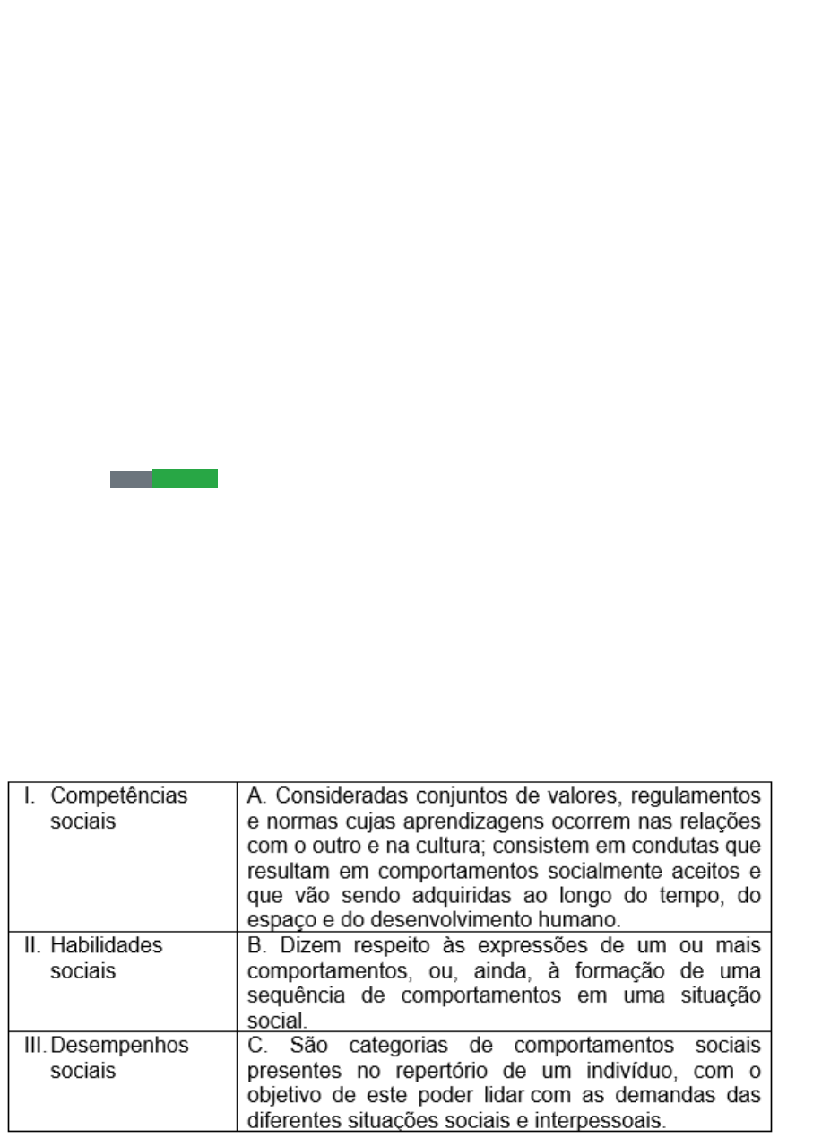 BNCC e a educação matemática 1) Sobre o papel do professor em sala de aula mencionado na BNCC, identifique as afirmativas corretas: I. Tem-se o intuito de fomentar o ensino e engajamento dos alunos nas aulas. II. O professor é o único responsável pelo compartilhamento dos assuntos e experiências em sala de aula. III. É preciso explorar atividades que visam o desenvolvimento das habilidades da BNCC, independentemente se faz sentindo ou não para os alunos. IV. Garantir que as habilidades da BNCC sejam desenvolvidas com os alunos. São verdadeiras: Alternativas: · I - IV.checkCORRETO · II - III. · Todas as afirmativas. · I - II - III. · III - IV. Código da questão: 67486 2) Leia e associe as colunas abaixo, de acordo com as concepções apresentadas pela Base Nacional Comum Curricular (BNCC), em relação ao processo educativo e em relação às competências gerais, socioemocionais e específicas. Assinale a alternativa que traz a associação correta entre as duas colunas: Alternativas: · I-A; II-B; III-C. · I-A; II-B; III-C. · I-A; II-C; III-B.checkCORRETO · I-C; II-A; III-B. · I-B; II-A; III-C. Código da questão: 54756 3) No ensino fundamental são apresentadas as propostas de cada unidade temática que deve ser explorada do 6º ao 9º ano. Leia e associe as duas colunas conforme as características citadas na BNCC. Assinale a alternativa que traz a associação correta entre as duas colunas: Alternativas: · I-B; II-D; III-C; IV-E; V-A.checkCORRETO · I-C; II-B; III-E; IV-D; V-A. · I-A; II-B; III-D; IV-C; V-E. · I-D; II-B; III-C; IV-E; V-A. · I-B; II-C; III-D; IV-A; V-E. Código da questão: 67485 4) Segundo Brousseau (1983), o _______ de um conhecimento matemático é o conjunto de concepções que aborda os erros, que se rejeita, economiza e cria-se formulações que não sejam apenas _________________ teórico e associados ao meio para solucionar _________, mas define-se por algo que se propõe uma _________. Alternativas: · Significado; Direcionamento; Reflexão; Problemas. · Significado; Embasamento; Problemas; Concepção. · Ensino; Embasamento; Problemas; Reflexão. · Sentido; Embasamento; Problemas; Reflexão.checkCORRETO · Concepção; Direcionamento; Significado; Sentido. Código da questão: 67483 5) Sobre as relações entre competências socioemocionais e as culturas digitais, podemos afirmar que: I. Fazem parte de uma visão educacional que considera o ser humano como um ser integral, como um todo não segmentado em mente e corpo, por exemplo, mais hábil nas áreas das ciências exatas que nas áreas das ciências humanas, o que exige considerar as dimensões social e emocional. II. Devem ser articuladas de modo integrador e segundo a perspectiva didático-metodológica da horizontalidade e da hierarquização dos conhecimentos centrais do currículo, privilegiando a cognição e o desenvolvimento do pensamento lógico, uma das áreas de menores índices de aprendizagem dos estudantes brasileiros, conforme índices internacionais, tais como o PISA. III. O uso de recursos tecnológicos no contexto escolar necessita ser cada vez mais cotidiano, requer a abordagem das inteligências intra e interpesssoal de modo correlacionado aos fatores que reúnem as dimensões de outras inteligências, tais como a lógico-matemática, por exemplo. IV. A BNCC estabelece que o papel das tecnologias pode não ser fundamental para a formação de um cidadão, tendo em vista que esse tipo de formação exige saber fazer uso qualificado das ferramentas que envolvem as culturas digitais, o que é um direito optativo, conforme a parte diversificada dos currículos, tais como pensamento computacional, valores éticos, responsabilidade e compromisso sociais, o que produzirá impactos para si e para os coletivos dos quais faz parte. V. As habilidades necessárias ao uso crítico e consciente da tecnologia e geração das culturas digitais fazem parte dos processos educativos, contudo, as relações dessas habilidades com as competências socioemocionais devem reproduzir a lógica meritocrática, em que os estudantes mais hábeis possam aprofundar seus conhecimentos em disciplinas específicas ligadas à cibercultura São verdadeiras: Alternativas: · II - V. · I - IV · I - IIIcheckCORRETO · I - V. · III - V. Código da questão: 54774 6) Considere as seguintes asserções sobre as competências gerais da BNCC: ( ) A maior parte delas apresenta relações com as competências socioemocionais. ( ) A maior parte delas apresenta relações com as competências cognitivas. ( ) Todas elas estabelecem uma temática geral a que se referem e descrevem conhecimentos e habilidades necessários para que o aluno seja competente. ( ) A menor parte delas apresenta relações com as competências socioemocionais. ( ) A maior parte delas apresenta relações com foco em conhecimento. Assinale a alternativa que contenha a sequência correta: Alternativas: · V – F – V – F – V. · F – V – F – F – V. · V – V – V – V – F. · F – F – V – V – V. · V – F – V – F – F.checkCORRETO Código da questão: 60855 7) Em relação às diversas e possíveis noções de competências, assinale a alternativa que não se relaciona de forma positiva para a composição deste conceito no contexto educacional: Alternativas: · Constituem características implícitas e que uma pessoa pode expressar por meio de seu desempenho ao longo da realização de uma tarefa, em determinada situação, conforme objetivos específicos. · São conjuntos de conhecimentos, habilidades e atitudes que justificam o desempenho de uma pessoa conforme objetivos explícitos e determinados, impostos por uma tarefa ou uma função específica em situações e contextos. · São o conjunto de aprendizagens e saberes sociais e comunicacionais mobilizados por uma pessoa em face de uma situação complexa, de acordo com as necessidades apresentadas pelo contexto em que está inserida. · É