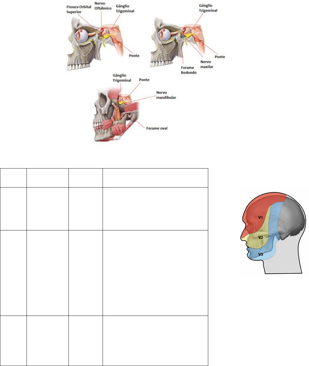 ANATOMIA APLICADA A ANESTESIOLOGIA · ANATOMIA DO VERVO TRIGEMIO – DIVISÃO MOTORA E SENSORIAL · Par de nervos (direito e esquerdo) que proporcionam a inervação da maioria dos dentes, ossos e tecidos moles da cavidade oral. · O nervo trigêmeo é o maior dos 12 nervos cranianos · Ele é constituído de uma pequena raiz motora e de uma sensorial (tripartida) maior. · Emerge do tronco cerebral pela face anterior da ponte (origem do nervo trigêmeo) com ambas as raízes motoras e sensitivas, em seguida o nervo entra na chamada caverna trigêminal (ou de Meckel), uma bolsa formada pela dura ater, situada inferior e lateralmente ao seio cavernoso. · Divisão do nervo trigêmeo (V) N° (V PAR) NOME (TRIGEMEO) TIPO FUNÇÃO V1 OFTALMICO SENSORIAL SENSORIAL MUSCULOS DA FRONTE COURO CABELUDO, PÁLPEBRA SUPERIOR PELE DO DORSO DO NARIZ. SUPRE A CÓRNEA, A MUCOSA DA CAVIDADE SUPERIOR DO NARIZ E PARTE ANTERIOR DA DURA-MÁTER. V2 MAXILAR SENSORIAL PALPEBRAS INFERIORES ZIGOMA LABIO SUPERIOR REGIÃO LATERAL DO NARIZ BOCHECHA INERVA A MUCOSA NASAL INFERIOR, O SEIO MAXILAR E A DURA-MÁTER NA PORÇÃO DA FOSSA MÉDIA DO CRÂNIO. NA REGIÃO BUCAL, SUPRE A REGIÃO SUPERIOR DO VESTÍBULO DA BOCA, COMO TAMBÉM O PALATO E OS DENTES MAXILARES. V3 MANDIBULAR SENSORIAL LATERAL DO COURO CABELUDO PELE ANTERIOR DOS OUVIDOS BOCHECHAS INFERIORES LABIOS INFERIORES ASPECTO ANTERIOR DA MANDIBULA DENTES MANDIBULARES 2/3 ANTERIORES DA LINGUA V3 MANDIBULAR MOTOR MUSCULOS DA MASTIGAÇÃO (TEMPORAL, MASSETER, PTERIGOIDE MEDIAL E LATERAL, TENSOR DO VEU PLATAINO E TENSOR DO TIPANO) · DIVISÃO MOTORA (FIBRAS EFERENTES) Relacionado a porção motora mandibular, se origina no núcleo motor na ponte e medula oblonga, as fibras eferentes formam uma pequena raiz neural e segue lado a lado com a raiz sensorial maior, mas separado dela, ou seja, ela sofre ramificações. Essa inervação motora irrigam o milo-hioideo, ventre anterior do digastrico, tensor do véu palatino e tensor do tímpano para que aconteça os movimentos mandibulares. · DIVISÃO SENSORIAL (FIBRAS AFERENTES) Se originam no gânglio trigeminal, essas fibras se dividem em 3, são elas: · Divisão oftálmica (V1): segue anteriormente a parede lateral do seio cavernoso até a parte medial da fissura orbital superior – onde sai do crânio para a orbita. · Divisão maxilar (V2) segue anteriormente e inferiormente e sai do crânio pelo forame redondo, na parte superior da fossa pterigopalatino. · Divisão mandibular (V3): segue para baixo do crânio, juntamente com a raiz motora, pelo forame oval. Ambas as raízes se misturam (tronco neural) que entra na fossa infratemporal. · FIBRAS EXTEROCEPTIVAS: Impulsos de dor, tato pressão e temperatura. · Face, cavidade nasal e bucal ocular · FIBRAS PROPRIOCEPTIVAS: Impulsos de pressão profunda. Mesmo em dentes tratados endodonticamente é possível sentir pressões nele, devido a essas fibras presentes no periodonto. · ATM, dentes, periodonto, palato duro, músculos da mastigação. · NERVO TRIGEMEO – DIVISÃO OFTALMICA. · CARACTERISTICAS: · Primeira divisão do nervo trigêmeo · Exclusivamente sensitivo · A menor das três divisões · Sai do crânio e entra através da fissura orbitaria superior. · O nervo oftálmico se divide em 3 principais partes: 1. Nasociliar · Segue ao longo da borda medial do teto da orbita, enviando ramos para a cavidade nasal, terminando na pele do nariz. · Ramifica-se nos nervos: · Infratroclear: Inerva as pálpebras, pele do nariz e saco lacrimal · etmoidal posterior: Nem sempre presente. Inerva os seios etmoidal e esfenoidal. · etmoidal anterior: Continuação do nervo nasociliar. Nos seus ramos nasais internos inervam a parte antero-superior da mucosa das paredes e septo nasal. Já no seu ramo nasal externo inerva a pele do dorso do nariz até seu ápice. 2. Frontal · Maior ramo da divisão oftálmica · Segue anteriormente pela orbita dividindo-se em dois ramos: · Supratroclear: Deixa a orbita pela incisura frontal. Inerva parte da pálpebra superior, parte da raiz do nariz e da pele da região medial da orbita e glabela. · Supraorbital: Percorre o teto da orbita e emerge pelo forame ou incisura supra-orbital. Inerva a pele da fronte, parte do couro cabeludo, pálpebra superior e seio frontal. 3. Lacrimal · É mais lateral · Se dirige para a glândula lacrimal · Recebe o ramo comunicante do nervo zigomático (nervo maxilar) · Fibras secretomotoras parassimpáticas do nervo petroso maior e fibras simpáticas do gânglio cervical superior para a glândula lacrimal, ou seja, a glândula lacrimal é inervada por outras fibras de outros nervos. · Inerva a glândula lacrimal, conjuntiva da pele da pálpebra superior. · NERVO TRIGEMEO – DIVISÃO MAXILAR (V2) · CARACTERISTICAS: · A divisão maxilar do nervo trigêmeo se origina do meio do gânglio trigêmeo. · Tamanho intermediário entre a divisão oftálmica e a mandibular, ela tem função puramente sensorial. · Segue anteriormente e inferiormente e sai do crânio pelo forame redondo, na parte superior da fossa pterigopalatina. · Emite ramos em 4 regiões: · Intracraniana: Nervo meníngeo: inerva a dura-máter, não está relacionado com a cavidade bucal · Fossa pterigopalatina: 1. Nervo zigomático: dirige para orbita pela fissura orbital inferior e emite o ramo comunicante com o nervo lacrimal. Divide-se em dois ramos:2 · Zigomáticofacial: Inerva a pele da região do osso zigomático. · Zigomaticotemporal: Inerva a pele da fronte e da parte inferior da região temporal. 2. Nervo pterigopalatino: Supre quatro áreas (orbita, nariz, palato e faringe) · Ramos orbitais: Suprem o periósteo da orbita · Ramos faríngeo: chega as coanas e a tuba auditiva. Inerva teto da nasofaringe e o seio esfenoidal · Nervo esfenopalatino: penetra na cavidade nasal pelo forame esfenopalatino e se divide: · Nervo nasopalatino: inerva a mucosa do septo nasal e do palato de canino a canino. · Ramos palatinos: continua