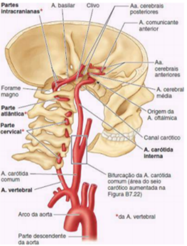 relação às médias, a distribuição é feita pela maior parte da face lateral dos hemisférios. A artéria comunicante anterior se origina da artéria cerebral anterior e liga as cerebrais anterior direita e esquerda. A comunicante posterior, por sua vez, se origina da artéria cerebral posterior, e sua distribuição é feita pelo trato óptico, pedúnculo cerebral, cápsula interna e tálamo. As artérias vertebrais ao se unirem formam a basilar. Esta origina artérias cerebrais posteriores, cuja distribuição é feita pela face inferior do hemisfério cerebral e do lobo occipital. (Figura 9) Figura 9 – Artéria vertebral e carótida interna Fonte: Moore, 2014 3.1 Artérias vertebrais As artérias vertebrais se originam na raiz do pescoço (as partes pré-vertebrais dessas artérias) como os primeiros ramos da primeira parte das artérias subclávias. As duas artérias vertebrais geralmente têm tamanhos diferentes, sendo a esquerda maior do que a direita. As partes transversais destas ascendem através dos forames transversários das seis primeiras vértebras cervicais. As partes atlânticas das artérias vertebrais (partes relacionadas com o atlas, vértebra C I) perfuram a dura-máter e a aracnoide- máter e atravessam o forame magno. As partes intracranianas das artérias vertebrais se unem na margem caudal da ponte para formar a artéria basilar. O sistema arterial vertebrobasilar e seus ramos muitas vezes são denominados clinicamente circulação posterior do encéfalo. A artéria basilar, assim denominada em face de sua íntima relação com a base do crânio, ascende até o clivo, a face inclinada do dorso da sela até o forame magno, através da cisterna pontocerebelar até a margem superior da ponte. Termina dividindo-se em duas artérias cerebrais posteriores.