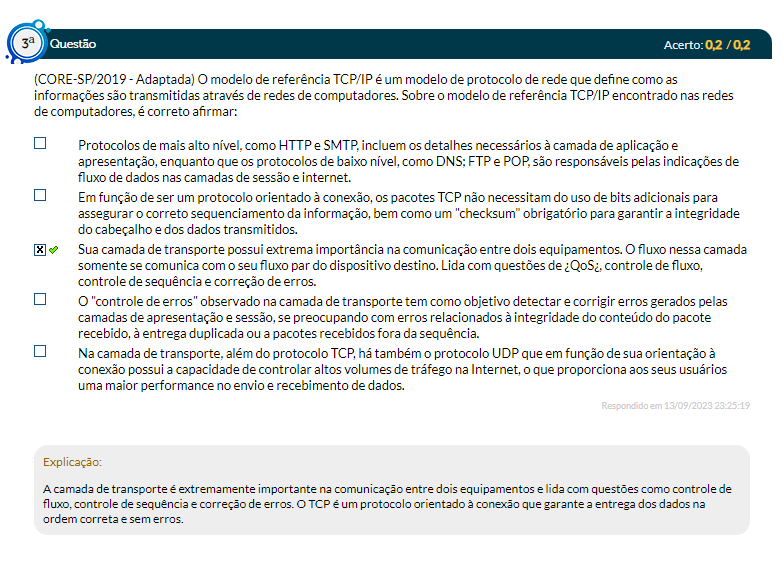 (CORE-SP2019 - Adaptada) O modelo de referência TCPIP é um modelo de protocolo de rede que define como as informações são transmitidas através de redes de computadores. Sobre o modelo de referência TC