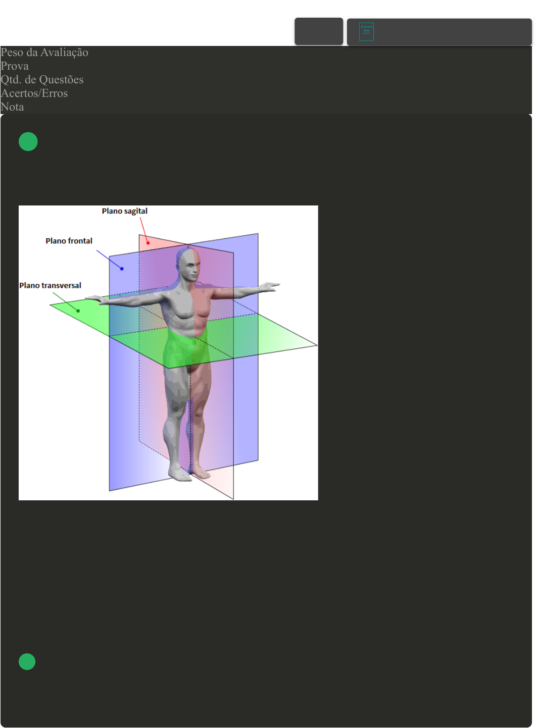 Prova Impressa GABARITO | Avaliação II - Individual (Cod.:884435) Peso da Avaliação 1,50 Prova 70081065 Qtd. de Questões 10 Acertos/Erros 9/1 Nota 9,00 Considere que tenha que descrever movimentos corporais realizados no dia a dia e em sua prática profissional. O tema emprega um dos métodos universalmente utilizados, embasado em três dimensões e conhecido como Sistema de Planos e Eixos, conforme a figura. O movimento em um plano sempre ocorre sobre um eixo que fica perpendicular a esse plano. Considerando a situação descrita, analise as afirmativas a seguir: I- O movimento de abdução horizontal do quadril ocorre no plano sagital. II- Os movimentos de adução e abdução de quadril ocorrem no plano sagital. III- Os movimentos de adução e abdução de quadril ocorrem no plano frontal. IV- Os movimentos de flexão e extensão de joelho ocorrem no plano sagital. V- Os movimentos de rotação ocorrem no plano transverso.Assinale a alternativa CORRETA: A As afirmativas II, III e IV estão corretas. B As afirmativas I, II e IV estão corretas. C As afirmativas III, IV e V estão corretas. D As afirmativas I, III e V estão corretas. VOLTAR A+ Alterar modo de visualização 1 Identifique na imagem o plano e o eixo do movimento: Assinale a alternativa CORRETA: FONTE: https://sucai.gaoding.com/material/11875071. Acesso em: 16 ago. 2021. A Plano Coronal - Eixo longitudinal. B Plano tranveral - Eixo longitudinal. C Plano Coronal - Eixo ântero-posterior. D Plano sagital - Eixo látero-lateral. [Laboratório Virtual – Movimentos da Articulação Glenoumeral] Na articulação glenoumeral (ombro), existem duas bolsas, localizadas de forma a evitar constantes atritos entre as partes ósseas e os tecidos moles adjacentes, denominadas subdeltoidea e subacromial. Especificamente, essas bolsas localizam-se numa zona de deslizamento entre um espaço virtual formado pelo arco acromioclavicular que, por sua vez, é formado pela relação do osso acrômio com o processo coracoide da clavícula. Essa relação se dá pelo ligamento coracoacromial de maneira que um teto protetor não permita impacto sobre as estruturas osteoligamentares (METZKER, 2010). Sobre o ombro, assinale a alternativa CORRETA: Fonte: METZKER, Carlos Alexandre Batista. Tratamento conservador na síndrome do impacto no ombro. Fisioterapia do Movimento, Curitiba, v. 23, n. 1, p. 141-151, jan. 2010. Disponível em: https://www.scielo.br/j/fm/a/JhCV69jvtGnwMQMrXFyrsZs/?format=pdf&lang=pt. Acesso em: 11 jan. 2023. A O ombro é uma articulação biaxial com dois graus de liberdade e executa três movimentos. B O ombro realiza os movimentos de flexão, extensão, abdução, adução, rotação medial, inversão e circundução. C O ritmo escapuloumeral permite de 0 a 90° de amplitude em flexão com elevação. A cabeça longa do bíceps estabiliza a cabeça umeral, resistindo à força de pressão. D O manguito rotador é um estabilizador dinâmico, que impede o escorregamento da cabeça do úmero para fora da cavidade glenoidal da escápula durante atividades do dia a dia. 2 3 "A mobilidade vertebral está elucidada na predisposição biomecânica de que a coluna vertebral dispõe em mover-se, movimentar-se, mexer-se, e, para tanto, possui uma perfeita engrenagem que trabalha em harmonia para desenvolver o movimento. Na composição desta engrenagem estão as vértebras, os discos intervertebrais, os músculos e os ligamentos que permitem a realização do movimento (ROBELLO, 2015)". No plano transversal, a coluna vertebral faz movimentos de rotações. Assinale a alternativa CORRETA: A Diagonal. B Anteroposterior. C Longitudinal. D Laterolateral. No que concerne à coluna vertebral, temos várias questões associadas. Sobre esse tema, assinale a alternativa CORRETA: A Nossa coluna vertebral é composta por 35 vértebras, sendo 7 móveis, 5 cervicais, 12 torácicas e 24 lombares. B Nossa coluna vertebral é composta por 33 vértebras, sendo 24 móveis, 7 cervicais, 12 torácicas e 5 lombares. C Nossa coluna vertebral é composta por 33 vértebras, sendo 5 móveis, 7 cervicais, 24 torácicas e 12 lombares. D Nossa coluna vertebral é composta por 33 vértebras, sendo 24 móveis, 5 cervicais, 12 torácicas e 7 lombares. Sagital é o plano anatómico que divide o corpo humano em metades esquerda e direita. Passa por vários pontos anatómicos entre os quais nariz, umbigo, centro de gravidade e sínfise púbica e cai num espaço livre entre calcanhares. Sobre as características do Plano Sagita, assinale a alternativa CORRETA: A Divide o corpo em duas metades, anterior e posterior, os movimentos realizados neste plano são as abduções e aduções, e ainda, as flexões de pescoço e tronco. B Divide o corpo em metades superior e inferior. Os movimentos que são realizados nesse plano são as rotações mediana ou interna, lateral ou externa. C As ações articulares ocorrem em torno de um eixo longitudinal ou vertical e incluem a rotação medial – lateral e pronação – supinação. D Divide o corpo em duas partes iguais, direita e esquerda. São os planos verticais tendo como referência a sutura sagital da calota craniana. 4 5 6 A alavanca é dependente de elementos que atuam na execução e manutenção adequada do movimento. Para a cinesiologia, a alavanca deverá estar relacionada a uma característica. Assinale a alternativa CORRETA: A Nas alavancas de segunda classe, o ponto de apoio é localizado entre a força motriz e a resistência. B Constituída pelos elementos: Ponto de Apoio, Força Motriz, Tremor de execução ao final do movimento e resistência. C As alavancas do movimento são divididas em três classes: Interfixas, Interresistentes e interpotentes. D Nas alavancas de terceira classe, o ponto de apoio é localizado entre a força motriz e a resistência. "[...] recebem os nomes de altas e áxis, respectivamente, fazem a sustenção do crânio e são vértebras atípicas (não possuem corpo vertebral) [...]".