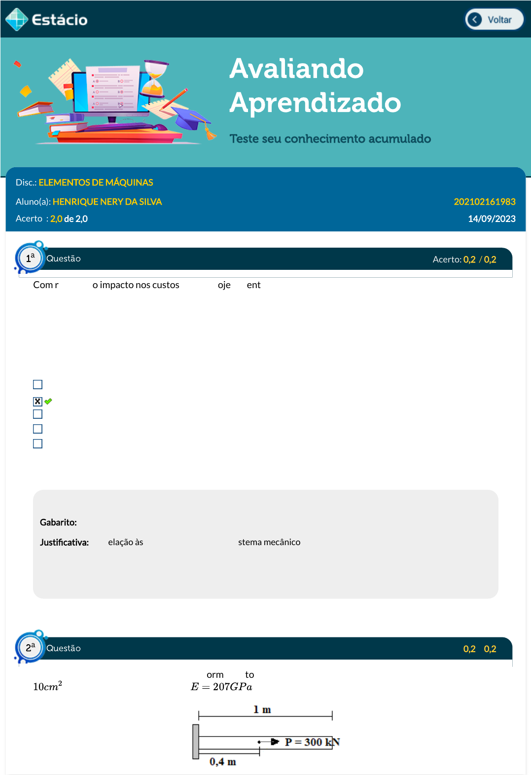 14/09/2023, 16:44 Estácio: Alunos https://simulado.estacio.br/alunos/ 1/9 Avaliando Aprendizado Teste seu conhecimento acumulado Disc.: ELEMENTOS DE MÁQUINAS Aluno(a): HENRIQUE NERY DA SILVA 202102161983 Acertos: 2,0 de 2,0 14/09/2023 Acerto: 0,2 / 0,2 Com relação ao impacto nos custos de um projeto dentre as a�rmativas abaixo estão corretas: I - Quanto o maior o número de diferentes peças em um sistema menor o custo de produção. II - Quanto maior as tolerâncias, menor o custo para a produção de uma peça. III - Quanto maior a quantidade fabricada de uma mesma peça, menor o custo unitário devido ao ganho de escala. Todas estão corretas. II e III estão corretas. Somente I está correta. I e III estão corretas. I e II estão corretas. Respondido em 14/09/2023 16:25:37 Explicação: Gabarito: II e III estão corretas. Justi�cativa: Em relação às partes ou peças de um sistema mecânico, quanto maior a quantidade de uma mesma peça, menor será o custo de produção em virtude do ganho de escala. Além disso, quanto mais apertada a tolerância, maior o número de etapas de produção e, via de regra, menor a velocidade de produção. Finalmente, quanto maior o número de peças para a montagem de um sistema, maio o custo, visto que, geralmente, será maior o tempo de máquina para a produção das peças, além do tempo de montagem. Acerto: 0,2 / 0,2 Assinale a alternativa que apresenta a deformação total da barra de aço (área da seção reta retangular de ) da �gura abaixo sabendo que .10cm2 E = 207GPa Questão1 a Questão2 a https://simulado.estacio.br/alunos/inicio.asp javascript:voltar(); 14/09/2023, 16:44 Estácio: Alunos https://simulado.estacio.br/alunos/ 2/9 Respondido em 14/09/2023 16:30:12 Explicação: Gabarito: Justi�cativa: a deformação devido à tensão normal é dada por: Observamos que do comprimento total da barra, somente 0,4 m estão de fato submetidos ao carregamento, conforme o diagrama de corpo livre a seguir Com os dados do problema Acerto: 0,2 / 0,2 A junção da �gura é carregada em tração por uma carga . Os parafusos foram carregados com . Se a rigidez da junta e a resistência de prova , assinale a a�rmativa correta.. Fonte da �gura: BUDYNAS e NISBETT, 2011, pg 476 A tensão devido à pré-carga . A tensão no parafuso é . O fator de carga 1,17, signi�cando que o parafuso resistirá às tensões a que está submetido. A tensão no parafuso . Δl = 0, 6mm Δl = 0, 15m Δl = 1, 5mm Δl = 0, 06m Δl = 0, 015m Δl = 0, 6mm P = 6kip Fi = 25kip C = 0, 35 Sp = 85kpsi σi ≅23, 5kpsi σb ≅16kpsi σb ≅40kpsi Questão3 a 14/09/2023, 16:44 Estácio: Alunos https://simulado.estacio.br/alunos/ 3/9 O fator de segurança contra a separação da junta é menor que 1, indicando que a junta vai se separar. Respondido em 14/09/2023 16:30:55 Explicação: Gabarito: O fator de carga 1,17, signi�cando que o parafuso resistirá às tensões a que está submetido. Justi�cativa: A tensão no parafuso é Para o parafuso do problema ; e Para uma tensão de prova Fator de carga Fator de segurança contra separação da junta Acerto: 0,2 / 0,2 O pinhão da �gura gira a 1800 RPM no sentido horário. Assinale a alternativa correta sobre o trem de engrenagens nessa situação. Fonte: BUDYNAS E NISBETT, 2011, pag 733 A engrenagem 5 gira a 1800 RPM no sentido contrário da engrenagem 2. A engrenagem 5 gira a 1800 RPM no mesmo sentido da engrenagem 2. A engrenagem 5 gira a 379,8 RPM no sentido contrário da engrenagem 2. A engrenagem 5 gira a 8530,8 RPM no mesmo sentido da engrenagem 2. A engrenagem 5 gira a 379,8 RPM no mesmo sentido da engrenagem 2. Respondido em 14/09/2023 16:35:46 At = 0, 373in 2 SP = 85kpsi SP = 85kpsi Questão4 a 14/09/2023, 16:44 Estácio: Alunos https://simulado.estacio.br/alunos/ 4/9 Explicação: Acerto: 0,2 / 0,2 Conforme os dados da estrutura representada a seguir, marque a opção correta para o valor do deslocamento no nó 2 e das forças de reação nos nós 1 e 3. u2=1,33 mm; R1=0 N e R2= -13300 N u2=2,4 mm; R1=16625 N e R2= 13300 N u2=2,4 mm; R1=-16625 N e R2= -13300 N u2=1,33 mm; R1=16625 N e R2= 13300 N u2=1,33 mm; R1=-16625 N e R2= -13300 N Respondido em 14/09/2023 16:37:13 Explicação: Para a solução do problema, utilizaremos o sistema matricial a seguir: Questão5 a 14/09/2023, 16:44 Estácio: Alunos https://simulado.estacio.br/alunos/ 5/9 Assim: Calculando as constantes de mola por meio da fórmula , chegaremos aos seguintes resultados: Pelas condições de contorno dos nós 1 e 2 (engaste), podemos considerar u1=0 e u3=0 . Substituindo os valores conhecidos na equação matricial chegaremos ao seguinte sistema: Conforme a segunda linha da equação matricial, calcularemos o deslocamento no nó 2 (u2): Logo: Conhecido o valor de u2 , poderemos encontrar os valores das reações nos nós 1 e 3: Da mesma forma do cálculo realizado para encontra R1 , utilizaremos a terceira linha da equação matricial para calcular a reação no nó 3: Assim a resposta para o problema é: Acerto: 0,2 / 0,2 Correlacione as atividades descritas com as respectivas fases do processo do projeto I. são reunidas as informações técnicas acerca de projetos semelhantes e levantadas as restrições do projeto. II. todas as informações técnicas do protótipo selecionado para a produção, tais como desenhos, instruções de montagem, lista de materiais e plano de manutenção, são elaboradas e repassadas para a produção k = A ∗ E t Questão6 a 14/09/2023, 16:44 Estácio: Alunos https://simulado.estacio.br/alunos/ 6/9 III. os protótipos são avaliados quanto ao atendimento aos requisitos do projeto, produtibilidade, manutenibilidade. IV. são selecionadas e modeladas as possíveis soluções para o problema que o projeto visa resolver. V. os modelos dos sistemas da fase anterior são otimizados e os de melhor desempenho selecionados para produção do protótipo e avaliação. I - de�nição do problema; IV - síntes