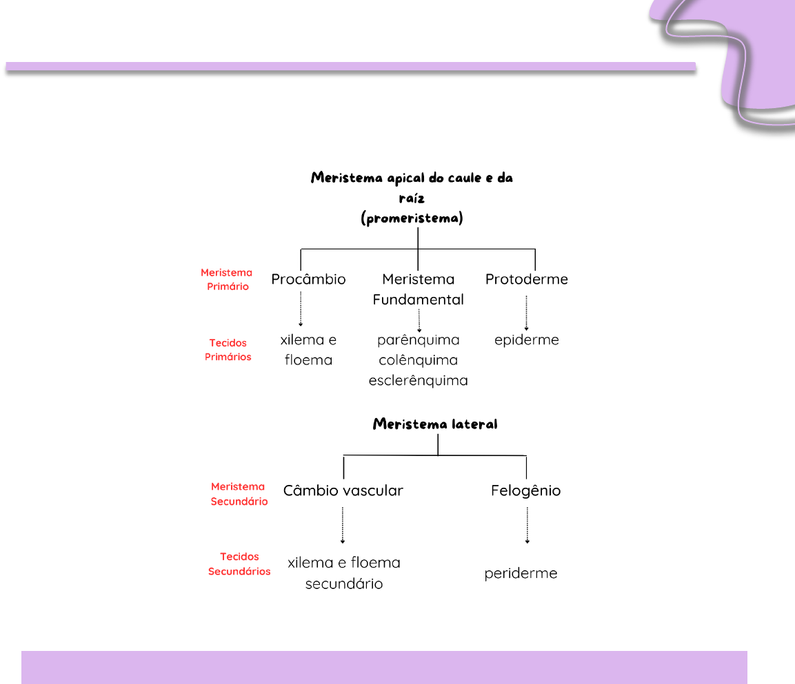Meristemas 1. O que são meristemas? Os meristemas são regiões especializadas que produzem novas células, as quais são incorporadas ao corpo do vegetal. Podem ser classificados de acordo com a localização no corpo do vegetal: ➢ Apicais do caule e da raiz: crescimento em altura, ou seja, crescimento primário; ➢ Intercalares: alongamento do entrenó em gramíneas; ➢ Laterais: crescimento em espessura, ou seja, crescimento secundário. De acordo com o tempo de surgimento no corpo vegetal: ➢ Meristema primário: estão presentes desde o embrião; ➢ Meristema secundário: se formam a partir de tecidos primários. 2. Sistemas de tecidos (dérmicos, fundamental e vascular) ➢ Sistema dérmico: é o revestimento externo de proteção de uma planta, protegendo contra o dano físico. Formado pela a epiderme e periderme; ➢ Sistema fundamental: pode realizar fotossíntese, armazenamento e preencher espaços não ocupados pelo sistema dérmico. Formado pela o parênquima, colênquima e esclerênquima; ➢ Sistema vascular: sistema contínuo de tecidos que conduzem água, sais minerais e nutrientes. Formado pelo o xilema e floema. 3. Meristema apical Apresenta promeristema protegido pelos primórdios foleares. O promeristema possui duas regiões: ➢ Túnica: uma ou mais camadas de células mais externas, que se dividem em planos perpendiculares a superfície. Forma a protoderme (epiderme); ➢ Corpo: localiza-se abaixo da túnica e as divisões ocorrem em todos os planos. Forma o procâmbio (tecidos vasculares) e o meristema fundamental (córtex e medula). 4. Meristema intercalares Localizam-se na base dos entrenós dos caules maduros e na base das folhas de várias monocotiledoneas, onde sua função é fazer o alongamento do entrenó nos caules reprodutivos e permitir o crescimento constante das folhas durante toda a vida. 5. Meristemas laterais Em muitas espécies, a raiz e o caule crescem em espessura, devido a adição de novos tecidos vasculares ao corpo primário. Isso ocorre devido aos meristemas laterais. Surgem lateralmente em relação ao eixo da raiz e do caule, em regiões que já passaram pelo crescimento primário. Os dois tipos de meristemas laterais são: ➢ Câmbio vascular: o que dá origem ao xilema e floema secundário; ➢ Felogênio: dá origem a periderme, que substitui a epiderme no caule e raiz no crescimento secundário.