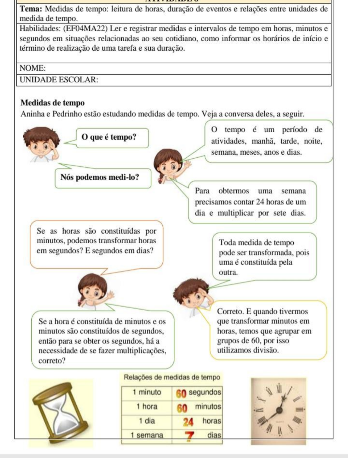 (EF04MA22) Ler e registrar medidas e intervalos de tempo em horas, minutos e segundos em situações relacionadas ao seu cotidiano, como informar os ...