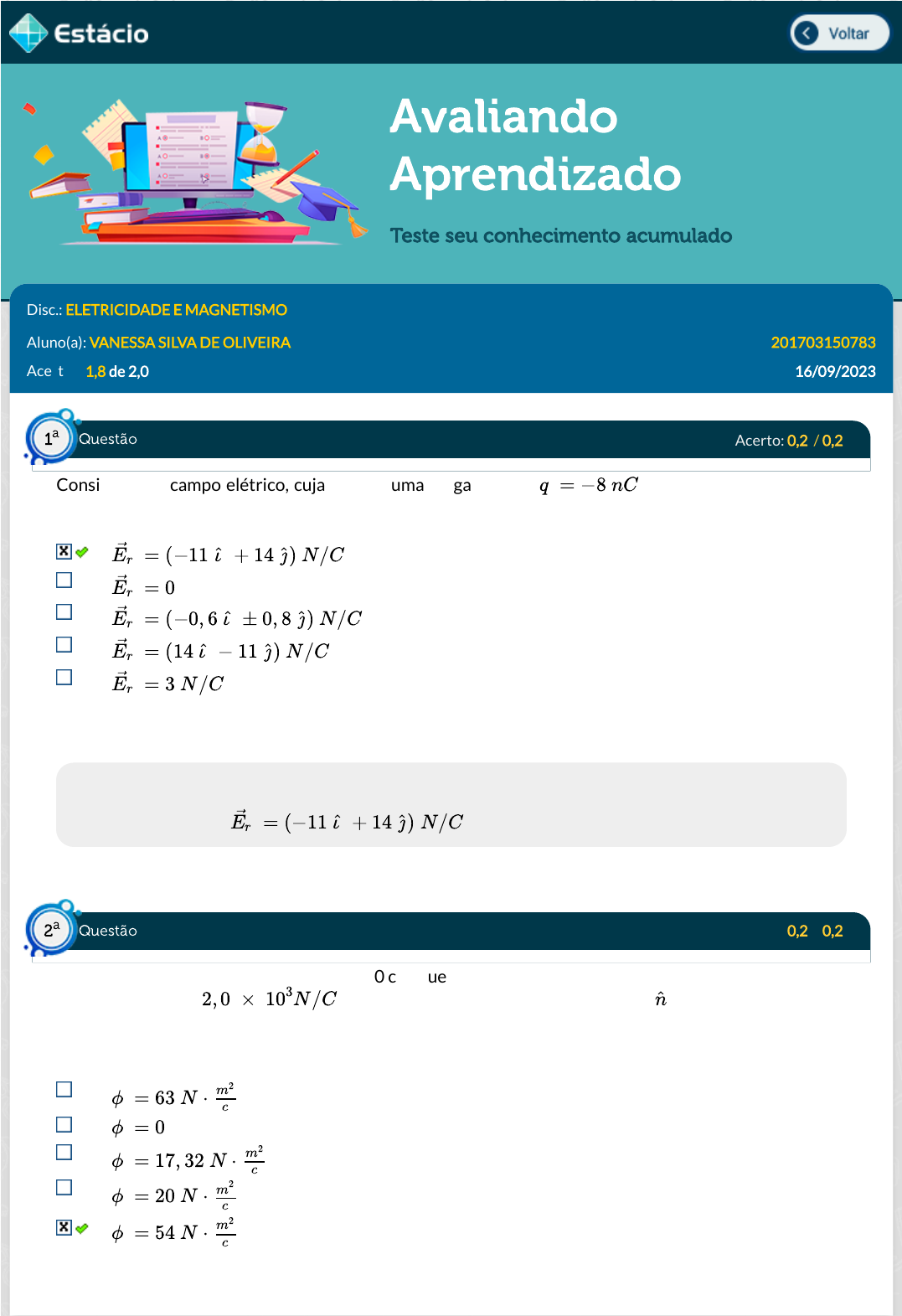16/09/2023, 15:14 Estácio: Alunos https://simulado.estacio.br/alunos/ 1/7 Avaliando Aprendizado Teste seu conhecimento acumulado Disc.: ELETRICIDADE E MAGNETISMO Aluno(a): VANESSA SILVA DE OLIVEIRA 201703150783 Acertos: 1,8 de 2,0 16/09/2023 Acerto: 0,2 / 0,2 Considere um campo elétrico, cuja fonte é uma carga elétrica , posicionada na origem de um sistema xy. Se medido no ponto x = 1,2 m e y = -1,6 m, esse campo será: Respondido em 16/09/2023 15:02:42 Explicação: A resposta correta é: Acerto: 0,2 / 0,2 Considere um disco plano de raio igual a 10 cm, que é atravessado por linhas de campo elétrico de intensidade igual a , de tal modo que o vetor normal do disco, , forma um ângulo de 30o com a direção e sentido positivo do campo elétrico. Qual é o �uxo de campo elétrico através desse disco? Respondido em 16/09/2023 15:04:59 q = −8 nC →Er = (−11 ι̂ + 14 ȷ̂) N/C →Er = 0 →Er = (−0, 6 ι̂ ± 0, 8 ȷ̂) N/C →Er = (14 ι̂ − 11 ȷ̂) N/C →Er = 3 N/C →Er = (−11 ι̂ + 14 ȷ̂) N/C 2, 0 × 103N/C n̂ ϕ = 63 N ⋅ m2 c ϕ = 0 ϕ = 17, 32 N ⋅ m2 c ϕ = 20 N ⋅ m 2 c ϕ = 54 N ⋅ m2 c Questão1 a Questão2 a https://simulado.estacio.br/alunos/inicio.asp javascript:voltar(); 16/09/2023, 15:14 Estácio: Alunos https://simulado.estacio.br/alunos/ 2/7 Explicação: A resposta correta é: Acerto: 0,2 / 0,2 Um �o condutor elétrico de cobre (calibre 18) possui área de sessão reta igual a e diâmetro de 1,02 mm. Considerando que esse �o conduz uma corrente I = 1,67 A, obtenha o módulo do campo elétrico no �o. A resistividade do cobre nas condições normais de temperatura a é . Respondido em 16/09/2023 15:02:34 Explicação: A resposta correta é: Acerto: 0,2 / 0,2 Seja um feixe de partículas positivas, de cargas individuais q=1,6 ×10-19C, que se movem com velocidade em módulo , e que adentram uma região de campo magnético uniforme . A velocidade das partículas está no plano xz e forma um ângulo de 30o com a direção positiva de z. Calcule o vetor força magnética que atuará sobre cada partícula no exato instante que entrar em contato com esse campo magnético. Respondido em 16/09/2023 15:04:44 Explicação: Resposta correta: ϕ = 54 N ⋅ m2 c 8, 2 × 10−7m2 ∣∣ →E∣∣ 20°C ρ = 1, 72 × 10−8Ω. m ∣∣ →E∣∣ = 0, 1250 V /m ∣∣ →E∣∣ = 0, 0350 V /m ∣∣ →E∣∣ = 0, 0530 V /m ∣∣ →E∣∣ = 0, 0380 V /m ∣∣ →E∣∣ = 0, 0450 V /m ∣∣ →E∣∣ = 0, 0350 V /m |→v| = 3, 0 × 105m/s →B = 2, 0Tk̂ →F = 4, 8 × 10−14N ĵ →F = 8, 3 × 10−14Nk̂ →F = −4, 8 × 10−14N î →F = −4, 8 × 10−14N ĵ →F = −8, 3 × 10−14Nk̂ →F = −4, 8 × 10−14N ĵ Questão3 a Questão4 a 16/09/2023, 15:14 Estácio: Alunos https://simulado.estacio.br/alunos/ 3/7 Acerto: 0,2 / 0,2 Questão5 a 16/09/2023, 15:14 Estácio: Alunos https://simulado.estacio.br/alunos/ 4/7 Ondas eletromagnéticas são uma forma de radiação que se propagam através do espaço a uma velocidade constante de cerca de 300.000 km/s. Essas ondas são compostas por campos elétricos e magnéticos oscilantes, que se propagam perpendicularmente entre si e perpendicularmente à direção de propagação da onda. Com relação a esse tema, analise as seguintes asserções: I. A velocidade de propagação das ondas eletromagnéticas é in�uenciada pelo meio em que se propagam. PORQUE II. A intensidade das ondas eletromagnéticas é diretamente proporcional à amplitude dos campos elétricos e magnéticos que compõem a onda. Analisando as asserções realizadas acima, assinale a opção que representa a correta razão entre elas. A asserção I está correta e a asserção II está incorreta. A asserção I está correta e a asserção II está correta, mas não é uma justi�cativa da asserção I. A asserção I está incorreta e a asserção II está correta. Ambas as asserções estão incorretas. A asserção I está correta e a asserção II é uma justi�cativa da asserção I. Respondido em 16/09/2023 15:02:50 Explicação: I - Correta: A velocidade de propagação das ondas eletromagnéticas é determinada pelas propriedades do espaço vazio (vácuo), e não é afetada pelo meio em que se propagam. Isso ocorre porque as ondas eletromagnéticas não precisam de um meio material para se propagar, ao contrário de outras formas de ondas, como as ondas sonoras. II - Correta: A intensidade das ondas eletromagnéticas representa a quantidade de energia transportada pela onda por unidade de tempo e por unidade de área. Essa intensidade é proporcional à amplitude dos campos elétricos e magnéticos que compõem a onda. Portanto, quanto maiores as amplitudes dos campos, maior será a intensidade da onda eletromagnética. A a�rmativa II não é uma justi�cativa para I. Acerto: 0,2 / 0,2 Cargas elétricas são de�nidas como acúmulos ou dé�cits de cargas eletrônicas fundamentais. De acordo com a teoria eletrodinâmica, qual é o motivo pelo qual a atribuição convencional de sinais às cargas elétricas não faz diferença? Porque o que importa é identi�car os dois atributos fenomenologicamente diferentes das cargas elétricas. Porque a corrente elétrica �ui apenas no sentido das cargas positivas. Porque as cargas positivas e negativas têm a mesma intensidade. Porque as cargas negativas são mais móveis do que as cargas positivas. Porque as cargas positivas são maiores do que as cargas negativas. Respondido em 16/09/2023 15:02:52 Explicação: De acordo com a teoria eletrodinâmica, a atribuição convencional de sinais às cargas elétricas não faz diferença, desde que possamos identi�car os dois atributos fenomenologicamente diferentes do superávit ou dé�cit de cargas fundamentais eletrônicas. Questão6 a 16/09/2023, 15:14 Estácio: Alunos https://simulado.estacio.br/alunos/ 5/7 Acerto: 0,2 / 0,2 Calcule a capacitância de um condutor esférico, que está isolado e possui um raio de 1,