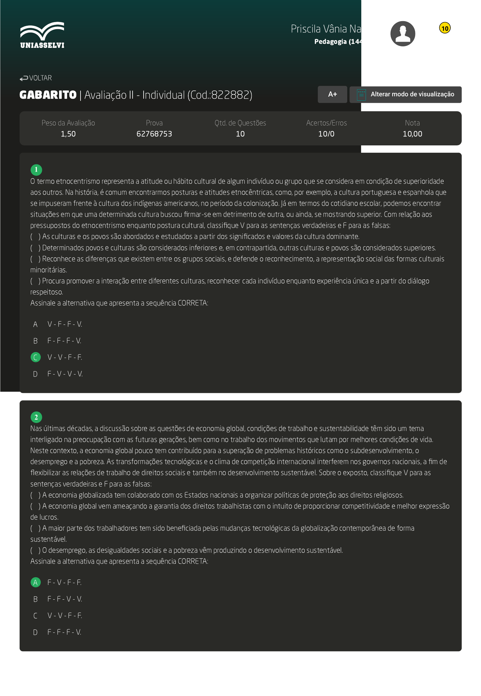16/09/23, 18:52 AVA https://ava2.uniasselvi.com.br/subject/grades-and-tests/answer-book/eyJ0ZXN0Ijp7InRlc3RDb2RlIjoiODIyODgyIiwiZGVzY3JpcHRpb24iOiJBdmFsaWHDp8OjbyBJSSAtIEluZGl2aWR1YWwiLCJwYXJhbWV0ZXIiOjU0… 1/4 GABARITO | Avaliação II - Individual (Cod.:822882) Peso da Avaliação 1,50 Prova 62768753 Qtd. de Questões 10 Acertos/Erros 10/0 Nota 10,00 O termo etnocentrismo representa a atitude ou hábito cultural de algum indivíduo ou grupo que se considera em condição de superioridade aos outros. Na história, é comum encontrarmos posturas e atitudes etnocêntricas, como, por exemplo, a cultura portuguesa e espanhola que se impuseram frente à cultura dos indígenas americanos, no período da colonização. Já em termos do cotidiano escolar, podemos encontrar situações em que uma determinada cultura buscou firmar-se em detrimento de outra, ou ainda, se mostrando superior. Com relação aos pressupostos do etnocentrismo enquanto postura cultural, classifique V para as sentenças verdadeiras e F para as falsas: ( ) As culturas e os povos são abordados e estudados a partir dos significados e valores da cultura dominante. ( ) Determinados povos e culturas são considerados inferiores e, em contrapartida, outras culturas e povos são considerados superiores. ( ) Reconhece as diferenças que existem entre os grupos sociais, e defende o reconhecimento, a representação social das formas culturais minoritárias. ( ) Procura promover a interação entre diferentes culturas, reconhecer cada indivíduo enquanto experiência única e a partir do diálogo respeitoso. Assinale a alternativa que apresenta a sequência CORRETA: A V - F - F - V. B F - F - F - V. C V - V - F - F. D F - V - V - V. Nas últimas décadas, a discussão sobre as questões de economia global, condições de trabalho e sustentabilidade têm sido um tema interligado na preocupação com as futuras gerações, bem como no trabalho dos movimentos que lutam por melhores condições de vida. Neste contexto, a economia global pouco tem contribuído para a superação de problemas históricos como o subdesenvolvimento, o desemprego e a pobreza. As transformações tecnológicas e o clima de competição internacional interferem nos governos nacionais, a fim de flexibilizar as relações de trabalho de direitos sociais e também no desenvolvimento sustentável. Sobre o exposto, classifique V para as sentenças verdadeiras e F para as falsas: ( ) A economia globalizada tem colaborado com os Estados nacionais a organizar políticas de proteção aos direitos religiosos. ( ) A economia global vem ameaçando a garantia dos direitos trabalhistas com o intuito de proporcionar competitividade e melhor expressão de lucros. ( ) A maior parte dos trabalhadores tem sido beneficiada pelas mudanças tecnológicas da globalização contemporânea de forma sustentável. ( ) O desemprego, as desigualdades sociais e a pobreza vêm produzindo o desenvolvimento sustentável. Assinale a alternativa que apresenta a sequência CORRETA: A F - V - F - F. B F - F - V - V. C V - V - F - F. D F - F - F - V. VOLTAR A+ Alterar modo de visualização 1 2 Priscila Vânia Nazario Pedagogia (1444290) 10 16/09/23, 18:52 AVA https://ava2.uniasselvi.com.br/subject/grades-and-tests/answer-book/eyJ0ZXN0Ijp7InRlc3RDb2RlIjoiODIyODgyIiwiZGVzY3JpcHRpb24iOiJBdmFsaWHDp8OjbyBJSSAtIEluZGl2aWR1YWwiLCJwYXJhbWV0ZXIiOjU0… 2/4 O projeto de uma sociedade sustentável é aquele em que o desenvolvimento está integrado à natureza, com respeito à diversidade biológica e sociocultural, exercício responsável e consequente da cidadania, com a distribuição equitativa das riquezas e em condições dignas de desenvolvimento. Aponta para uma justiça com equidade, distribuição das riquezas, eliminando-se as desigualdades sociais; para o fim da exploração dos seres humanos; para a eliminação das discriminações de gênero, raça, geração ou de qualquer outra; para garantir a todos e a todas os direitos à vida e à felicidade, à saúde, à educação, à moradia, à cultura, ao emprego e a envelhecer com dignidade; para o fim da exclusão social; para a democracia plena. Nesse contexto, classifique V para as sentenças verdadeiras e F para as falsas: ( ) Os princípios que fundamentam uma sociedade sustentável exigem a adoção de políticas públicas que entram em choque com velhos pressupostos capitalistas. ( ) O crescimento econômico e a industrialização, na concepção sustentável, são entendidos como sinônimos de desenvolvimento, desconsiderando-se o caráter finito dos recursos naturais. ( ) O processo político de construção da sustentabilidade precisa considerar formas diversas de saber sobre o meio ambiente. Não obstante, essa afirmação impõe desafios aos atuais modos de formulação e decisão política. ( ) Precisamos adotar práticas ecologicamente corretas, que respeitem o meio ambiente, não apenas explorar a riqueza que a natureza possui, mas de forma a garantir a satisfação das necessidades de hiperconsumo da população mundial. Assinale a alternativa que apresenta a sequência CORRETA: A V - F - V - F. B F - F - V - V. C F - V - F - V. D V - V - F - F. A relação estabelecida entre indivíduos de diferentes culturas nem sempre se dá de forma respeitosa e tolerante. Há um conceito que explica o posicionamento de um indivíduo que se considera superior aos demais indivíduos pertencentes às culturas diferentes. Como esse conceito é comumente identificado? A Leninismo. B Narcisismo. C Marxismo. D Etnocentrismo. Se por um lado vivemos em um período em que as pessoas têm como meta consumir, por outro lado, há a necessidade de termos matérias- primas suficientes para atender às necessidades humanas. No entanto, muitas das matérias-primas não serão suficientes para atender à grande demanda de consumo, além de haver recursos que não são renováveis. Sobre a necessidade de conservar recursos que não são renováveis, classifi