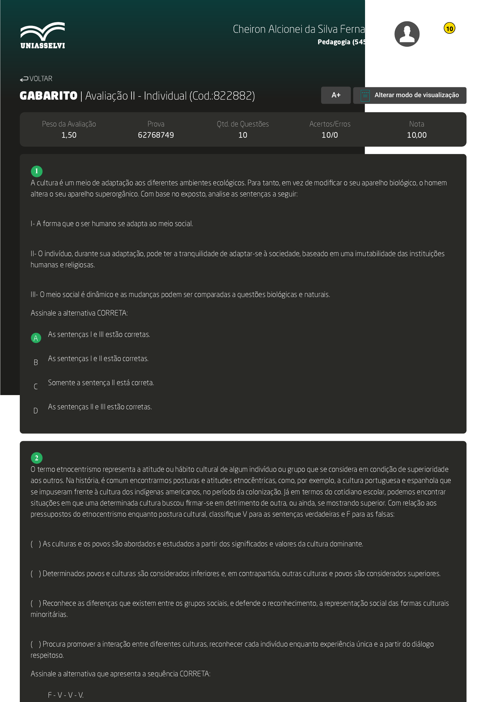 16/09/23, 19:35 AVA https://ava2.uniasselvi.com.br/subject/grades-and-tests/answer-book/eyJ0ZXN0Ijp7InRlc3RDb2RlIjoiODIyODgyIiwiZGVzY3JpcHRpb24iOiJBdmFsaWHDp8OjbyBJSSAtIEluZGl2aWR1YWwiLCJwYXJhbWV0ZXIiOjU0… 1/6 GABARITO | Avaliação II - Individual (Cod.:822882) Peso da Avaliação 1,50 Prova 62768749 Qtd. de Questões 10 Acertos/Erros 10/0 Nota 10,00 A cultura é um meio de adaptação aos diferentes ambientes ecológicos. Para tanto, em vez de modificar o seu aparelho biológico, o homem altera o seu aparelho superorgânico. Com base no exposto, analise as sentenças a seguir: I- A forma que o ser humano se adapta ao meio social. II- O indivíduo, durante sua adaptação, pode ter a tranquilidade de adaptar-se à sociedade, baseado em uma imutabilidade das instituições humanas e religiosas. III- O meio social é dinâmico e as mudanças podem ser comparadas a questões biológicas e naturais. Assinale a alternativa CORRETA: A As sentenças I e III estão corretas. B As sentenças I e II estão corretas. C Somente a sentença II está correta. D As sentenças II e III estão corretas. O termo etnocentrismo representa a atitude ou hábito cultural de algum indivíduo ou grupo que se considera em condição de superioridade aos outros. Na história, é comum encontrarmos posturas e atitudes etnocêntricas, como, por exemplo, a cultura portuguesa e espanhola que se impuseram frente à cultura dos indígenas americanos, no período da colonização. Já em termos do cotidiano escolar, podemos encontrar situações em que uma determinada cultura buscou firmar-se em detrimento de outra, ou ainda, se mostrando superior. Com relação aos pressupostos do etnocentrismo enquanto postura cultural, classifique V para as sentenças verdadeiras e F para as falsas: ( ) As culturas e os povos são abordados e estudados a partir dos significados e valores da cultura dominante. ( ) Determinados povos e culturas são considerados inferiores e, em contrapartida, outras culturas e povos são considerados superiores. ( ) Reconhece as diferenças que existem entre os grupos sociais, e defende o reconhecimento, a representação social das formas culturais minoritárias. ( ) Procura promover a interação entre diferentes culturas, reconhecer cada indivíduo enquanto experiência única e a partir do diálogo respeitoso. Assinale a alternativa que apresenta a sequência CORRETA: F - V - V - V. VOLTAR A+ Alterar modo de visualização 1 2 Cheiron Alcionei da Silva Fernandes Pedagogia (5453985) 10 16/09/23, 19:35 AVA https://ava2.uniasselvi.com.br/subject/grades-and-tests/answer-book/eyJ0ZXN0Ijp7InRlc3RDb2RlIjoiODIyODgyIiwiZGVzY3JpcHRpb24iOiJBdmFsaWHDp8OjbyBJSSAtIEluZGl2aWR1YWwiLCJwYXJhbWV0ZXIiOjU0… 2/6 A B F - F - F - V. C V - V - F - F. D V - F - F - V. O conceito de cultura gera controvérsias diante da complexidade e das múltiplas possibilidades de explicar o comportamento humano. Por exemplo, é possível citar a ideia de cultura medieval, cultura pós-moderna e cultura do trabalho. Nesses casos, a palavra cultura terá dimensões diferentes. Alguns teóricos descrevem que a noção de cultura será delimitada a partir de características históricas, sociais, expressões, linguagens, sentidos e manifestações de uma sociedade específica, independente de qual for a sociedade observada. Então, em qualquer grupo ou sociedade, sem exceção, haverá cultura. Com relação à ideia de cultura, analise as afirmativas a seguir: I- A cultura é um meio de estabelecer as ações do homem em uma determinada sociedade. II- A cultura em nada interfere nos ambientes internacionais, pois é específico de um povo. III- O contexto biológico continua sendo o princípio norteador das ações humanas. IV- Ao longo da história, os instintos e sentimentos foram excluídos do contexto cultural. Assinale a alternativa CORRETA: A As afirmativas II e III estão corretas. B Somente a afirmativa I está correta. C As afirmativas I e IV estão corretas. D Somente a afirmativa III está correta. Nas últimas décadas, a discussão sobre as questões de economia global, condições de trabalho e sustentabilidade têm sido um tema interligado na preocupação com as futuras gerações, bem como no trabalho dos movimentos que lutam por melhores condições de vida. Neste contexto, a economia global pouco tem contribuído para a superação de problemas históricos como o subdesenvolvimento, o desemprego e a pobreza. As transformações tecnológicas e o clima de competição internacional interferem nos governos nacionais, a fim de flexibilizar as relações de trabalho de direitos sociais e também no desenvolvimento sustentável. Sobre o exposto, classifique V para as sentenças verdadeiras e F para as falsas: ( ) A economia globalizada tem colaborado com os Estados nacionais a organizar políticas de proteção aos direitos religiosos. ( ) A economia global vem ameaçando a garantia dos direitos trabalhistas com o intuito de proporcionar competitividade e melhor expressão de lucros. ( ) A maior parte dos trabalhadores tem sido beneficiada pelas mudanças tecnológicas da globalização contemporânea de forma sustentável. ( ) O desemprego, as desigualdades sociais e a pobreza vêm produzindo o desenvolvimento sustentável. Assinale a alternativa que apresenta a sequência CORRETA: 3 4 Cheiron Alcionei da Silva Fernandes Pedagogia (5453985) 10 16/09/23, 19:35 AVA https://ava2.uniasselvi.com.br/subject/grades-and-tests/answer-book/eyJ0ZXN0Ijp7InRlc3RDb2RlIjoiODIyODgyIiwiZGVzY3JpcHRpb24iOiJBdmFsaWHDp8OjbyBJSSAtIEluZGl2aWR1YWwiLCJwYXJhbWV0ZXIiOjU0… 3/6 A V - V - F - F. B F - V - F - F. C F - F - F - V. D F - F - V - V. Alfred Kroeber (1876-1960), antropólogo americano, em seu artigo "O superorgânico" mostrou como a cultura atua sobre o homem, ao mesmo tempo em que se preocupou com a discussão de uma série de pontos controvertidos, pois suas explicações contrariam o conjunto de crenças populares. Iniciou, como o tí