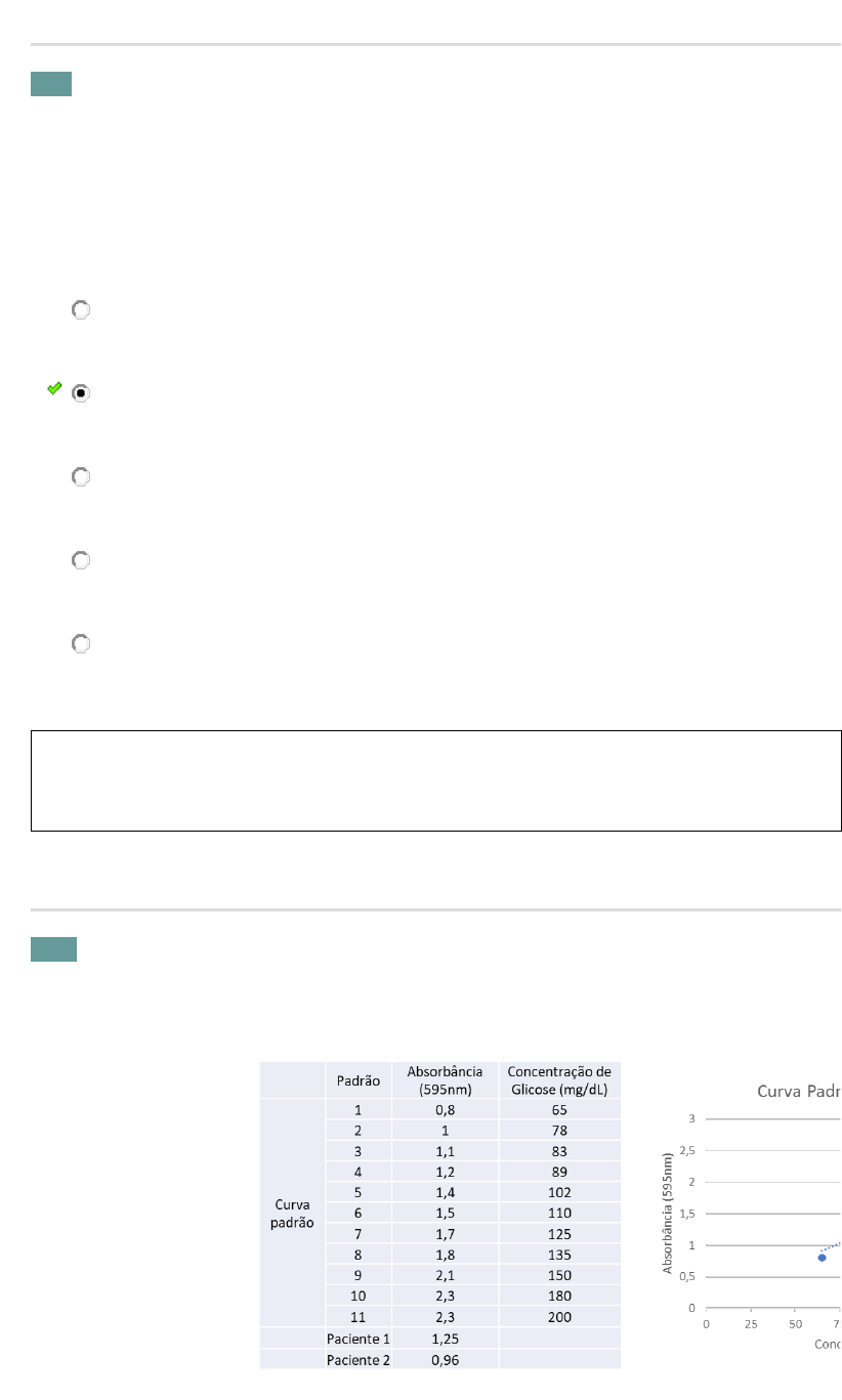 1. (Adaptado de Prefeitura Municipal de Várzea Grande UFMT - 2018) Nos testes laboratoriais com boa precisão e exatidão e realizados com amostras-controle de concentrações corretas, quase todos os resultados das amostras-controle ficam entre os limites de ± 2 desvios padrão (DP), distribuídos aproximadamente a metade de cada lado da média, sendo dois terços situados entre ± 1 DP. No entanto, uma amostra-controle que apresenta mais de cinco dosagens consecutivas próximas ao limite de +2 DP indica: tendência positiva. perda de exatidão. perda de precisão e exatidão. perda de precisão. Boa exatidão e precisão. Data Resp.: 17/09/2023 10:30:16 Explicação: A resposta certa é: perda de exatidão. 2. O técnico do laboratório que você gerencia solicitou sua ajuda para calcular manualmente a concentração aproximada de glicose de dois pacientes com base na curva padrão e equação da reta a seguir: Qual opção apresenta a opção correta da concentração de glicose aproximada? Paciente 1: 112,5mg/dL; Paciente 2: 115,4mg/dL. Paciente 1: 125mg/dL; Paciente 2: 96mg/dL. Paciente 1: 91,1mg/dL; Paciente 2: 69,9mg/dL. Paciente 1: 193,4mg/dL; Paciente 2: 168,9mg/dL. Paciente 1: 130mg/dL; Paciente 2: 100mg/dL. Data Resp.: 17/09/2023 10:31:54 Explicação: A resposta certa é: Paciente 1: 91,1mg/dL; Paciente 2: 69,9mg/dL. DIAGNÓSTICO LABORATORIAL I 3. A Bordetella pertussis, a bactéria causadora da coqueluche, apresenta uma característica distintiva na coloração de Gram. Qual é a característica distintiva na coloração Gram da Bordetella pertussis e qual técnica laboratorial é recomendada para acelerar o diagnóstico dessa infecção? Células gram-negativas; cultura em Ágar Bordet & Gengou. Células gram-negativas; cultura em Ágar Regan-Lowe. Células gram-positivas; teste sorológico. Células gram-positivas; cultura em meio de ágar simples. Células gram-positivas; diagnóstico molecular pela PCR. Data Resp.: 17/09/2023 10:33:18 Explicação: As células bacterianas da Bordetella pertussis se coram fracamente pelo Gram, e é recomendado deixar o último corante por dois minutos. Além disso, por conta da demora para cultivar B. pertussis em laboratório, é recomendado aplicar técnicas que acelerem o diagnóstico, como o diagnóstico molecular pela PCR. As demais opções não estão de acordo com as características da bactéria ou das técnicas laboratoriais mencionadas. 4. Apesar dos antimicrobianos existentes, da melhora das condições sanitárias e das medidas de controle de infecção hospitalar, os estafilococos continuam sendo um dos patógenos que mais afetam o homem. Indivíduos sadios são colonizados intermitentemente por Staphylococcus aureus, mas, a partir de sítios específicos, podem contaminar a pele e membranas mucosas de pacientes em hospitais por contato direto ou ocasionar infecções letais dados os fatores de virulência ou de resistência aos antimicrobianos atualmente utilizados, como a vancomicina. Em contrapartida, os estreptococos foram os maiores causadores de infecção hospitalar na era pré-antibiótica, tendo causado surtos de infecção e morte de puérperas. Eles provocam, ainda hoje, doenças muito graves e muitas vezes letais, mesmo em pacientes imunocompetentes. BRASIL. Agência Nacional de Vigilância Sanitária. Microbiologia Clínica para o Controle de Infecção Relacionada à Assistência à Saúde. Brasília, 2013 (adaptado). Com relação aos microrganismos mencionados no texto, avalie as afirmações a seguir. I. A identificação dos estreptococos, em forma de cocos aos pares, em cachos de uva ou agrupados, e dos estafilococos, em forma de cadeia longa, pode ser realizada por meio da microscopia. II. A prova da catalase em lâmina geralmente apresenta resultado positivo para estafilococos e negativa para estreptococos, permitindo sua diferenciação. III. As colônias de Staphylococcus aureus mostram-se com coloração amarela, enquanto as colônias de estreptococos apresentam halos de hemólise total ou parcial (beta e alfa hemólise), ou nenhuma. É correto o que se afirma em: I e II, apenas. III, apenas. II e III, apenas. I, apenas. I, II e III. Data Resp.: 17/09/2023 10:34:36 Explicação: A resposta correta é: II e III, apenas. DIAGNÓSTICO LABORATORIAL II 5. Durante o crescimento bacteriano no processo de coprocultura é preciso de uma confirmação para o enteropatógeno através de testes bioquímicos. Qual o teste que analisa o metabolismo bacteriano para obtenção de energia por via oxidativa ou fermentativa: Teste de oxidase Fermentação de açúcares Degradação de Ureia Prova vermelho de metila Produção de Indol Data Resp.: 17/09/2023 10:37:30 Explicação: Esse teste é utilizado para saber qual é o metabolismo bacteriano para obtenção de energia: via oxidativa (aeróbica) ou via fermentativa (anaeróbica). Para isso, podem ser utilizadas diferentes fontes de açúcares, como a glicose, a sacarose e a lactose. Bactérias que realizam a fermentação obtêm menos energia e produzem um ácido como produto do seu metabolismo, com possível formação de gás. 6. Analise as afirmativas abaixo com relação a coleta de sangue para o processo de hemocultura e assinale a alternativa correta. I. O sangue para hemocultura pode ser coletado através de punção venosa com agulha seringa ou a vácuo. II. Não é recomendado que o sangue seja coletado de catete. III. A coleta pode ser realizada antes e depois da administração do antibiótico, caso paciente esteja tomando. Somente a afirmativa II é verdadeira. Somente as afirmativas I e III são verdadeiras. Somente as afirmativas I e II são verdadeiras. Somente a afirmativa I é verdadeira. Somente a afirmativa III é verdadeira. Data Resp.: 17/09/2023 10:39:05 Explicação: A coleta, sempre que possível, deve ser realizada antes da antibioticoterapia (para não ocorrer morte bacteriana antes da sua detecção), antes do pico febril (pois, a febre 