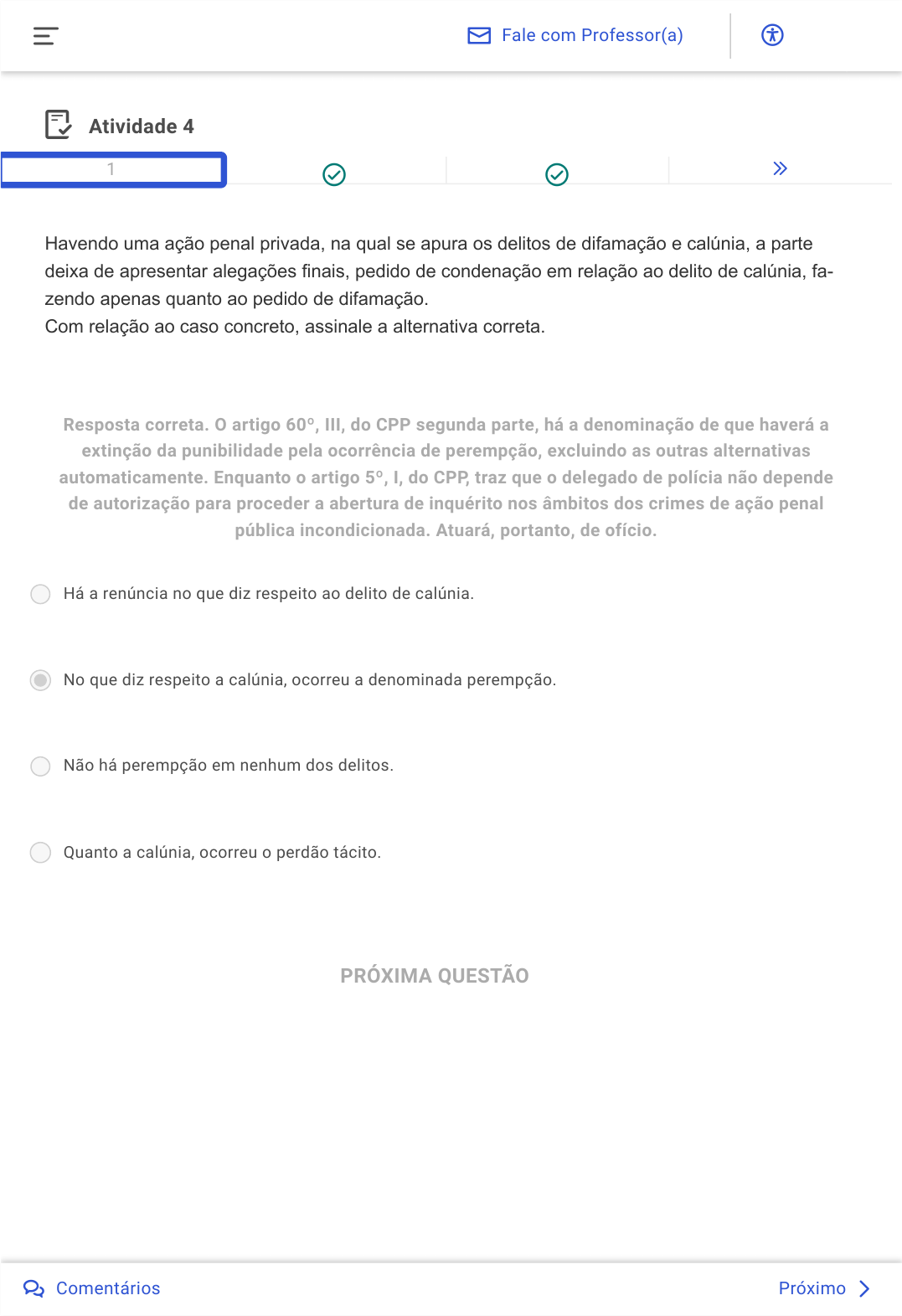 11/06/2023, 23:34 UNP - Salgado Filho - 765 https://student.ulife.com.br/ContentPlayer/Index?lc=0KsuIUzegRHxGcRYOCbwJQ%3d%3d&l=8Vz0wVjqYPpLye7Rp6Sh3A%3d%3d&cd=66yeiB… 1/1 Atividade 4 Havendo uma ação penal privada, na qual se apura os delitos de difamação e calúnia, a parte deixa de apresentar alegações finais, pedido de condenação em relação ao delito de calúnia, fa- zendo apenas quanto ao pedido de difamação. Com relação ao caso concreto, assinale a alternativa correta. Resposta correta. O artigo 60º, III, do CPP segunda parte, há a denominação de que haverá a extinção da punibilidade pela ocorrência de perempção, excluindo as outras alternativas automaticamente. Enquanto o artigo 5º, I, do CPP, traz que o delegado de polícia não depende de autorização para proceder a abertura de inquérito nos âmbitos dos crimes de ação penal pública incondicionada. Atuará, portanto, de ofício. Há a renúncia no que diz respeito ao delito de calúnia. No que diz respeito a calúnia, ocorreu a denominada perempção. Não há perempção em nenhum dos delitos. Quanto a calúnia, ocorreu o perdão tácito. PRÓXIMA QUESTÃO Próximo 1 Fale com Professor(a) Comentários 11/06/2023, 23:35 UNP - Salgado Filho - 765 https://student.ulife.com.br/ContentPlayer/Index?lc=0KsuIUzegRHxGcRYOCbwJQ%3d%3d&l=8Vz0wVjqYPpLye7Rp6Sh3A%3d%3d&cd=66yeiB… 1/1 Atividade 4 No que tange ao inquérito policial, analise as alternativas, a seguir, e assinale a INCORRETA. Resposta correta. Sua resposta está correta, pois, por se tratar de uma ação penal privada, em regra, o ofendido será titular dessa ação, sendo que, em casos excepcionais, será o seu representante legal. Essa normativa está prevista no § 2º do art. 100º do CP; já o art. 5º, do CCP, trará o rol de como se inicia o inquérito policial. O inquérito policial, nos crimes em que a própria ação for dependente de representação, não poderá ser iniciado sem ela. Quando se tratar de ação penal privada, não caberá a instauração de inquérito policial, somente a lavratura de termo circunstanciado. O inquérito policial, ainda que em crimes hediondos, pode ser dispensável para oferecimento de denúncia. O inquérito penal poderá ser instaurado de ofício, pela autoridade Policial nos crimes persequíveis por ação penal pública incondicionada. PRÓXIMA QUESTÃO Próximo 2 Fale com Professor(a) Comentários 11/06/2023, 23:35 UNP - Salgado Filho - 765 https://student.ulife.com.br/ContentPlayer/Index?lc=0KsuIUzegRHxGcRYOCbwJQ%3d%3d&l=8Vz0wVjqYPpLye7Rp6Sh3A%3d%3d&cd=66yeiB… 1/1 Atividade 4 Ricardo foi eleito para o cargo de direção da Comissão Interna de Prevenção de Acidentes, a CIPA, de sua empregadora, a Telefonia Kiparada. Seu mandato termina em dezembro de 2020. Entretanto, em razão da crise financeira, a empresa encerrará todas as suas atividades, fechando o local de trabalho de Ricardo. Com o fechamento da empresa, todos os contratos de trabalho serão rescindidos, inclusive o de Ricardo. Nessa hipótese, assinale a alternativa correta com rela- ção à dispensa de Ricardo: Resposta correta. A alternativa está correta, pois, de acordo com a Súmula 339, do TST, II, a estabilidade provisória do cipeiro assegura uma garantia para os membros da CIPA e não é pessoal. Ou seja, extinto o estabelecimento, não há dispensa arbitrária. Assim, é importante entender que a estabilidade é para o caso de existir uma empresa com uma Comissão Interna, favorecendo, desse modo, os membros, e não as pessoas. Será considerada arbitrária, pois o empregador em hipótese alguma poderá dispensar qualquer empregado da CIPA. Não será arbitrária, uma vez que a estabilidade desse membro não é considerada vantagem pessoal, mas uma garantia para o exercício de sua atividade. Será considerada arbitrária, visto que o empregador poderá suspender o contrato de trabalho do cipeiro. Será considerada arbitrária, pois cipeiro é um cargo vitalício. PRÓXIMA QUESTÃO Próximo 3 Resposta correta Fale com Professor(a) Comentários 11/06/2023, 23:35 UNP - Salgado Filho - 765 https://student.ulife.com.br/ContentPlayer/Index?lc=0KsuIUzegRHxGcRYOCbwJQ%3d%3d&l=8Vz0wVjqYPpLye7Rp6Sh3A%3d%3d&cd=66yeiB… 1/1 Atividade 4 Um processo pode ser extinto com a resolução de mérito quando: Resposta correta. A prescrição e a decadência são matérias de mérito, de acordo com o art. 487, II, do CPC, fazendo com que as outras alternativas sejam excluídas automaticamente. a sentença reconhecer a prescrição ou a decadência. a sentença acolher a alegação de coisa julgada. apenas a sentença rejeitar ou acolher, totalmente ou parcialmente, o pedido do autor. a sentença reconhecer confusão entre autor e réu. PRÓXIMA QUESTÃO Próximo 4 Fale com Professor(a) Comentários 11/06/2023, 23:35 UNP - Salgado Filho - 765 https://student.ulife.com.br/ContentPlayer/Index?lc=0KsuIUzegRHxGcRYOCbwJQ%3d%3d&l=8Vz0wVjqYPpLye7Rp6Sh3A%3d%3d&cd=66yeiB… 1/1 Atividade 4 Quanto ao interrogatório no Processo Penal, analise as alternativas e assinale a correta. Resposta correta. De acordo com os artigos 185º a 196º do CPP, o interrogatório pode ser considerado tanto meio de defesa quanto fonte de prova. O interrogatório constitui meio de defesa e as declarações prestadas pelo acusado podem servir como fonte de prova. Trata-se, exclusivamente, de meio de prova. Somente a autodefesa é exercida quando se presta declarações em interrogatório. A defesa técnica não pode se manifestar quando o interrogatório for realizado. PRÓXIMA QUESTÃO Próximo 5 Resposta correta Fale com Professor(a) Comentários 11/06/2023, 23:35 UNP - Salgado Filho - 765 https://student.ulife.com.br/ContentPlayer/Index?lc=0KsuIUzegRHxGcRYOCbwJQ%3d%3d&l=8Vz0wVjqYPpLye7Rp6Sh3A%3d%3d&cd=66yeiB… 1/1 Atividade 4 OAB-EXAME UNIFICADO- 2013.1- Em reclamação trabalhista movida contra um município, este não comparece à audiência inaugural. Diante dessa hip
