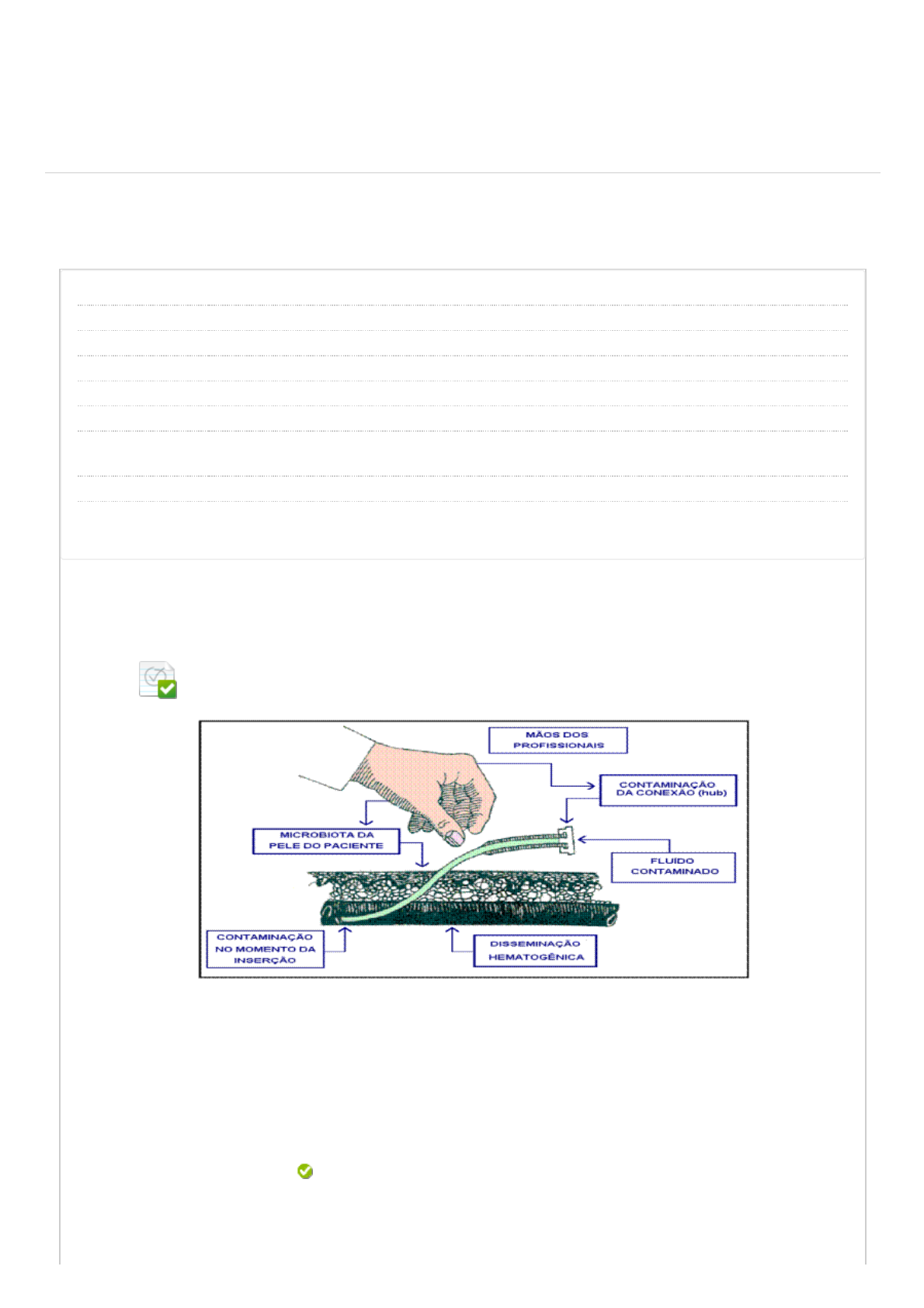28/10/2022 15:24 Revisar envio do teste: QUESTIONÁRIO UNIDADE II – ... https://ava.ead.unip.br/webapps/assessment/review/review.jsp?attempt_id=_87667470_1&course_id=_252891_1&content_id=_3072593_1&retur… 1/7 Revisar envio do teste: QUESTIONÁRIO UNIDADE II PREVENÇÃO E CONTROLE DE INFECÇÃO EM INSTITUIÇÃO DE SAUDE 7463-30_44701_R_F1_20222 CONTEÚDO Usuário ALESSANDRA MARIA DA SILVA Curso PREVENÇÃO E CONTROLE DE INFECÇÃO EM INSTITUIÇÃO DE SAUDE Teste QUESTIONÁRIO UNIDADE II Iniciado 28/10/22 16:09 Enviado 28/10/22 16:24 Status Completada Resultado da tentativa 5 em 5 pontos Tempo decorrido 14 minutos Resultados exibidos Todas as respostas, Respostas enviadas, Respostas corretas, Comentários, Perguntas respondidas incorretamente Pergunta 1 Resposta Selecionada: e. Respostas: a. A �gura a seguir representa as prováveis fontes de disseminação das Infecções Primárias da Corrente Sanguínea (IPCS): Fonte: Brasil. Ministério da Saúde. Agência Nacional de Vigilância Sanitária. Infecção de Corrente Sanguínea. Orientações para Prevenção de Infecção Primária de Corrente Sanguínea. Brasília: Ministério da Saúde, 2010. p. 53. Alguns autores e instituições utilizam as IPCS relacionadas ao uso de Cateter Venoso Central (CVC) como um critério marcador de qualidade dos cuidados prestados na assistência, dessa forma torna-se relevante conhecer a origem das fontes de infecções relacionadas ao acesso vascular. Assinale a alternativa correta sobre essas fontes: Todas as a�rmativas anteriores estão corretas . Contaminação do cateter no momento de sua inserção. UNIP EAD BIBLIOTECAS MURAL DO ALUNO TUTORIAISCONTEÚDOS ACADÊMICOS 0,5 em 0,5 pontos http://company.blackboard.com/ https://ava.ead.unip.br/webapps/blackboard/execute/courseMain?course_id=_252891_1 https://ava.ead.unip.br/webapps/blackboard/content/listContent.jsp?course_id=_252891_1&content_id=_3072244_1&mode=reset https://ava.ead.unip.br/webapps/portal/execute/tabs/tabAction?tab_tab_group_id=_10_1 https://ava.ead.unip.br/webapps/portal/execute/tabs/tabAction?tab_tab_group_id=_27_1 https://ava.ead.unip.br/webapps/portal/execute/tabs/tabAction?tab_tab_group_id=_47_1 https://ava.ead.unip.br/webapps/portal/execute/tabs/tabAction?tab_tab_group_id=_29_1 https://ava.ead.unip.br/webapps/portal/execute/tabs/tabAction?tab_tab_group_id=_25_1 https://ava.ead.unip.br/webapps/login/?action=logout 28/10/2022 15:24 Revisar envio do teste: QUESTIONÁRIO UNIDADE II – ... https://ava.ead.unip.br/webapps/assessment/review/review.jsp?attempt_id=_87667470_1&course_id=_252891_1&content_id=_3072593_1&retur… 2/7 b. c. d. e. Comentário da resposta: Colonização da pele peri-orifício. Contaminação do canhão. Contaminação das soluções infundidas e das soluções utilizadas para manter o cateter permeável. Todas as a�rmativas anteriores estão corretas. Resposta: E Comentário: Encontramos na literatura que pode ocorrer a contaminação do cateter no momento de sua inserção; a colonização da pele peri-orifício ao redor do cateter; a contaminação do canhão ao ser manipulado, por exemplo, para infusão de medicamentos e; a contaminação das soluções infundidas e das soluções utilizadas para manter o cateter permeável, como prováveis fontes de infecções relacionadas ao acesso vascular. Pergunta 2 Resposta Selecionada: d. Respostas: a. A �gura abaixo é o logotipo da campanha Protecting 5 Million Lives / Campanha 5 milhões de vida da National Healthcare Safety Network (NHSN): Fonte: 5 Million Lives Campaign. Getting Started Kit: Prevente Central Line Infectionos How-to Guide. Cambridge, MA: Institute for Helthcare Improvemente; 2008. (Disponível em: www.ihi.org) A NHSN lançou a campanha Protecting 5 Million Lives, que constitui um grupo de intervenções baseadas em evidência para pacientes com CVC que, quando adotadas conjuntamente obtém melhores resultados que quando adotadas individualmente. Na infecção nosocomial relacionada ao acesso vascular, a maioria dos casos de �ebite, relacionados a cateteres periféricos, ocorrem devido a uma reação físico-química, que se instala geralmente após dois a três dias da colocação do dispositivo. Existem alguns fatores que podem estar relacionados a esses casos. Considere as seguintes a�rmações: I- O tempo de permanência com o cateter periférico. II- O local de punção, pois algumas localizações não permitem a movimentação do paciente e por falta de mobilidade facilitam o aparecimento da �ebite. III- Composição e pH da solução infundida. IV- Realização de procedimentos como: veri�cação de PA, temperatura e administração de medicações intramusculares no membro superior onde está inserido o cateter. V- A técnica utilizada na instalação do cateter. Estão corretas as alternativas que se a�rmam em: I, II, III e V. I e II. 0,5 em 0,5 pontos http://www.ihi.org/ 28/10/2022 15:24 Revisar envio do teste: QUESTIONÁRIO UNIDADE II – ... https://ava.ead.unip.br/webapps/assessment/review/review.jsp?attempt_id=_87667470_1&course_id=_252891_1&content_id=_3072593_1&retur… 3/7 b. c. d. e. Comentário da resposta: II e III. I, III e IV. I, II, III e V. Todas as alternativas estão corretas. Resposta: D Comentário: A realização de procedimentos como: veri�cação de PA, temperatura e administração de medicações intramusculares no membro superior onde está inserido o cateter, não tem nenhum impacto sobre as infecções de corrente sanguínea. Todas as outras alternativas são medidas que tem impacto na instalação da infecção de corrente sanguínea relacionada ao CVC. Pergunta 3 Resposta Selecionada: b. Respostas: a. b. c. d. e. Comentário da resposta: As infecções primárias da corrente sanguínea (IPCS) estão entre as mais comumente relacionadas à assistência à saúde. Estima-se que cerca de 60% das bacteremias nosocomiais estejam associadas a algum dispositivo intravascular. Em casos extremos,