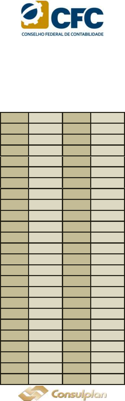 GGAABBAARRIITTOO PPÓÓSS--RREECCUURRSSOOSS –– EXAME DE SUFICIÊNCIA COMO REQUISITO PARA OBTENÇÃO DE REGISTRO PROFISSIONAL EM CONSELHO REGIONAL DE CONTABILIDADE (CRC) As questões com # foram anuladas; As questões em negrito tiveram a alternativa de resposta alterada; As demais permaneceram inalteradas. CURSO: BACHARELADO EM CIÊNCIAS CONTÁBEIS (TIPO 01 – BRANCA) 01 # 26 A 02 C 27 B 03 C 28 B 04 # 29 # 05 C 30 A 06 # 31 C 07 A 32 C 08 C 33 A 09 A 34 B 10 A 35 D 11 # 36 D 12 D 37 A 13 C 38 C 14 B 39 A 15 # 40 A 16 B 41 B 17 A 42 D 18 B 43 D 19 A 44 A 20 D 45 A 21 A 46 D 22 C 47 C 23 C 48 C 24 B 49 D 25 C 50 B GGAABBAARRIITTOO PPÓÓSS--RREECCUURRSSOOSS –– EXAME DE SUFICIÊNCIA COMO REQUISITO PARA OBTENÇÃO DE REGISTRO PROFISSIONAL EM CONSELHO REGIONAL DE CONTABILIDADE (CRC) CURSO: BACHARELADO EM CIÊNCIAS CONTÁBEIS (TIPO 02 – VERDE) 01 A 26 C 02 # 27 B 03 C 28 # 04 A 29 A 05 C 30 B 06 C 31 C 07 # 32 C 08 C 33 B 09 # 34 D 10 D 35 D 11 B 36 A 12 A 37 A 13 # 38 A 14 C 39 A 15 A 40 C 16 # 41 A 17 B 42 D 18 D 43 D 19 A 44 B 20 B 45 D 21 A 46 A 22 C 47 C 23 B 48 C 24 C 49 B 25 A 50 D GGAABBAARRIITTOO PPÓÓSS--RREECCUURRSSOOSS –– EXAME DE SUFICIÊNCIA COMO REQUISITO PARA OBTENÇÃO DE REGISTRO PROFISSIONAL EM CONSELHO REGIONAL DE CONTABILIDADE (CRC) CURSO: BACHARELADO EM CIÊNCIAS CONTÁBEIS (TIPO 03 – AMARELA) 01 # 26 A 02 # 27 B 03 C 28 A 04 C 29 B 05 A 30 # 06 # 31 C 07 C 32 C 08 C 33 D 09 A 34 D 10 C 35 A 11 A 36 B 12 B 37 C 13 # 38 A 14 D 39 A 15 B 40 A 16 # 41 D 17 A 42 B 18 A 43 A 19 B 44 D 20 A 45 D 21 D 46 A 22 C 47 C 23 C 48 C 24 B 49 D 25 C 50 B GGAABBAARRIITTOO PPÓÓSS--RREECCUURRSSOOSS –– EXAME DE SUFICIÊNCIA COMO REQUISITO PARA OBTENÇÃO DE REGISTRO PROFISSIONAL EM CONSELHO REGIONAL DE CONTABILIDADE (CRC) CURSO: BACHARELADO EM CIÊNCIAS CONTÁBEIS (TIPO 04 – AZUL) 01 C 26 C 02 C 27 B 03 # 28 A 04 # 29 # 05 A 30 B 06 C 31 C 07 C 32 C 08 A 33 B 09 # 34 D 10 A 35 A 11 B 36 D 12 C 37 A 13 D 38 A 14 # 39 C 15 B 40 A 16 # 41 D 17 A 42 D 18 A 43 A 19 D 44 B 20 A 45 D 21 B 46 A 22 B 47 C 23 C 48 C 24 C 49 B 25 A 50 D