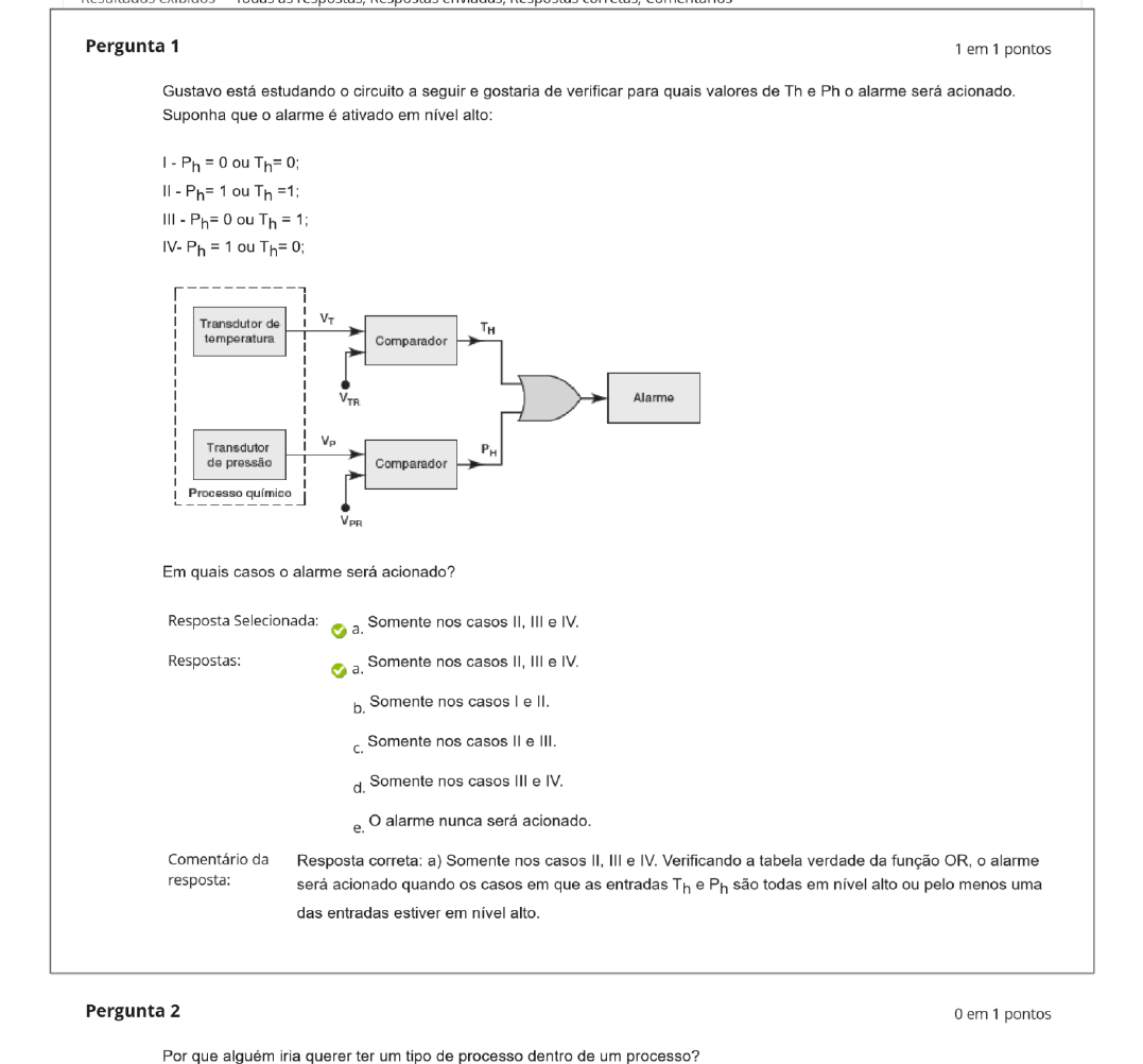 A principal razão para se ter threads é que, em muitas aplicações, múltiplas atividades estão ocorrendo simultaneamente, e algumas delas podem ser bloqueadas de tempos em tempos. Ao decompormos uma aplicação dessas em múltiplos threads sequenciais, que são executados em quase paralelo, o modelo de programação torna-se mais simples. Mediante a leitura do texto, podemos inferir, sobre o uso de multi-threads, que: Resposta Selecionada: Respostas: Comentário da resposta: e. a utilização de threads não altera o desempenho da CPU. a. com sua utilização, o usuário certamente perceberia os processos com um desempenho mais lento. b. proporciona aumento na eficiência, pois, tendo suporte para trabalhar com múltiplas threads, é mais provável que a CPU execute mais programas ao mesmo tempo. c. proporciona diminuição na eficiência, pois, tendo suporte para trabalhar com múltiplas threads, é mais provável que a CPU execute menos programas ao mesmo tempo. d. o contexto para a existência dos threads é que, como eles são mais pesados do que os processos, são mais fáceis (isto é, mais rápidos) de seremaumentados. e. a utilização de threads não altera o desempenho da CPU. Resposta correta: b) Proporciona aumento na eficiência, pois, tendo suporte para trabalhar com múltiplas threads, é mais provável que a CPU execute mais programas ao mesmo tempo. As threads compartilham os recursos do processo e são capazes de ser executadas de forma independente. Logo, processadores multi-thread são mais vantajosos, já que dão a possibilidade de operar em diversas frentes ao mesmo tempo. Pergunta 3 0 em 1 pontos Leia atentamente estas asserções: I - É um tipo de memória que armazena os dados e as instruções mais utilizadas pelo processador, permitindo que sejamacessadas rapidamente. II - Dispositivo de persistência volátil, onde ficam armazenados os programas que estão sendo executados. III - Tipo de memória que permite apenas a leitura. IV - Dispositivo para a gravação de dados permanentes. Colunas: ( ) Disco rígido – HD ( ) Memória cache ( ) Memória RAM ( ) Memória ROM Após a leitura das asserções I, II, III e IV, podemos aferir que a sequência correta, de cima para baixo, é: Resposta Selecionada: b. IV, I, III e II. Respostas: a. IV, II, III, I. b. IV, I, III e II. c. III, II, I, IV. d. III, IV, I, II. e. IV, I, II e III. Comentário Resposta correta: e) IV, I, II e III. O dispositivo para a gravação de dados permanentes é chamado de HD ou da resposta: disco rígido. A memória cachê é um tipo de memória que armazena os dados e as instruções mais utilizadas pelo processador, permitindo que essas sejam acessadas rapidamente. Dispositivo de persistência volátil, onde ficam armazenados os programas que estão sendo executados. A ROM é um tipo de memória que permite apenas a leitura. Portanto, a sequência correta será IV, I, II e III. Pergunta 4 1 em 1 pontos Para um determinado processo químico descrito na figura a seguir, utilizaram-se dois transdutores de entrada e dois comparadores de saída do comparador, representados pelas variáveis de entrada Th e Ph. VTR e VPR são os valores de temperatura e pressão de referência. Observando a figura com atenção, pode-se perceber que o estado lógico de saída resultante deverá ou não acionar o alarme. Qual função lógica de saída representa o sistema digital anterior? Selecionada:Th + Ph Resposta e. Respostas: Th x Ph a. b. h x Ph) (T c. h x Ph2) (T d. h + Ph) (T e. h + Ph T Comentário da Resposta correta: e) Th + Ph. As variáveis Th e Ph passam por uma porta OR, logo a função de saída resposta: para o alrme será Th + Ph. Pergunta 5 1 em 1 pontos Jane ganhou seu primeiro Personal Computerum IBM’s System/360 de seu avô. Considerando as características de hardware da época, qual a tecnologia que esse computador utilizava? Selecionada:Circuito integrado. Resposta e. Os circuitos integrados marcaram a 3ª geração dos computadores, e suas tecnologias possibilitaram, posteriormente, a criação dos computadores pessoais. Pergunta 6 1 em 1 pontos Alberto é um aluno curioso de computação, que está estudando sistemas binários. Em um dado momento, ele descobre que é possível representar uma números utilizando uma certa quantidade de bits. Sendo assim, ajude Alberto a representar valores decimais na faixa de 0 a 12.500 e responda: Qual o número mínimo de bytes que ele utilizará para representar esses valores decimais? Resposta Selecionada: d. 2bytes. Respostas: a. 13 bits. b. 11 bits. c. 10 bytes. d. 2bytes. Respostas: Comentário da resposta: a. Válvulas e bobinas. b. Transistores. c. Cartão perfurado. d. Microprocessadores. e. Circuito integrado. Resposta correta: e) Circuito integrado. e. 8 bits. Comentário da resposta: Resposta correta: d) 2 bytes. Usando 13 bits, podemos contar, em decimal, de 0 a 213 – 1 = 8191. Usando 14 bits, podemos contar de 0 a 214 – 1 = 16.383. Evidentemente, 13 bits não são suficientes, porém, com 14 bits, podemos ir além de 12.500. Assim, o número necessário de bits é 14. Como cada 1 byte tem 8 bits, Alberto precisará de pelo menos 2 bytes. Pergunta 7 0 em 1 pontos De acordo com TOCCI (2011) circuitos digitais denominados portas lógicas, podem ser construídos, a partir de diodos, transistores e resistores interconectados, de modo que a saída do circuito seja o resultado de uma operação lógica básica (OR, AND ou NOT) realizada sobre as entradas: De acordo com as tabelas verdade anteriores, quais operações lógicas são representadas? Resposta Selecionada: a. NOT, AND e OR. Respostas: a. NOT, AND e OR. b. NAND, NOR e OR. c. NAND, NOR e AND. d. OR, AND e NAND. e. AND, NOR e XOR. Comentário Resposta correta c) NAND, NOR e AND. A primeira tabela verdade é a negação da porta AND, ou seja, uma da resposta: NAND com nível baixo para as entradas A e B em nível alto; a segunda tabela representa a porta lógica NOR, que ap