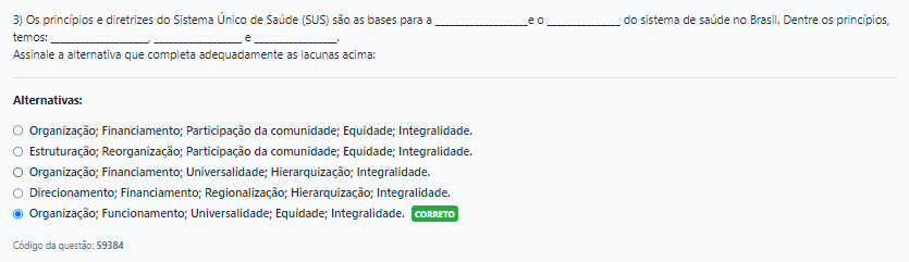 Os ______ e ______ do Sistema Único de Saúde (SUS) são as bases para a ______ e ______ do sistema de saúde. Dentre os termos: ______ e ______. Assinale a alternativa que completa adequadamente as lacunas.