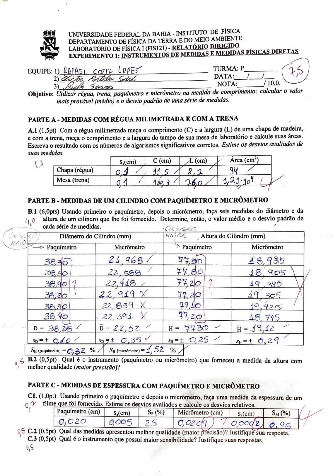 1.. UNIVERSIDADE FEDERAL DA BAIDA - INSTITUTO DE FÍSICA DEPARTAMENTO DE FÍSICA DA TERRA E DO MEIO AMBIENTE LABORATÓRIO DE FÍSICA I (FISI21)- RELATÓRIO DIRIGIDO , EXPERIMENTO t: INSTRUMENTOS DE MEDIDAS E MEDIDAS FISICAS DIRETAS . . c,..,'t'" L TURMA: P @e EQUIPE: 1),--+,J~ k' L.-~ll/+!,f:~ Y.L.!,""4-------- -- ,r .~ 2),~~~ .L2!:.~~~ ~ ~------- DATA:_/_/_ I 3) · NOTA:. ___ / 10,0. Objetivo: Utiliz r régua, trena, paquímetro e micrómetro na medida de comprimento; calcular o valor · mais provável (médio) e o desvio padrão de uma série de medidas. PARTE A- MEDIDAS COM RÉGUA MILIMETRADA E COM A TRENA A.1 (l,5pt) Com a régua milimetrada meça o comprimento (C) e a largura (L) de uma chapa de madeira, e com a trena, meça o comprimento e a largura do tampo de sua mesa de laboratório e calcule suas áreas. Escreva o resultado com os números de algarismos signifi~ativos corretos. Estime os desvios avaliados de suas medidas. Chapa (régua) Mesa (trena) PARTE B - MEDIDAS DE UM CILINDRO. COM PAQUÍMETRO E MICRÔMETRO B.1 (6,0pts) Usando primeiro o paquímetro, depois o micrômetro, faça seis medidas do diâmetro e da o altura de um cilindro que lhe foi fornecido . Determine, então, o valor médio e o desvio padrão de /::---L,, cada série de medidas. : e,,2 1;v'&l20 / ~,,,,__;:,, · 1v - :e: J Diâmetro do Cilindro (mm) HA ; o,,z_ .. Altura do Cilindro (mm) f(A ,o ,...J,....,,..._ _______ .-----------+--+---------T""----------1 Paquímetro Micrômetro Paquímetro Micrômetro 1 i_S - - . ./ D - f 2 , .t H= H = i9 i 2 so=± a,Lo / SH = ± 0 2S / SH (paquímetro) = O 3>,Z.. % SH (micrómetro)= Í; 5 2 % $ 6 B.2 (0,5pt) Qual é o instrumento (paquímetro ou micrômetro) que forneceu a medida da altura com 1 melhor qualidade (maior precisão)? PARTE C - MEDIDAS DE ESPESSURA COM PAQUÍMETRO E MICRÔMETRO Cl. (1,0pt) Usando primeiro o paquímetro e depois o micrômetro, faça uma medida da espessura de um o 1-' filme ue foi fornecido. Estime os desvios avaliados e calcule os desvios relativos. ( Paquímetro (cm) s. cm Sp (%) Micrômetro (cm) s.(cm) SM (%) <110 2 0 ~005 25 oozoq o oo i / V 0/o C.2 (0,5pt) Qual das medidas apresentou melhor qualidade (maior p ecisão )? Justifique sua resposta. C.3 (0,5pt) Qual é o instrumento que possui maior sensibilidade? Justifique suas respostas. o,S Victor Portela Victor Portela Victor Portela Victor Portela Victor Portela victo Lápis §o is . 2 "? ê) ~QuiH¤/4o A P/2e-s¤ÁI10u ºHtJ 11/J loK!. · ,4feô5.<) 0 CPc.-v,' ~ AO 5e,U .H¤-I-JOie 'J}-e;s v,ó ~vo ./ . e .. 2 /4) H -z ; dJÔ O u e A p ,,C(,c: 5 b Á)/4 º A H a //o/::? Q t..),(} L i' G,() J;;;-é fo,' · l<.C/.J Z 10 Zf.l Coth ç; f-( r'c,:::zoM.z/4.o / Po~.? /b~ch · , \ ' C.3 '') -a,::, o ~/ ,.Cl<zJHe:k -- ..,._ - - ,_