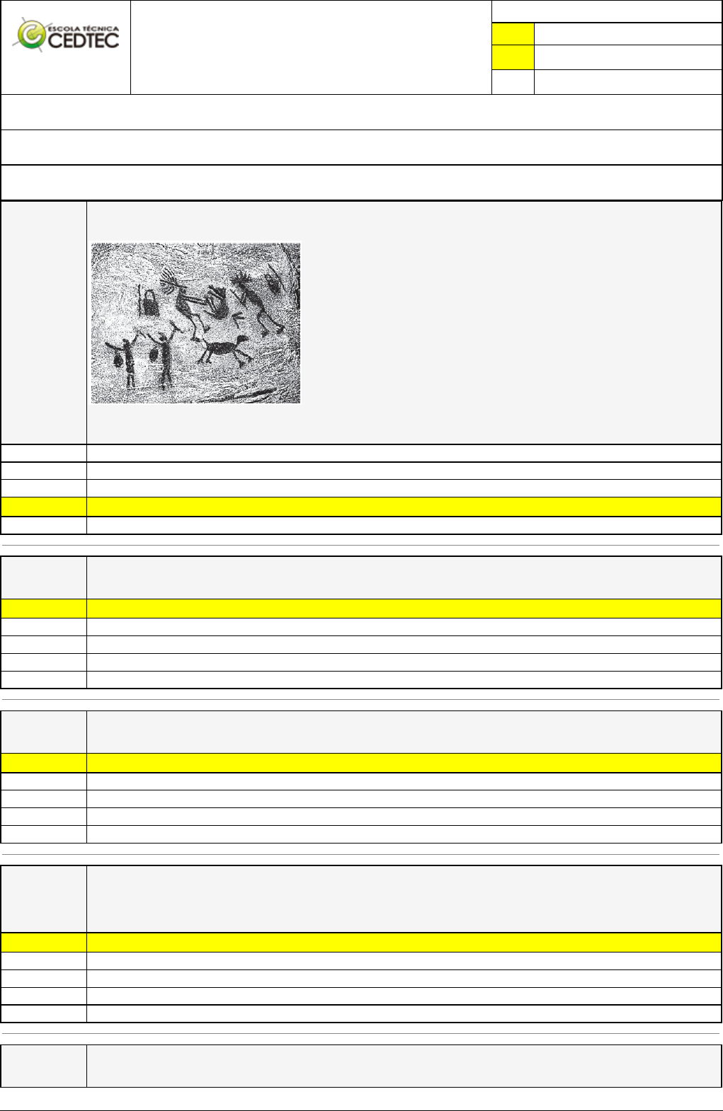 Pincel Atômico - 19/09/2023 08:29:41 1/2 WESLEY DE SOUZA BITURINO Exercício Caminho do Conhecimento - Etapa 12 (33663) Atividade finalizada em 19/09/2023 07:03:42 (1193124 / 1) LEGENDA Resposta correta na questão # Resposta correta - Questão Anulada X Resposta selecionada pelo Aluno Disciplina: HISTÓRIA [910803] - Avaliação com 5 questões, com o peso total de 14,29 pontos [capítulos - 2] Turma: Supletivo EJA: Ensino Médio - 1ª Etapa - Grupo: EAD EJA - 09/23 - EJA - 09/23 [97681] Aluno(a): 91112484 - WESLEY DE SOUZA BITURINO - Respondeu 5 questões corretas, obtendo um total de 14,29 pontos como nota [363776_219669] Questão 001 Ao longo da existência humana, povos que não fazem uso da escrita também têm deixado registros de sua trajetória. As pinturas rupestres, por exemplo, comunicam-nos com a Pré-História. Observe essa pintura rupestre pré-histórica encontrada na Serra da Capivara (Piauí). (lailartpb.blogspot.com. Acesso em: 17.08.2012. Adaptado) Analisando a pintura apresentada, é correto afirmar que ela retrata uma sociedade. Urbana, como se vê na representação de monumentos megalíticos. Religiosa, pois cultuava os deuses da natureza em rituais com fogueiras. Guerreira, pois a imagem retrata um conflito com o uso de armas de fogo. X Caçadora, com a utilização de vários instrumentos para a caça. Agrícola, com a utilização de carros de bois para o arado. [363777_246801] Questão 002 Qual das opções a seguir descreve corretamente os sambaquis? X São montes de conchas e restos de alimentos deixados por povos pré-históricos. São áreas de cultivo agrícola praticadas pelos povos africanos. São construções feitas pelos povos indígenas da região amazônica. São formações geológicas naturais encontradas nas montanhas. São construções religiosas utilizadas pelos colonizadores europeus. [363776_246800] Questão 003 Uma das explicações, mais aceitas sobre a ocupação humana na América, sustenta que os primeiros grupos humanos vieram do norte da Ásia. Identifique por onde ocorreu essa ocupação e assinale a alternativa CORRETA. X Pelo estreito de Bering. Pelo município de São Raimundo Nonato. Pelo norte do Chile. Pela Lagoa Santa. Pela América Central. [363776_219673] Questão 004 Os hominídeos são uma categoria de primatas que inclui os seres humanos modernos e seus ancestrais mais próximos. Ao longo de milhões de anos, diferentes espécies de hominídeos habitaram a Terra, passando por mudanças físicas e comportamentais. Esses ancestrais dos humanos compartilharam características como a postura bípede, desenvolvimento de ferramentas rudimentares e capacidade de usar o fogo. O estudo dos hominídeos é fundamental para compreender a evolução e a história. Qual das seguintes opções descreve corretamente os hominídeos? X Os hominídeos são uma categoria de primatas que inclui apenas os ancestrais mais próximos dos seres humanos. Os hominídeos são primatas que não possuem características semelhantes aos seres humanos. Os hominídeos são uma categoria de primatas que desenvolveram a capacidade de voar. Os hominídeos são seres humanos modernos que habitaram a Terra há milhões de anos. Os hominídeos são uma categoria de mamíferos que se originaram dos dinossauros. [363777_246803] Questão 005 Qual das seguintes opções descreve corretamente a pré-história em terras brasileiras? Pincel Atômico - 19/09/2023 08:29:41 2/2 Foi um período de intensa atividade comercial e intercâmbio cultural. Foi um período caracterizado pela escrita e registros históricos. X Foi um período anterior à chegada dos europeus, onde predominavam povos indígenas e não havia registros escritos. Foi um período em que ocorreram eventos religiosos importantes. Foi um período marcado pelo desenvolvimento das sociedades urbanas.