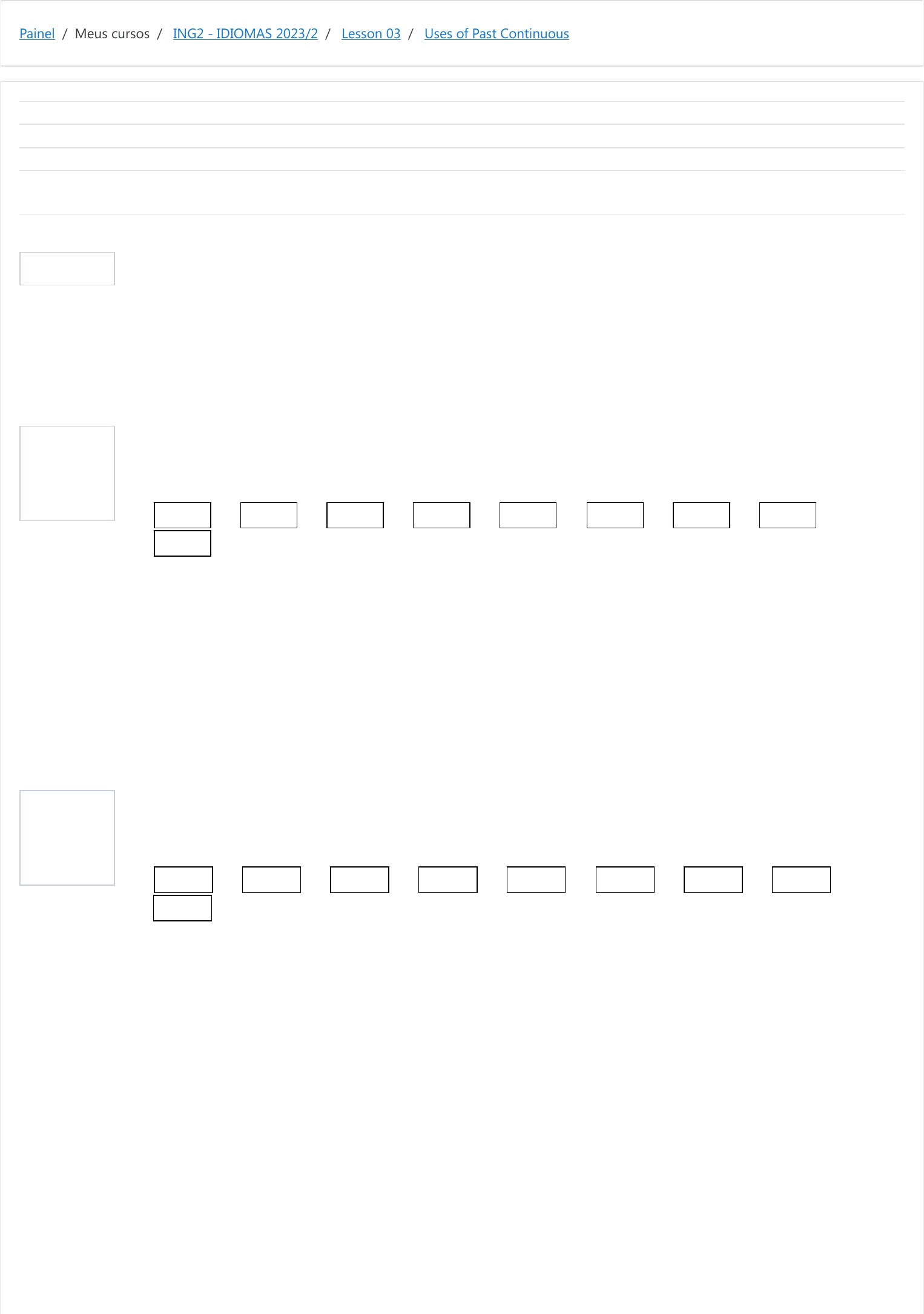 Painel / Meus cursos / ING2 - IDIOMAS 2023/2 / Lesson 03 / Uses of Past Continuous Informação Questão 1 Correto Atingiu 1,00 de 1,00 Questão 2 Correto Atingiu 1,00 de 1,00 Iniciado em terça, 19 set 2023, 10:14 Estado Finalizada Concluída em terça, 19 set 2023, 10:22 Tempo empregado 7 minutos 27 segundos Avaliar 10,00 de um máximo de 10,00(100%) Past Continuous, as any other verb tense, has its specific uses and forms. Listen to the sentences and put the words in the correct order according to what you hear. . Sua resposta está correta. A resposta correta é: [Bruno] [was] [walking] [home] [when] [he] [saw] [Steve]. . Sua resposta está correta. A resposta correta é: [Amélie] [and] [Sarah] [were] [working] [hard] [last] [week]. was walkingBruno he Steve home sawwhen workingwereAmélie and lastSarah week hard https://moodle.ifsul.edu.br/novohamburgo/my/ https://moodle.ifsul.edu.br/novohamburgo/course/view.php?id=357 https://moodle.ifsul.edu.br/novohamburgo/course/view.php?id=357#section-5 https://moodle.ifsul.edu.br/novohamburgo/mod/quiz/view.php?id=56693 Questão 3 Correto Atingiu 1,00 de 1,00 Questão 4 Correto Atingiu 1,00 de 1,00 Questão 5 Correto Atingiu 1,00 de 1,00 . Sua resposta está correta. A resposta correta é: [Chuck] [is] [lying] [to] [his] [father] [about] [Carlton's] [father's] [funeral]. . Sua resposta está correta. A resposta correta é: [Mr.] [Wilcox] [wasn't] [teaching] [when] [Bruno] [called]. . Sua resposta está correta. A resposta correta é: [Carlton's] [father] [wasn't] [living] [in] [USA] [when] [he] [was] [born]. Chuck lyingis father's fatherto his funeralCarlton's about BrunoteachingWilcox calledwhenMr. wasn't born livingCarlton's USAwasn't he father in was when Questão 6 Correto Atingiu 1,00 de 1,00 Questão 7 Correto Atingiu 1,00 de 1,00 Questão 8 Correto Atingiu 1,00 de 1,00 . Sua resposta está correta. A resposta correta é: [Sarah] [and] [Carlton] [weren't] [going] [home] [when] [I] [saw] [them]. . Sua resposta está correta. A resposta correta é: [Mr.] [Tennant] [was] [calling] [his] [mother] [about] [a] [party]. . Sua resposta está correta. A resposta correta é: [Steve] [was] [looking] [for] [2] [friends]. I going homeweren'tand Carlton when them Sarah saw hiswas mother a party calling aboutTennantMr. was friendsforlooking 2Steve Questão 9 Correto Atingiu 1,00 de 1,00 Questão 10 Correto Atingiu 1,00 de 1,00 . Sua resposta está correta. A resposta correta é: [Penny] [was] [reading] [a] [book] [yesterday] [at] [2] [o'clock]. . Sua resposta está correta. A resposta correta é: [It] [was] [raining] [when] [they] [left] [the] [diner]. ◄ When Losing Your Documents Seguir para... Routine in the Past ► bookPenny areading at o'clock yesterdaywas 2 It raining when the diner theywas left https://moodle.ifsul.edu.br/novohamburgo/mod/quiz/view.php?id=56691&forceview=1 https://moodle.ifsul.edu.br/novohamburgo/mod/quiz/view.php?id=56694&forceview=1