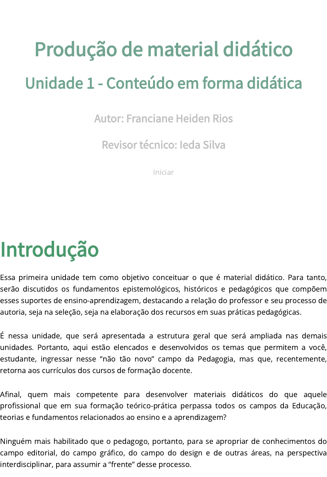 19/09/2023, 13:36 Copy of MY_BL4_EDU_PROMAD_20_E_1 https://student.ulife.com.br/ContentPlayer/Index?lc=K24Nut7Par0d57Xa6Wf1BQ%3d%3d&l=KL1cwlcKNK%2b7F33%2bPfuscA%3d%3d&cd=hn… 1/17 Produção de material didático Unidade 1 - Conteúdo em forma didática Autor: Franciane Heiden Rios Revisor técnico: Ieda Silva Iniciar Introdução Essa primeira unidade tem como objetivo conceituar o que é material didático. Para tanto, serão discutidos os fundamentos epistemológicos, históricos e pedagógicos que compõem esses suportes de ensino-aprendizagem, destacando a relação do professor e seu processo de autoria, seja na seleção, seja na elaboração dos recursos em suas práticas pedagógicas. É nessa unidade, que será apresentada a estrutura geral que será ampliada nas demais unidades. Portanto, aqui estão elencados e desenvolvidos os temas que permitem a você, estudante, ingressar nesse “não tão novo” campo da Pedagogia, mas que, recentemente, retorna aos currículos dos cursos de formação docente. A�nal, quem mais competente para desenvolver materiais didáticos do que aquele pro�ssional que em sua formação teórico-prática perpassa todos os campos da Educação, teorias e fundamentos relacionados ao ensino e a aprendizagem? Ninguém mais habilitado que o pedagogo, portanto, para se apropriar de conhecimentos do campo editorial, do campo grá�co, do campo do design e de outras áreas, na perspectiva interdisciplinar, para assumir a “frente” desse processo. 19/09/2023, 13:36 Copy of MY_BL4_EDU_PROMAD_20_E_1 https://student.ulife.com.br/ContentPlayer/Index?lc=K24Nut7Par0d57Xa6Wf1BQ%3d%3d&l=KL1cwlcKNK%2b7F33%2bPfuscA%3d%3d&cd=hn… 2/17 1. O conteúdo em forma didática Para início nesse percurso formativo é fundamental compreender o que são materiais didáticos. Para isso, será necessário desconstruir a ideia que, por vezes, povoa o imaginário dos professores. É fato que esses suportes de ensino-aprendizagem permeiam a totalidade do trabalho pedagógico. Entretanto, será que a percepção e a de�nição que se tem desse elemento tão presente e fundamental no processo de ensino-aprendizagem contempla sua natureza? Veja a seguinte situação hipotética. Durante seu planejamento, para trabalhar um conteúdo de geogra�a, a professora Ana selecionou alguns materiais. Foram eles: um mapa do Brasil, um globo terrestre, o livro didático de geogra�a e uma canção que fala sobre a diversidade geográ�ca do Brasil. Figura 1 a 4 - Recursos selecionados pela Professora Ana. Fonte: Pixabay, 2020. Em um primeiro momento, quais desses recursos poderiam ser considerados materiais didáticos? É possível que o livro didático receba o maior número de indicações. Entretanto, para Bandeira (2009), todos os recursos selecionados pela professora Ana podem ser considerados materiais didáticos. Essa autora a�rma que todo e qualquer recurso que possa transformar a maneira de entender um conteúdo, que auxilie e quali�que o processo ensino-aprendizagem, pode ser considerado material didático. Ampliando essa de�nição, é possível compreender material didático como: [...] um conjunto de recursos dos quais o professor se vale na sua prática pedagógica, entre os quais se destacam, grosso modo, os livros didáticos, os textos, os vídeos, as gravações sonoras (de textos, canções), os materiais auxiliares ou de apoio, como gramáticas, dicionários, entre outros. (OCEM, 1998, p. 154). Vamos juntos? 19/09/2023, 13:36 Copy of MY_BL4_EDU_PROMAD_20_E_1 https://student.ulife.com.br/ContentPlayer/Index?lc=K24Nut7Par0d57Xa6Wf1BQ%3d%3d&l=KL1cwlcKNK%2b7F33%2bPfuscA%3d%3d&cd=hn… 3/17 Assim, ao se falar de material didático se amplia o conceito para além do livro didático compreendendo como “[...] um recurso a mais, entre tantos, de que o professor dispõe para estruturar e desenvolver seu curso e suas aulas” (BRASIL, 2006, p. 154) . Entretanto, nessas primeiras de�nições, as palavras recursos e materiais passam a ser apresentadas como sinônimos, fato que precisa ser analisado mais a fundo. 1.1 Recursos e materiais: finalidades didáticas É possível a�rmar que o que de�ne um material didático é sua �nalidade didática e essa não é uma característica inata nos recursos didáticos. É o professor, em seu planejamento e na sua intencionalidade pedagógica, que produz, organiza, seleciona e relaciona o recurso com o objetivo de ensino-aprendizagem, ou seja, há uma diferença entre recurso didático e material didático, que precisa ser esclarecida. Para que o recurso didático seja um material didático é preciso que ele seja apropriado na proposta didático-pedagógica do professor. Nesse sentido, o globo terrestre, o mapa e a canção do exemplo anterior só são considerados materiais didáticos por terem sidos apropriados e incorporados na proposta de trabalho da professora Ana. E o livro didático? Se ele for utilizado de maneira questionável, em sala de aula, apenas como suporte de leitura e preenchimento pelos alunos, será ainda considerado um material didático? A despeito de sua utilização, o livro didático sempre será considerado um material didático em decorrência de sua natureza/concepção. Esse suporte, em seu processo de planejamento e desenvolvimento, teve seu conteúdo e os recursos, que o compõe, organizados em prol de objetivos e intencionalidades de ensino e expectativas de aprendizagem, mesmo que não seja o mesmo do professor que irá utilizá-lo. É essa característica que diferencia o livro didático dos demais recursos, garantindo a ele essa classi�cação. Talvez por isso, na situação hipotética trazida para análise, o livro tenha se destacado, mas, não só por esse motivo, essa construção próxima entre as noções de livro didático e material didático está diretamente relacionada com a própria história de seu emprego na educação. 2. História do material didático 19/09/2023, 13:36 C
