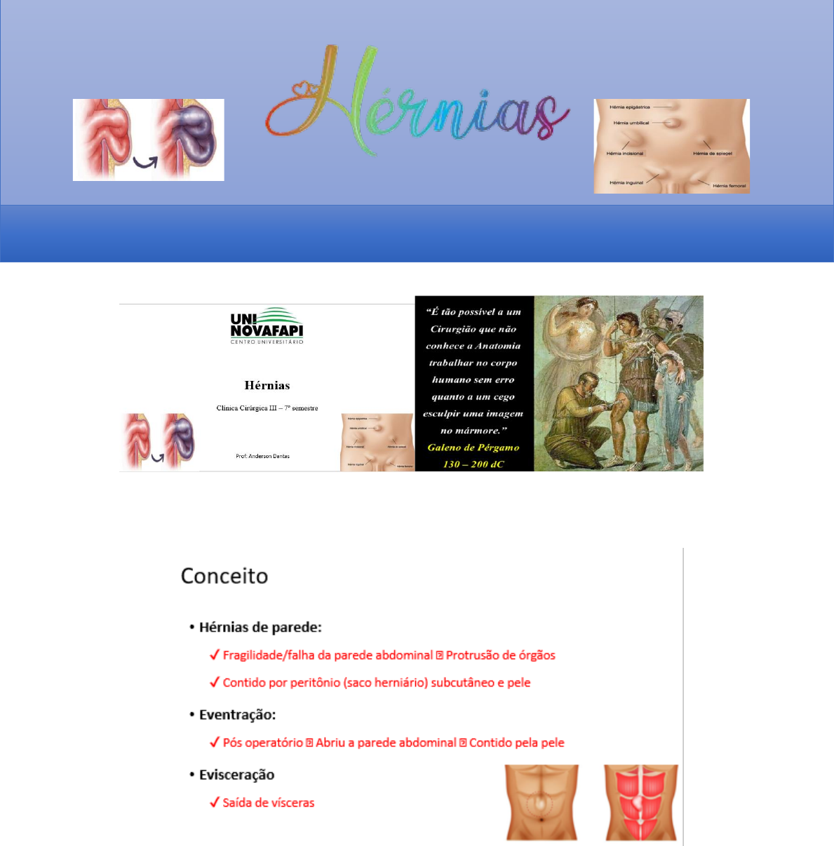 A Hérnia é o surgimento de um orifício não natural ou alargamento de um orifício natural de parede abdominal. Ex: Existe uma cicatriz natural umbilical quando esse orifício está aumentado de tamanho e permite que uma víscera intra-abdominal entre nesse orifício, isso é considerado hérnia. Esta Foto de Autor Desconhecido está licenciado em CC BY Transcrição por: Aminadá Neto Professor: Anderson Dantas Data da aula: 03/05/2023 http://www.bjorl.org/pt-clinical-characteristics-for-conservative-therapy-avance-S2530053920300250 https://creativecommons.org/licenses/by/3.0/ As hérnias de parede ocorrem por uma fragilidade da parede abdominal acarretando uma protusão de órgãos. Contido por peritônio (vai empurrando o peritônio que é uma falha da camada aponeurótica ou muscular. OBS: TODA HÉRNIA QUE VEM DE DENTRO DA PAREDE ABDOMINAL TEM SACO HERNIÁRIO. A eventração é quando no pós operatório o conteúdo abdominal abre, mas sai da parede abdominal e durante o esforço a sutura da parede abdominal se rasga ou abre só que esse conteúdo que foi aberto é contido pela camada da pele. Não é uma urgência, mas pode virar uma hérnia pós operatória chamada de hérnia incisional (não dependem da técnica cirúrgica e sim da cicatrização da cirurgia do paciente), essa sim precisa operar em um segundo momento (2 a 3 meses). OBS: UMA EVENTRAÇÃO PODE EVOLUIR PARA UMA EVISCERAÇÃO. A evisceração é quando você faz uma cirurgia abdominal e no pós operatório o conteúdo abdominal sai para fora da pele (de dentro para fora). Ocorre a saída de vísceras. Ex: Alça de intestino. É uma urgência médica e precisa operar novamente. Não pode deixar exposto pelo risco de infecção. Você acabou de se formar e está em um plantão, o paciente chega e diz que fez uma cirurgia com o Dr. Anderson há 5 dias, estava tudo bem em casa, mas apareceu um pedaço de alça para fora. Isso eu chamo de evisceração. As técnicas de fechamento são as mesmas, mas tudo depende do pós operatório, principalmente da cicatrização do paciente. Qual é o paciente que cicatriza bem? É o paciente que não tem infecção, o paciente que fez uma terapia nutricional pré-operatória adequada. Então são vários fatores que contribuem para a formação das hérnias. Uma das complicações da hérnia é a isquemia. Na imagem acima estão os vários tipos de hérnia e as mais frequentes são as hérnias da parede abdominal. O tratamento é sempre cirúrgico e é importante considerar o risco cirúrgico. A hérnia mais frequente de todas é a hérnia inguinal e também ela é a mais difícil, é a que precisamos mais um pouco de tempo para falar sobre ela. Vamos falar rapidamente sobre a anatomia da parede abdominal. As linhas que dividem o abdômen são: linha da parede abdominal anterior e a linha do canal inguinal. Então, na parede abdominal a gente tem 4 músculos principais: transverso abdominal, oblíquo interno, oblíquo externo e reto abdominal (parte medial). A anatomia na região superior é diferente da anatomia na região inferior. Então, gera uma certa diferença. No canal inguinal existe essas varginidades (orifícios naturais) que acontece pelo alargamento de um orifício natural causada que fragilidade da parede, por conta desse canal é que existe muitas hérnias inguinais. O anel herniário é um defeito na parede. tem a linha alba é a junção dos músculos reto abdominais direito e esquerdo, bem na linha média, que não tem músculo, por isso é a incisão mais utilizada na laparotomia, sangra menos e dói menos no pós operatório. As camadas afetadas na linha média: Pele, TSC, linha alba, peritônio e cavidade abdominal. Então, temos poucas camadas para adentrar. Se você faz uma incisão transversa ou oblíqua você pega o músculo oblíquo externo e interno, músculo transverso e músculo reto. A linha semilunar também conhecida como linha de Spieghel, corresponde a uma linha curva (lembra uma meia lua), de concavidade medial que marca a zona de transição do músculo transverso do abdome para a sua aponeurose. É comum gerar hérnia lateral. É uma área de falha. Agora é parte mais difícil que é a anatomia da região inguinal. A região inguinal é formada pelo triângulo: crista ilíaca anterosuperior, borda lateral do músculo reto abdominal e ligamento inguinal. OBS: TUDO QUE ESTÁ ACIMA DO LIGAMENTO INGUINAL É REGIÃO INGUINAL E TUDO QUE ESTÁ ABAIXO É REGIÃO FEMORAL. Dentro desse triângulo, temos um cordão tubular que é chamado canal inguinal, que é uma estrutura tubular que sai de dentro para fora da barriga e possui 2 limites extremos (anel inguinal externo ou superficial - fora e anel inguinal interno ou profundo - dentro). OBS1: O EXTERNO É O QUE COLOCAMOS O DEDO DENTRO NO EXAME FÍSICO DESSA REGIÃO. OBS2: ESSE ANEL TEM O TAMANHO CERTO PARA PASSAR ARTÉRIAS E VEIAS, MAS QUANDO PASSA GORDURA OU ÓRGÃOS TEMOS A HÉRNIA. É uma região de anatomia bem complexa. O músculo oblíquo interno fica no bordo superior do canal inguinal e origina as fibras do Músculo Cremaster (é um músculo pareado da pelve e do períneo e é desenvolvido completamente apenas na genitália externa dos homens). Durante a sua contração, o músculo cremaster traciona os testículos superiormente (retração) em direção ao canal inguinal. Esta ação protege os testículos e as células espermáticas de fatores negativos do meio ambiente Ex: Mudanças extremas de temperatura. A face medial da aponeurose do oblíquo interno + aponeurose do transverso abdominal = tendão conjunto. Aqui a gente vai apresentar as camadas que já discutimos anteriormente. Primeiro temos a pele. Segundo o TCSC que é envolto por 2 fáscias: • Fáscia de camper que é mais superficial; • Scarpa que é mais profunda (às vezes não conseguimos diferenciar). https://www.kenhub.com/pt/library/anatomia/pelve-e-perineo https://www.kenhub.com/pt/library/anatomia/canal-inguinal Terceiro o 