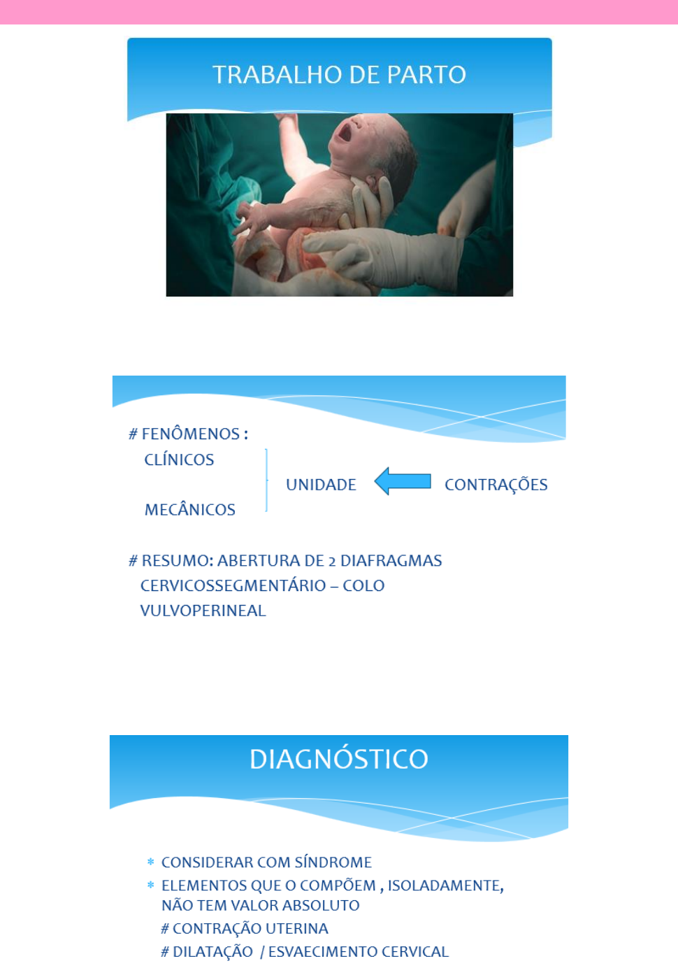 Por Fernanda Martins e Letícia Raquel Transcrição de HAM- Trabalho de parto- 23/02- Prof: Zannata Com o surgimento do ALSO, houve queda da mortalidade materna e neonatal porque melhorou a assistência ao parto. O trabalho de parto nada mais é do que contrações de fibras musculares lisas uterina, que vão ocasionar fenômenos químicos e mecânicos no útero e no feto, que vai resumir na abertura de 2 diafragmas: o colo uterino (cervivossegmentário) e o diafragma vulvoperineal, que é o canal vaginal propriamente dito. Por Fernanda Martins e Letícia Raquel O diagnóstico não é tão simples. Toda gestante tem dor e sente desconforto. A partir de uma determinada idade gestacional, em que aquele útero está distendido, ela tem influência na musculatura pélvica e vertebral. Porém, precisa de duas características clínicas para dizer que aquela gestante está em trabalho de parto: contrações uterinas rítmicas e dilatação de colo uterino. A partir de 6 a 8 semanas antes do trabalho de parto (por volta de 30 semanas), toda gestante começa a apresentar dores e contrações, que podem ser não ritmadas e indolores, em que ela sente o útero endurecer, porém essas são as contrações de treinamento (Braxton Hicks), para preparar o útero para as futuras contrações rítmicas e apagamento do colo uterino. Apagamento do colo significa o afinamento do colo uterino pela incorporação desse colo pelo corpo do bebê. As contrações do trabalho de parto têm uma frequência de pelo menos 2 contrações em 10 min e duração maior do que 40 seg (em média 60 seg) e tem intensidade acima de 60 unidades de contração, porém do ponto de vista clínico não dá para medir essa intensidade, apenas por cardiotocografia. Tudo isso associado a um colo uterino apagado, com dilatação de pelo menos 3 cm ou mais. Tem que ser os dois critérios, se tiver só um, não é trabalho de parto e não deve internar, porque, se internar precocemente, as etapas do parto serão prolongadas e pode tomar decisões precipitadas que podem interferir até mesmo na via de parto dessa gestante e fazer uma cesárea desnecessária. A gestação, desde a implantação do zigoto, é dividida em 4 fases. Essas não são fases do trabalho de parto e sim da gravidez. Por Fernanda Martins e Letícia Raquel A fase da quiescência vai da concepção (implantação do zigoto) até o início da parturição, é uma fase em que o útero não está responsivo a fatores que o estimulem, como hormonais (por exemplo: ocitocina), é uma gestante no início da gestação que permanece sem dor. Em torno de 6 a 8 semanas antes do trabalho de parto em si, ela começa a apresentar as contrações de treinamento, que é a fase de ativação, fase em que o útero começa a ficar responsivo a ocitocina, começa a ser preparado para o trabalho de parto, pois favorecem o amolecimento de colo e queda de colágeno através de infiltrados inflamatórios, para quando as contrações forem efetivas estejam favoráveis à dilatação do colo uterino e inicie o trabalho de parto. O início do trabalho de parto não tem um cronograma específico, pois é muito individualizado. Na fase de estimulação, que é trabalho de parto propriamente dito, pode se iniciar a partir de 37 semanas, mas se dá em média nas 40 semanas, aqui as contrações se tornam efetivas, com aquelas características de intensidade, frequência e duração. Para acompanhar o trabalho de parto precisa saber diagnosticar, conhecer suas etapas e cada duração e saber as relações útero-fetais (se esta relação está favorável a um parto normal) - é a relação do feto com ele mesmo e com o útero. Se já verifica uma relação útero-fetal não favorável, já é um motivo para referenciar para unidade especializada. - Atitude: Relação das partes fetais com ele mesmo. O feto tem uma atitude de flexão generalizada (flexão da coluna, com concavidade anterior, membros inferiores e superiores fletidos e cabeça fletida com queixo tocando o tórax). Ele se mantém assim durante toda a gravidez. Pelo exame físico não Dá pra dizer que ele está em flexão generalizada, a não ser quando estiver na fase ativa do trabalho de parto, que, através de achados do toque da cabeça fetal, consegue dizer que ele está nessa posição. - Situação: Relação do maior eixo fetal (crânio-caudal) com o maior eixo uterino (também crânio-caudal). Os dois podem estar coincidentes (situação longitudinal), podem estar perpendiculares (transverso) ou oblíquo. O mais comum é a situação longitudinal. - Apresentação: colo fetal que se apresenta ao extremo superior da bacia. Pode ser cefálico ou pélvico. Situação e apresentação podem ser definidos através do exame físico. Se no exame físico vê que está em situação longitudinal, mas apresentação pélvica, em que não encontra a cabeça fetal no exame físico, não vai mais acompanhar a gestante. A mais comum: situação longitudinal, cefálica e fletida, portanto pode acompanhar esse trabalho de parto. Alguns autores consideram uma 4° fase: 1 hora pós a dequitação. Cada fase tem suas características e sua duração. Por Fernanda Martins e Letícia Raquel Se estende daquela primeira dilatação de 3 cm e termina com a dilatação completa de 10 cm, quando no exame não consegue mais identificar o colo do útero, somente a apresentação cefálica. O colo uterino é uma estrutura muscular em forma de um cone e durante as contrações até iniciar o trabalho de parto, as fibras musculares vão sendo incorporadas pelo corpo uterino até ficar no fundo de saco apenas um orifício do colo uterino, sem fibras musculares e, a partir daqui e com as contrações cada vez mais rítmicas e frequentes, as fibras musculares são repuxadas e começam a dilatar/abrir. O trabalho de parto é só quando já tem uma dilatação e colo totalmente incorporado pelo corpo uterino. Na primigesta, esse apagamento ocorre antes da dil