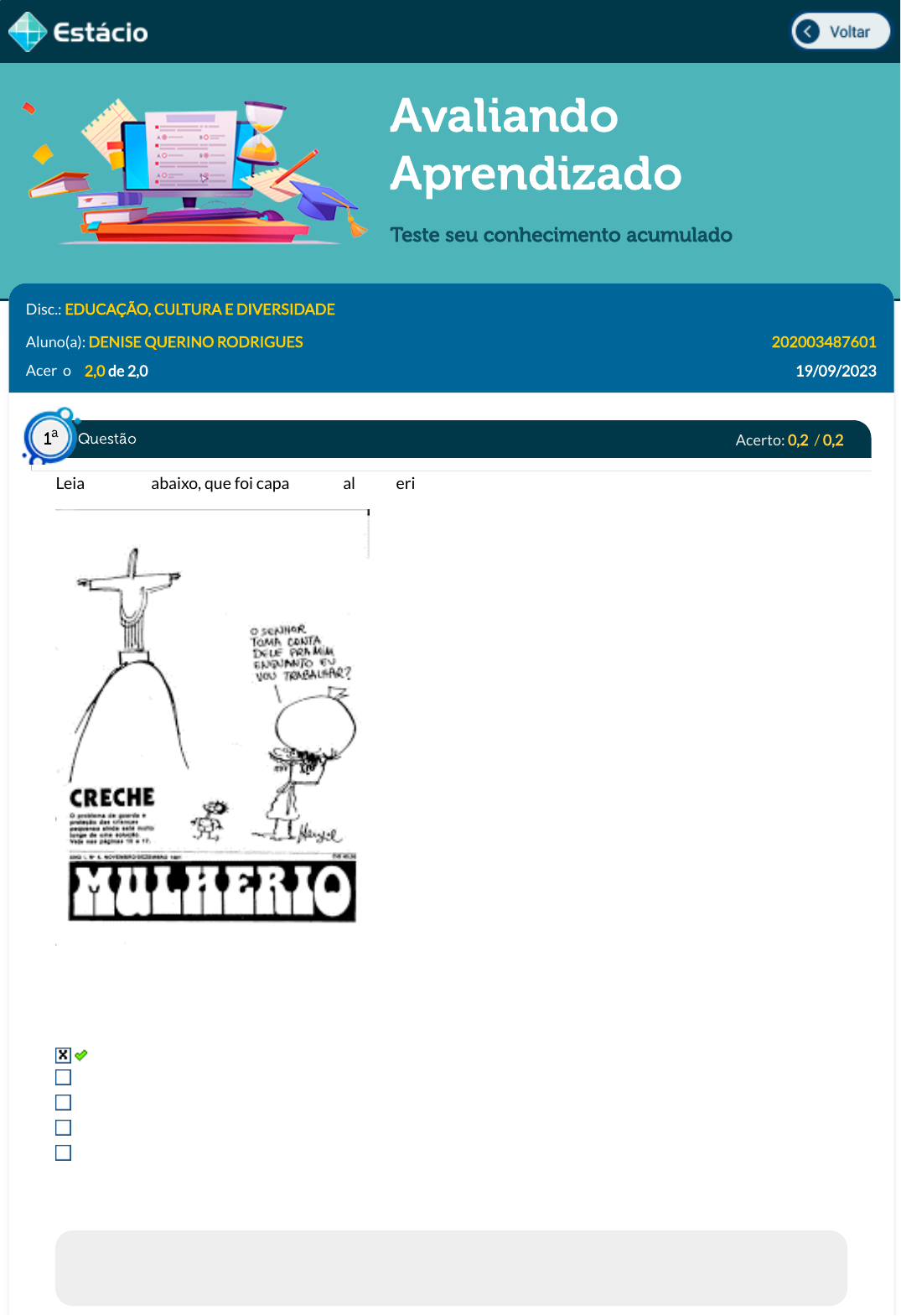 Avaliando Aprendizado Teste seu conhecimento acumulado Disc.: EDUCAÇÃO, CULTURA E DIVERSIDADE Aluno(a): DENISE QUERINO RODRIGUES 202003487601 Acertos: 2,0 de 2,0 19/09/2023 Acerto: 0,2 / 0,2 Leia a charge abaixo, que foi capa do jornal Mulherio e tem autoria de Hen�l. Fonte:https://www.fcc.org.br/livros/CRECHE_E_FEMINISMO_Donwload_pedro_menor.pdf Com relação ao conteúdo presente na charge, é correto a�rmar: Diz respeito à luta organizada das mulheres das favelas. É uma luta individual e não diz respeito às pessoas das favelas. É apenas uma charge e não possui relação com nenhum conteúdo. Todas as alternativas estão incorretas. Não possui nenhuma conexão com a luta das mulheres pelo direito à creche. Respondido em 19/09/2023 19:42:33 Explicação: A resposta correta é: Diz respeito à luta organizada das mulheres das favelas. Questão1 a https://simulado.estacio.br/alunos/inicio.asp https://simulado.estacio.br/alunos/inicio.asp javascript:voltar(); javascript:voltar(); Acerto: 0,2 / 0,2 Os dados apresentados pelo Mapa da Violência de 2016, publicado pela Faculdade Latino-americana de Ciências Sociais (FLACSO), reiteram o padrão segundo o qual a juventude brasileira encontra-se em maior vulnerabilidade frente às situações de violência, especialmente no que se refere às mortes provocadas por armas de fogo. De acordo com os especialistas responsáveis por este estudo, tal situação exige políticas de juventude e políticas para a juventude. Sobre juventudes, vulnerabilidade juvenil e políticas públicas para a redução da violência, considere as a�rmativas a seguir. I - A condição juvenil é socialmente construída e atravessada por condições sociais como classe, raça, escolaridade, local de moradia, religião e gênero. II - O trabalho é uma dimensão constitutiva da condição juvenil e é vivenciado positivamente por muitos jovens, pois permite o acesso ao entretenimento, ao consumo e aos namoros. III - O acesso dos jovens à educação formal e ao mercado de trabalho são questões resolvidas pelas políticas públicas, eliminando a chamada geração nem-nem. IV - O combate às desigualdades de renda e as desigualdades de gênero são as condições imediatas para a efetiva redução da violência entre jovens negros, via políticas públicas. Assinale a alternativa correta. Somente as a�rmativas I, II e III são corretas. Somente as a�rmativas III e IV são corretas. Somente as a�rmativas I e II são corretas. Somente as a�rmativas I e IV são corretas. Somente as a�rmativas II, III e IV são corretas. Respondido em 19/09/2023 19:45:10 Explicação: A resposta correta é: Somente as a�rmativas I e IV são corretas. Acerto: 0,2 / 0,2 Sobre os paradigmas assimilacionista e emancipacionista na história da educação indígena é correto a�rmar que: O paradigma assimilacionista vigorou durante todo o período colonial, sendo substituído pelo paradigma emancipacionista com a independência do Brasil. O paradigma emancipacionista é relativamente recente e resulta da luta histórica dos movimentos sociais indígenas e dos direitos conquistados com a promulgação da Constituição Federal de 1988. O paradigma emancipacionista, apesar de recente, já acumula conquistas importantes, dentre elas a erradicação do paradigma assimilacionista das políticas educacionais indígenas. Ambos os paradigmas coexistiram e seguem coexistindo na história da educação escolar indígena, desde as primeiras experiências de contato. É uma demanda das comunidades indígenas que defendem seu direito de serem amplamente incorporados a sociedade brasileira sem processos segregacionistas, mas garantindo direitos iguais. Respondido em 19/09/2023 19:46:57 Explicação: Questão2 a Questão3 a A resposta correta é: O paradigma emancipacionista é relativamente recente e resulta da luta histórica dos movimentos sociais indígenas e dos direitos conquistados com a promulgação da Constituição Federal de 1988. Acerto: 0,2 / 0,2 O lugar da cultura no processo educativo fundamenta-se na ideia de que: "Nem tudo o que é produzido pela humanidade constitui cultura no seu sentido educativo primordial: organizar a vida para o desenvolvimento humano". "Os conhecimentos produzidos pela humanidade têm lugar em diferentes setores da sociedade, excetuando-se na escola". "Cultura é fonte de desenvolvimento humano". "As formas �nais de cultura são elementos essenciais no interior da escola da infância". "A cultura expressa-se na produção humana elaborada ao longo da história e cada pessoa é um candidato a se apropriar dela para elevar seu processo de desenvolvimento". Respondido em 19/09/2023 19:48:16 Explicação: A resposta correta é: "A cultura expressa-se na produção humana elaborada ao longo da história e cada pessoa é um candidato a se apropriar dela para elevar seu processo de desenvolvimento". Acerto: 0,2 / 0,2 Leia o caso que será apresentado, em seguida escolha a opção correta com relação à condução docente nesta situação: A responsável de uma aluna comunica que sua �lha está constrangida com a exclusão que alguns colegas fazem nas atividades coletivas. A criança relatou à mãe que eles descobriram a religião de sua família e que por esse motivo começaram a ignorar a presença da menina. A professora não deverá interferir e respeitar os limites dos colegas. A professora escuta a mãe, conversa com a turma e realiza uma série de conversas sobre tolerância e diversidade. Todas as alternativas estão incorretas. A professora conversa com a turma e chama a atenção do grupo, sem conversar sobre preconceito religioso. A professora ouve a mãe, mas sabe que não cabe a ela tomar atitudes. Respondido em 19/09/2023 19:48:04 Explicação: A resposta correta é: A professora escuta a mãe, conversa com a turma e realiza uma série de conversas sobre tolerância e diversidade. Acerto: 0,2 / 0,2 No romance de Monteiro Lobato O 