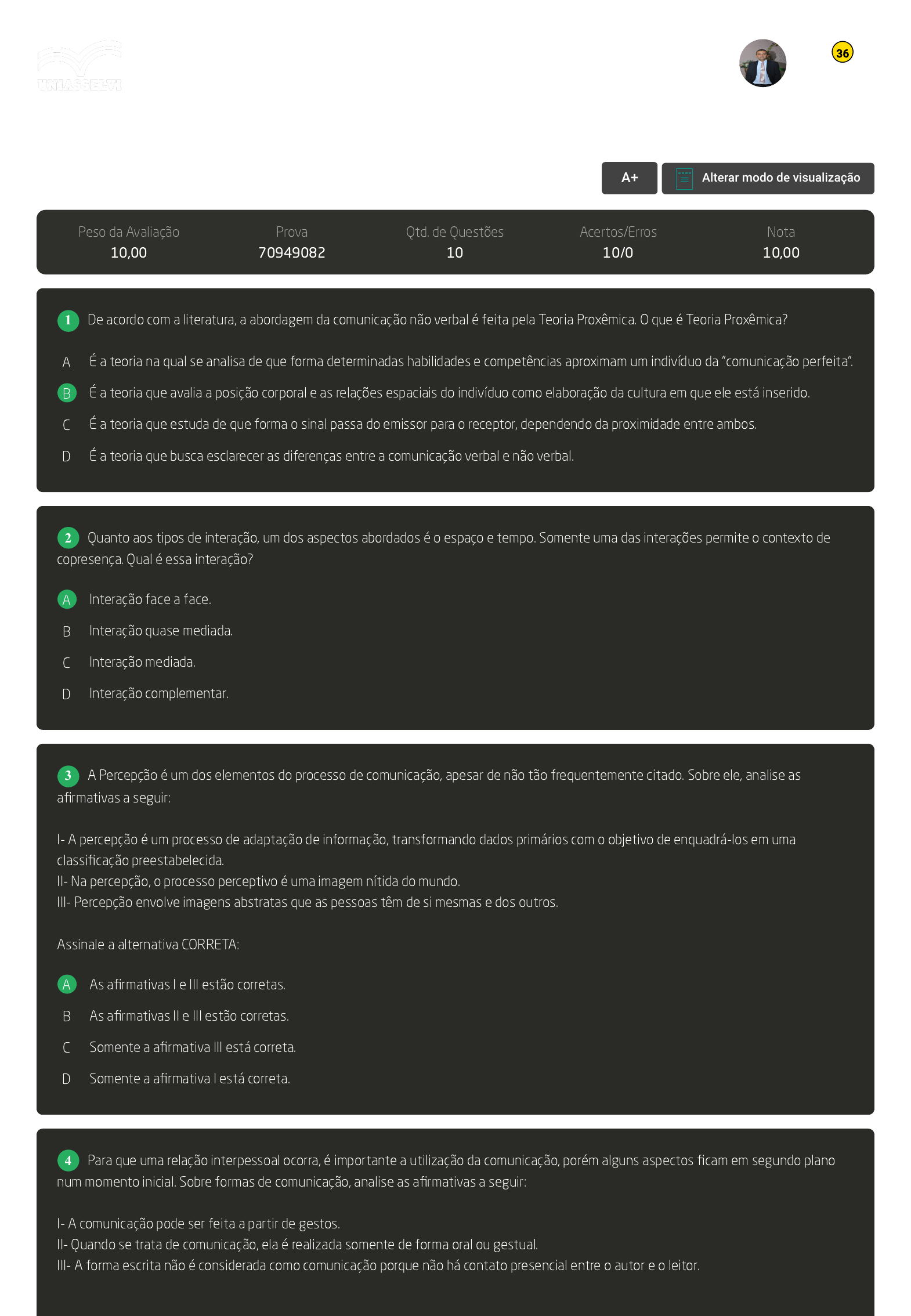 19/09/23, 21:15 AVA https://ava2.uniasselvi.com.br/subject/grades-and-tests/answer-book/eyJ0ZXN0Ijp7InRlc3RDb2RlIjoiODgyOTg0IiwiZGVzY3JpcHRpb24iOiJBdmFsaWHDp8OjbyBkaXNjaXBsaW5hIG9uLWxpbmUiLCJwYXJhbWV0ZX… 1/4 GABARITO | Avaliação disciplina on-line (Cod.:882984) Peso da Avaliação 10,00 Prova 70949082 Qtd. de Questões 10 Acertos/Erros 10/0 Nota 10,00 De acordo com a literatura, a abordagem da comunicação não verbal é feita pela Teoria Proxêmica. O que é Teoria Proxêmica? A É a teoria na qual se analisa de que forma determinadas habilidades e competências aproximam um indivíduo da "comunicação perfeita". B É a teoria que avalia a posição corporal e as relações espaciais do indivíduo como elaboração da cultura em que ele está inserido. C É a teoria que estuda de que forma o sinal passa do emissor para o receptor, dependendo da proximidade entre ambos. D É a teoria que busca esclarecer as diferenças entre a comunicação verbal e não verbal. Quanto aos tipos de interação, um dos aspectos abordados é o espaço e tempo. Somente uma das interações permite o contexto de copresença. Qual é essa interação? A Interação face a face. B Interação quase mediada. C Interação mediada. D Interação complementar. A Percepção é um dos elementos do processo de comunicação, apesar de não tão frequentemente citado. Sobre ele, analise as afirmativas a seguir: I- A percepção é um processo de adaptação de informação, transformando dados primários com o objetivo de enquadrá-los em uma classificação preestabelecida. II- Na percepção, o processo perceptivo é uma imagem nítida do mundo. III- Percepção envolve imagens abstratas que as pessoas têm de si mesmas e dos outros. Assinale a alternativa CORRETA: A As afirmativas I e III estão corretas. B As afirmativas II e III estão corretas. C Somente a afirmativa III está correta. D Somente a afirmativa I está correta. Para que uma relação interpessoal ocorra, é importante a utilização da comunicação, porém alguns aspectos ficam em segundo plano num momento inicial. Sobre formas de comunicação, analise as afirmativas a seguir: I- A comunicação pode ser feita a partir de gestos. II- Quando se trata de comunicação, ela é realizada somente de forma oral ou gestual. III- A forma escrita não é considerada como comunicação porque não há contato presencial entre o autor e o leitor. VOLTAR A+ Alterar modo de visualização 1 2 3 4 Antonio Alexandre Gomes da Silva Ciências Contábeis (2653293) 36 19/09/23, 21:15 AVA https://ava2.uniasselvi.com.br/subject/grades-and-tests/answer-book/eyJ0ZXN0Ijp7InRlc3RDb2RlIjoiODgyOTg0IiwiZGVzY3JpcHRpb24iOiJBdmFsaWHDp8OjbyBkaXNjaXBsaW5hIG9uLWxpbmUiLCJwYXJhbWV0ZX… 2/4 Assinale a alternativa CORRETA: A Somente a afirmativa II está correta. B Somente a afirmativa III está correta. C Somente a afirmativa I está correta. D As afirmativas I e III estão corretas. Existe um processo específico para a comunicação se efetivar, com passos que ocorrem em sequência. Sobre isso, analise as afirmativas a seguir: I- Se inicia com a codificação da informação pelo emissor. II- Após a codificação, ocorre a decodificação pelo receptor. III- Ocorre mesmo que o receptor não tenha conhecimento do significado dos códigos. IV- Há necessidade de acessibilidade para a veiculação das informações. Assinale a alternativa CORRETA: A As afirmativas III e IV estão corretas. B As afirmativas I, II e III estão corretas. C As afirmativas I, II e IV estão corretas. D As afirmativas II, III e IV estão corretas. Não é só de emissor e receptor que uma comunicação é feita. Há diversas outras particularidades do processo comunicativo. Sobre isso, associe os itens, utilizando o código a seguir: I- Canal. II- Mensagem. III- Informação. ( ) Conteúdo da mensagem. ( ) Meio pelo qual a mensagem é enviada. ( ) Unidade básica da comunicação. Assinale a alternativa que apresenta a sequência CORRETA: A I - III - II. B II - I - III. C II - III - I. D III - I - II. Para que ocorra o processo de comunicação, existem duas partes importantes envolvidas: a comunicação em si e o significado do que é comunicado. Sobre o assunto abordado, associe os itens, utilizando o código a seguir: I- Comunicação. II- Significado. III- Conteúdo. IV- Forma. ( ) Informações transmitidas que possibilitam a expressão das emoções e dos valores sociais. ( ) Conceito ou noção do que se quer transmitir. ( ) Meios de receber, enviar e registrar informações. 5 6 7 Antonio Alexandre Gomes da Silva Ciências Contábeis (2653293) 36 19/09/23, 21:15 AVA https://ava2.uniasselvi.com.br/subject/grades-and-tests/answer-book/eyJ0ZXN0Ijp7InRlc3RDb2RlIjoiODgyOTg0IiwiZGVzY3JpcHRpb24iOiJBdmFsaWHDp8OjbyBkaXNjaXBsaW5hIG9uLWxpbmUiLCJwYXJhbWV0ZX… 3/4 ( ) Relação entre a parte que transmite e a parte que compreende. Assinale a alternativa que apresenta a sequência CORRETA: A II - III - I - IV. B I - IV - II - III. C III - II - IV - I. D IV - I - III - II. Como a comunicação efetiva é essencial para o alcance de objetivos, assim como para fazer com que o mundo caminhe de forma organizada, as pessoas procuram formas de melhorar a comunicação. Pensando em formas de melhoria da comunicação, analise as afirmativas a seguir: I- Usar uma linguagem apropriada à mensagem e ao receptor. II- Oferecer escuta ativa a quem transmite. III- Comunicar sem que ocorram pausas de reflexão. IV- Ter empatia na comunicação interpessoal. Assinale a alternativa CORRETA: A As afirmativas I, II e IV estão corretas. B As afirmativas I, II e III estão corretas. C As afirmativas I, III e IV estão corretas. D As afirmativas II, III e IV estão corretas. Ao se tratar da comunicação não verbal, é pertinente entender a teoria proxêmica. Na análise proxêmica, estão presentes oito fatores. Sobre esses fatores, associe os itens, utilizando o código a seguir: I- Postura. II- Eixos sociofugo e sociop