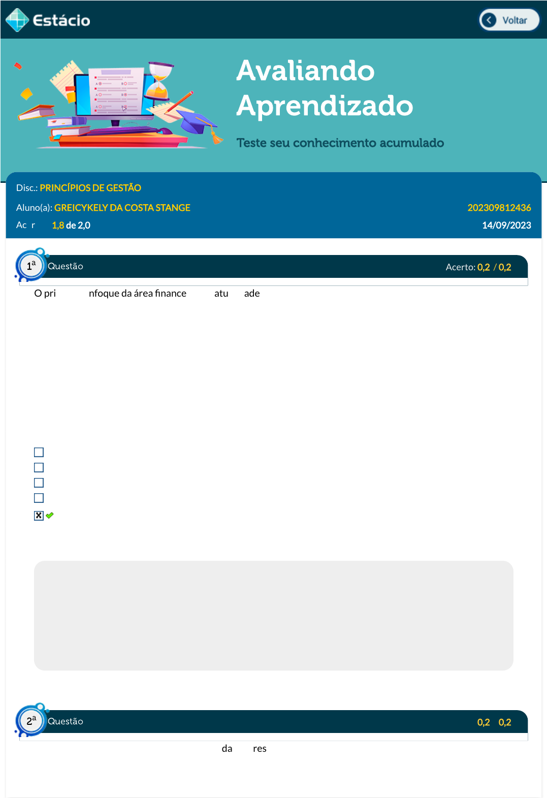 20/09/2023, 12:59 Estácio: Alunos https://simulado.estacio.br/alunos/ 1/6 Avaliando Aprendizado Teste seu conhecimento acumulado Disc.: PRINCÍPIOS DE GESTÃO Aluno(a): GREICYKELY DA COSTA STANGE 202309812436 Acertos: 1,8 de 2,0 14/09/2023 Acerto: 0,2 / 0,2 O principal enfoque da área �nanceira, na atualidade, é o processo decisório e as ações que afetam a valorização de um negócio. Seu tema central é a valorização da empresa e como as decisões podem ser tomadas, do ponto de vista �nanceiro, para maximizar essa valorização. Nesta área: I - As decisões devem ser tomadas considerando-se os resultados globais do investimento; II - Sua preocupação e responsabilidade é garantir a maximização da riqueza do investidor; III - O objetivo principal é a maximização do lucro em determinados períodos particulares. Está correto o que é a�rmado em: III, apenas. Todas as alternativas estão incorretas. I, apenas. I e III, apenas. I e II, apenas. Respondido em 14/09/2023 19:55:39 Explicação: I - As decisões devem ser tomadas considerando-se os resultados globais do investimento. Correto. II - Sua preocupação e responsabilidade é garantir a maximização da riqueza do investidor. Correto. III - O objetivo principal é a maximização do lucro em determinados períodos particulares. Incorreto. É necessário visar a maximização da riqueza e não exatamente do lucro e nem em determinados períodos. A riqueza do investidor tem relação com dois aspectos: recursos e credibilidade. Acerto: 0,2 / 0,2 José trabalha na área de Gestão de Pessoas da empresa SERVIÇOS LTDA. Entre suas atividades, encontra(m)- se: I - Determinar as necessidades de recursos humanos; Questão1 a Questão2 a https://simulado.estacio.br/alunos/inicio.asp javascript:voltar(); 20/09/2023, 12:59 Estácio: Alunos https://simulado.estacio.br/alunos/ 2/6 II - Avaliar o impacto das novas tecnologias e de novas formas de organização do trabalho; III - Coordenar, monitorar e avaliar todas as atividades e os �uxos �nanceiros internos. Está correto o que é a�rmado em: I e II, apenas. II e III, apenas. III, apenas. I, apenas. I, II e III. Respondido em 14/09/2023 19:55:59 Explicação: I - Determinar as necessidades de recursos humanos. Correto. II - Avaliar o impacto das novas tecnologias e de novas formas de organização do trabalho. Correto. III - Coordenar, monitorar e avaliar todas as atividades e os �uxos �nanceiros internos. Incorreto. As atividades e �uxos �nanceiros são responsabilidade da área de Finanças da organização e não de Gestão de Pessoas. Acerto: 0,2 / 0,2 Os Objetivos de Desenvolvimento Sustentável (ODS) foram estabelecidos pela Organização das Nações Unidas (ONU) em 2015 como um conjunto de 17 objetivos e 169 metas para serem alcançados até 2030. Qual das alternativas a seguir melhor descreve os Objetivos de Desenvolvimento Sustentável (ODS)? São iniciativas locais para promover a inovação e o empreendedorismo em comunidades carentes. São objetivos estabelecidos pelas empresas para maximizar seus lucros e melhorar suas reputações. São metas de�nidas pela Organização das Nações Unidas (ONU) para erradicar a pobreza no mundo até 2030. São ações propostas pelos governos dos países para promover o desenvolvimento econômico global. São compromissos internacionais para alcançar um futuro mais sustentável, com metas em áreas como erradicação da pobreza, proteção do meio ambiente e promoção da igualdade. Respondido em 14/09/2023 19:56:19 Explicação: Os Objetivos de Desenvolvimento Sustentável (ODS) foram estabelecidos pela Organização das Nações Unidas (ONU) em 2015 como um conjunto de 17 objetivos e 169 metas para serem alcançados até 2030. Eles representam compromissos internacionais para promover um futuro mais sustentável em áreas como erradicação da pobreza, proteção do meio ambiente, promoção da igualdade de gênero, entre outros. A alternativa D é a única que descreve corretamente os ODS, enquanto as outras alternativas apresentam conceitos errôneos ou incompletos sobre o assunto. Acerto: 0,2 / 0,2 Em 1994 John Elkington propôs o Tripé da sustentabilidade que tornou-se um conceito amplamente utilizado. Assinale a alternativa que indica o objetivo do tripé da sustentabilidade: Equilibrar as dimensões social, ambiental e econômica para alcançar a sustentabilidade. Questão3 a Questão4 a 20/09/2023, 12:59 Estácio: Alunos https://simulado.estacio.br/alunos/ 3/6 Estabelecer uma hierarquia entre as dimensões social, ambiental e econômica. Eliminar a dimensão econômica em prol das outras dimensões. Priorizar a dimensão econômica sobre as outras dimensões. Estabelecer uma hierarquia entre as dimensões ambiental, social e econômica. Respondido em 14/09/2023 19:56:41 Explicação: O tripé da sustentabilidade é um conceito amplamente utilizado na atualidade para se referir aos três pilares que sustentam a prática do desenvolvimento sustentável. Esses três pilares são: o social, o ambiental e o econômico. Cada um desses pilares é interdependente e igualmente importante para se alcançar a sustentabilidade. Acerto: 0,2 / 0,2 Os Sistemas de Organização Econômica podem ser divididos em: Sistema de Concorrência Pura, Sistema de Economia Mista e Economia Centralizada. Analise as a�rmativa a seguir sobre o sistema de economia mista. I. Há intervenção governamental em áreas estratégicas. II. Prevalecem as forças de mercado da demanda e da oferta. III. O governo não atua na formação de preços. Assinale a alternativa que indica as aformativa corretas. II, apenas. I e II, apenas. I, II e III. I e III, apenas. II e III, apenas. Respondido em 14/09/2023 19:57:01 Explicação: I. Há intervenção governamental em áreas estratégicas. - correta II. Prevalecem as forças de mercado da demanda e da oferta. - correta III. O governo não atua na formação de preços. - incorrta - A atua