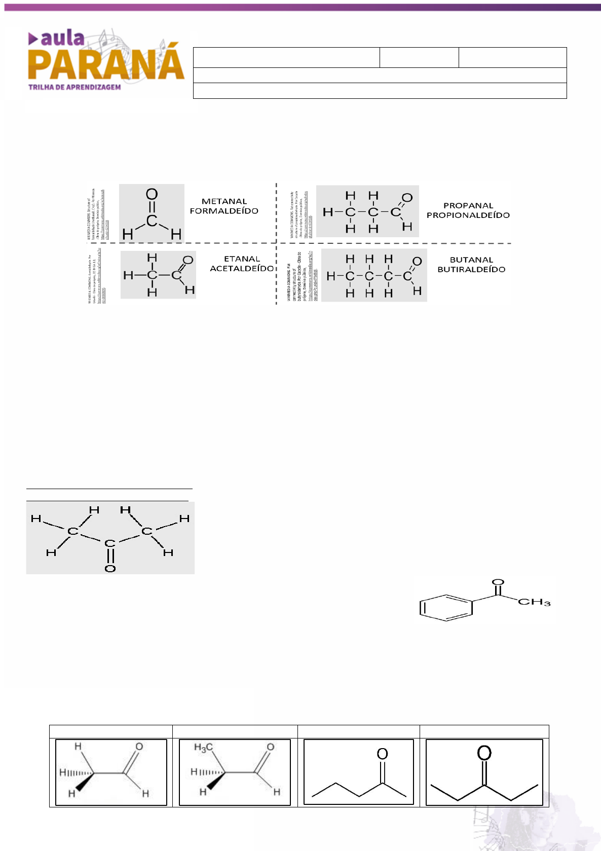 Olá, estudante! Para ajudar em seus estudos, você está recebendo o resumo dos conteúdos das aulas 27 e 28. Bons Estudos! AULA 27 – FUNÇÕES QUÍMICAS OXIGENADAS: Aldeídos – Características, Nomenclatura e Aplicações Os aldeídos apresentam o grupo carbonila (C=O) na extremidade da cadeia. NOMENCLATURA OFICIAL DOS ALDEÍDOS: NÚMERO DE CARBONOS + LIGAÇÃO + FUNÇÃO (AL). NOMENCLATURA USUAL DOS ALDEÍDOS: Os quatro aldeídos mais simples apresentam nomes usuais formados pelos prefixos: form, acet, propion, butir, seguidos da palavra aldeído. ALGUMAS APLICAÇÕES: Metanal: quem já visitou um laboratório de anatomia sabe bem do que se trata esta substância, aquele cheiro que irrita as narinas provém de uma solução de metanal (37% de metanal e 63% de água), essa solução é usada para conservar cadáveres humanos e animais para estudos posteriores. Na verdade é mais conhecida como formol e é empregada ainda na fabricação de desinfetantes (anti-sépticos) e na indústria de plásticos e resinas. O formol (ou formaldeído) é um gás incolor em temperatura ambiente que tem a propriedade de desnaturar proteínas, essas ficam mais resistentes não sendo degradadas pela ação de bactérias, daí o porquê do formol ser aplicado como fluido de embalsamamento. Etanal: é um gás de cheiro forte e solúvel em água. É usado como matéria-prima na indústria de medicamentos e pesticidas, sendo também utilizado na fabricação de espelhos. Vanilina: é um aldeído fenólico de coloração branca e odor característico de baunilha. É extraída naturalmente da vagem da baunilha, mas sua forma sintética também é industrialmente usada como um agente aromatizante em alimentos, bebidas e produtos farmacêuticos. AULA 28 – FUNÇÕES QUÍMICAS OXIGENADAS: Cetona – Características, Nomenclatura e Aplicações As cetonas apresentam o grupo carbonila (C=O), sendo este carbono secundário (Um carbono secundário é aquele que apresenta duas ligações diretamente com outros carbonos). Obs.: neste caso as outras duas ligações deste carbono (C) são com o átomo de oxigênio (O). NOMENCLATURA OFICIAL DAS CETONAS: NÚMERO DE CARBONOS + LIGAÇÃO + FUNÇÃO (ONA). NOMENCLATURA USUAL DAS CETONAS: O grupo C=O é denominado cetona, e seus ligantes são considerados radicais. OFICIAL: PROP(3C)+AN(SIMPLES)+ONA(CETONA) ➔ PROPANONA USUAL: Dois radicais metil ligados à carbonila (C=O) ➔ DIMETIL-CETONA. APLICAÇÕES: Acetona (Propanona): é um líquido inflamável, incolor, com cheiro agradável e solúvel em água. A cetona mais simples é usada como solvente (de lacas, resinas, acetileno), na extração de óleos vegetais e na fabricação de medicamentos hipnóticos como o sulfonal (um sonífero). APLICAÇÕES: Acetofenona (1-Feniletanona – Oficial – ou fenilmetilcetona - Usual): é a cetona aromática mais simples sendo incolor e de alta viscosidade. É utilizada como precursor na preparação de diversas resinas e fragrâncias (principalmente como aroma artificial de amêndoa, cereja, jasmim e morango), sendo também o precursor acadêmico clássico para o estireno. EXERCÍCIO As substâncias a seguir são exemplos de aldeídos e cetonas e estão representadas por meio da sua grafia em bastão. Sobre elas, responda no verso da folha: a) Represente a sua fórmula estrutural simplificada; b) Represente a sua fórmula molecular; c) De acordo com as regras de nomenclatura, dê o nome oficial à cada uma delas; d) Dê o nome usual à cada uma delas. i) ii) iii) iv) QUÍMICA 3ª Série SEMANA 18 ESCOLA/COLÉGIO: ESTUDANTE: