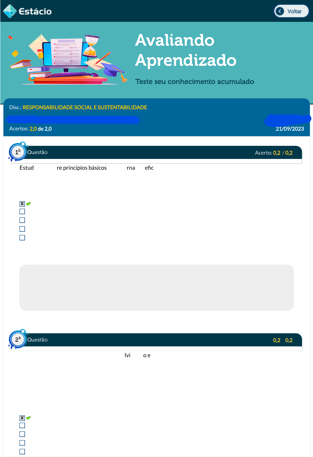 21/09/2023, 09:51 Estácio: Alunos https://simulado.estacio.br/bdq_simulados_ava1_ava2_ead_resultado.asp?cod_hist_prova=316803589&cod_prova=6645058434&f_cod_disc= 1/5 Avaliando Aprendizado Teste seu conhecimento acumulado Disc.: RESPONSABILIDADE SOCIAL E SUSTENTABILIDADE Aluno(a): CRISTIANE VERALÚCIA MENDES DA SILVA 202204035472 Acertos: 2,0 de 2,0 21/09/2023 Acerto: 0,2 / 0,2 Estudamos sobre princípios básicos da governança e�caz para o desenvolvimento sustentável apresentados pelo Comitê Econômico e Social da ONU. Um destes 11 princípios sugere a promoção de políticas anticorrupção e códigos de conduta para funcionários públicos. Abaixo, assinale qual dos princípios está de acordo com a sugestão acima: Integridade. Participação. Não discriminação. Colaboração. Formulação sólida de Políticas. Respondido em 21/09/2023 09:37:05 Explicação: Integridade - Para servir ao interesse público, os funcionários públicos devem cumprir com seus deveres o�ciais de maneira honesta e justa. Para isso, devem-se promover políticas, práticas e órgãos anticorrupção, códigos de conduta para funcionários públicos, compras públicas competitivas, eliminação de suborno e comércio de in�uência, políticas de con�ito de interesses, proteção a denunciantes e fornecimento de remuneração adequada. Acerto: 0,2 / 0,2 A responsabilidade social preconiza o envolvimento entre os stakeholders como forma de socialização das práticas responsáveis e da disseminação de atitudes éticas nas organizações. DREHER, Marialva T; ULLRICH, Danielle R; MORO, Renata D. Stakeholders e responsabilidade social: as experiências das organizações de Blumenau, SC. [s.l: s.n.]. Disponível em: https://abepro.org.br/biblioteca/enegep2009_TN_STO_101_674_12917.pdf. Acesso em: 21 set. 2022. Considerando as diferentes visões sobre Responsabilidade Social Empresarial, podemos a�rmar que são stakeholders: Todos os agentes afetados, direta ou indiretamente, pela empresa. Apenas funcionários e gestores. Apenas sócios e acionistas. Pessoas que nasceram na comunidade onde a empresa está inserida. Apenas sócios e clientes. Questão1 a Questão2 a 21/09/2023, 09:51 Estácio: Alunos https://simulado.estacio.br/bdq_simulados_ava1_ava2_ead_resultado.asp?cod_hist_prova=316803589&cod_prova=6645058434&f_cod_disc= 2/5 Respondido em 21/09/2023 09:39:14 Explicação: A resposta correta é: Todos os agentes afetados, direta ou indiretamente, pela empresa. Na sua atuação, as organizações interagem de modo sistêmico com diversos públicos de interesse (stakeholders), que são afetados ou que afetam sua operacionalidade e legitimidade. As relações com os stakeholders signi�cam um fator fundamenttal à sobrevivência dos negócios, ocasionam melhor entendimento dos impactos destes na sociedade e no ambiente. DREHER, Marialva T; ULLRICH, Danielle R; MORO, Renata D. Stakeholders e responsabilidade social: as experiências das organizações de Blumenau, SC. [s.l: s.n.]. Disponível em: https://abepro.org.br/biblioteca/enegep2009_TN_STO_101_674_12917.pdf. Acesso em: 21 set. 2022. Acerto: 0,2 / 0,2 No Acordo de Paris, foram determinados compromissos dos países na redução das emissões de Gases de Efeito Estufa, o que �cou conhecido como Contribuição Nacionalmente Determinada (NDC). O Brasil estabeleceu algumas metas para reduzir as emissões de gases poluentes. Assinale a alternativa que não apresenta uma das medidas propostas pelo governo brasileiro: Reduzir o desmatamento. Restaurar e re�orestar áreas desmatadas. Aumentar a participação de energias renováveis na matriz energética. Aumentar a participação de bioenergia sustentável. Intensi�car o uso de combustíveis fósseis na matriz energética brasileira, visto que o uso de energias limpas demanda avanços tecnológicos para viabilizá-lo. Respondido em 21/09/2023 09:40:35 Explicação: A resposta correta é: Intensi�car o uso de combustíveis fósseis na matriz energética brasileira, visto que o uso de energias limpas demanda avanços tecnológicos para viabilizá-lo. Acerto: 0,2 / 0,2 O Financial Stability Board desenvolveu uma Força-Tarefa para Divulgações Financeiras Relacionadas às Mudanças Climáticas. Quais dos itens representam uma das dimensões elaboradas pela Força-Tarefa? I. Governança. II. Métricas e metas. III. Estratégia. IV. Riscos Climáticos. V. Índices. Apenas os itens III e IV estão corretos. Apenas os itens I, II, III e IV estão corretos. Apenas os itens II e V estão corretos. Apenas os itens I, II e IV estão corretos. Apenas os itens I, III e V estão corretos. Respondido em 21/09/2023 09:42:16 Questão3 a Questão4 a 21/09/2023, 09:51 Estácio: Alunos https://simulado.estacio.br/bdq_simulados_ava1_ava2_ead_resultado.asp?cod_hist_prova=316803589&cod_prova=6645058434&f_cod_disc= 3/5 Explicação: A Força-Tarefa para Divulgações Financeiras Relacionadas às Mudanças Climáticas (Task-Force for Climate-related Financial Disclosures, ou TCFD). No mercado, a TCFD é chamada apenas pela sigla. A importância da TCFD foi levar para o setor �nanceiro um conjunto de recomendações que permitem às empresas avaliarem sua exposição aos riscos climáticos, mas também identi�carem oportunidades de negócios relacionadas ao tema. As recomendações se organizam em 4 dimensões: a governança das instituições, ou seja, como as lideranças estão olhando para as questões climáticas; a forma como os impactos reais são considerados na estratégia; os processos de análise e gestão de riscos climáticos; e as métricas e metas estabelecidas para a redução da exposição a estes riscos. Acerto: 0,2 / 0,2 Uma das Organizações Multilaterais que estudamos pode ser caracterizada por discutir políticas públicas e econômicas, apoiando-se nos princípios da democracia representativa e na economia de mercado, estimulando o desenvolvimento econômico e o comércio mundial. Selec