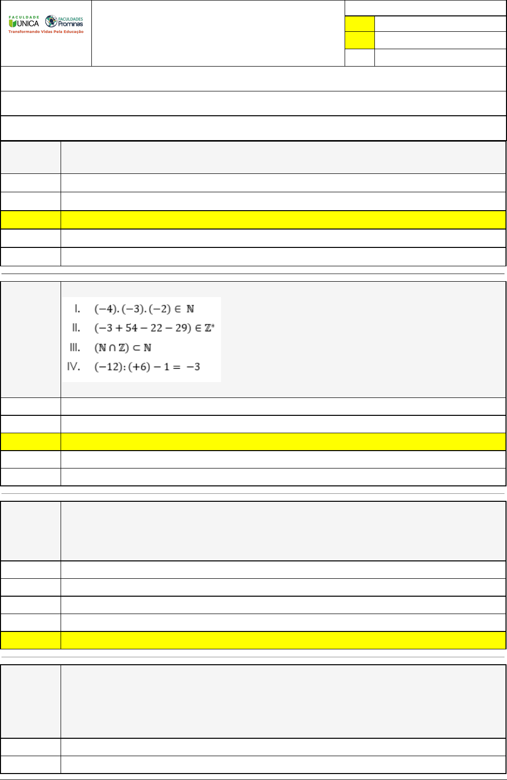 Pincel Atômico - 21/09/2023 19:53:29 1/2 ROBERTO CARLOS CARNEIRO Exercício Caminho do Conhecimento - Etapa 4 (19804) Atividade finalizada em 19/09/2023 21:14:23 (1197512 / 1) LEGENDA Resposta correta na questão # Resposta correta - Questão Anulada X Resposta selecionada pelo Aluno Disciplina: FUNDAMENTOS DA MATEMÁTICA [869469] - Avaliação com 8 questões, com o peso total de 1,67 pontos [capítulos - 2] Turma: Segunda Graduação: Segunda Graduação 6 meses - Licenciatura em Matemática - Grupo: FPD-MAIO2023 - SGegu0A260523 [92670] Aluno(a): 91471699 - ROBERTO CARLOS CARNEIRO - Respondeu 8 questões corretas, obtendo um total de 1,67 pontos como nota [360845_170570] Questão 001 (OBMEP – Adaptado) Se a=23.52.72 identifique qual dos seguintes números são múltiplos de a: 22.52.7 2.5.74.132 X 23.3.54.72.11 25.52.7 22.33.52 [360845_170573] Questão 002 Analise as afirmativas a seguir sobre o conjunto dos números naturais e inteiros. Marque a alternativa que corresponde a sequência correta das afirmativas. V, F, V, V F, F, F, V X F, F, V, V V, V, F, F V, V, V, F [360845_170520] Questão 003 Um artesão de tapetes dispõe de duas peças de tecidos, uma com 900 centímetros e a outra com 780 centímetros. Ele vai cortar as peças de tecidos em tamanhos iguais e o maior possível. O número de tapetes que ele conseguirá fazer é 15. 46. 39. 50. X 28. [360845_170568] Questão 004 (OBMEP – Adaptado) Dois ciclistas correm numa pista circular e gastam, respectivamente, 30 segundos e 35 segundos para completar uma volta na pista. Eles partem do mesmo local e no mesmo instante. Após algum tempo os dois atletas se encontram, pela primeira vez, no local de largada. Depois de quanto tempo da largada ocorrerá o encontro? 60 segundos 70 segundos Pincel Atômico - 21/09/2023 19:53:29 2/2 420 segundos X 210 segundos 90 segundos [360847_170519] Questão 005 (Prefeitura de Santana do Livramento – RS) Breno e Bruno iniciaram suas atividades no mesmo dia na empresa KSL. Se Breno trabalha 3 dias e folga 1 e Bruno trabalha 7 e folga 3, em quantos dias Breno e Bruno estarão de folga juntos, no espaço de um ano? 50. 28. 42. X 36. 80 [360845_170518] Questão 006 Em um clube de advogados, o Diretor é eleito a cada 4 anos, o Coordenador Administrativo a cada 3 anos e o Secretário a cada 2 anos. Se em 2018 houve eleições para os três cargos simultaneamente, em que ano isso ocorrerá novamente? 2026. 2040. X 2030. 2032. 2022. [360845_170566] Questão 007 Utilizando o algoritmo estudado, e calcule o mmc dos seguintes números no conjunto dos naturais. (2, 3) (6, 8) (10, 15) (7, 11) Assinale a alternativa que corresponde os valores encontrados. X 6, 24, 30, 77 6, 48, 150, 77 12, 24, 30, 77 6, 48, 30, 77 6, 30, 24, 77 [360847_170521] Questão 008 (OBEMP) A partir do ano 2016, qual vai ser o primeiro ano divisível por 11 e por 13? 2137. X 2145. 2027. 2040. 2159.