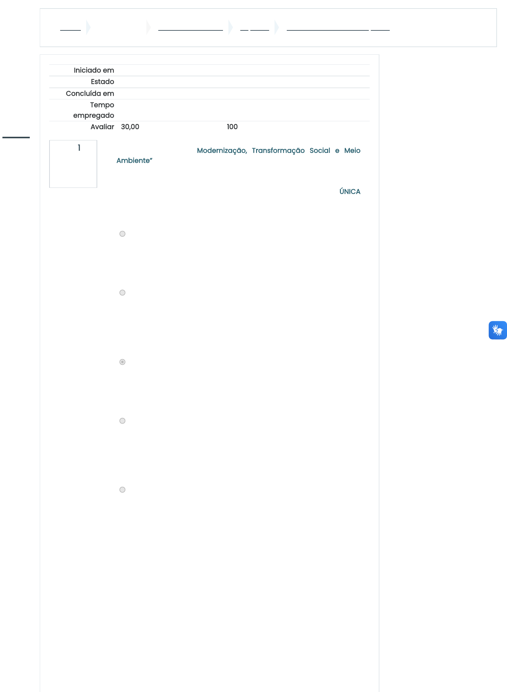Painel Meus cursos FNEMA231_2023_T1 Tópico 3 Atividade Avaliativa - tópico 3 Questão 1 Correto Atingiu 6,00 de 6,00 Iniciado em sexta, 22 set 2023, 10:28 Estado Finalizada Concluída em sexta, 22 set 2023, 10:53 Tempo empregado 25 minutos 42 segundos Avaliar 30,00 de um máximo de 30,00(100%) No Aprofundamento “Modernização, Transformação Social e Meio Ambiente” (Área de Ciências Humanas e Sociais Aplicadas) está presente a unidade curricular intitulada “Perspectivas geográficas: sociedade, espaço e recursos naturais”, pertencente ao componente de Geografia. Considerando esta unidade curricular, assinale a ÚNICA alternativa que mostra características referentes a ela: Escolha uma opção: a. esta unidade mostra que o espaço geográfico expressa as desigualdades sociais, a distribuição de poder e o jogo de interesses e de pressões existentes entre grupos e classes sociais sobre o Estado. b. esta unidade mostra como investigar e analisar situações- problema envolvendo temas e processos de natureza histórica, social, econômica, filosófica, política e/ou cultural, em âmbito local, regional, nacional e/ou global, considerando dados e informações disponíveis em diferentes mídias. c. esta unidade curricular propõe utilizar o apoio de tecnologias digitais para identificar, selecionar, processar e analisar dados, fatos e evidências com curiosidade, atenção, criticidade e ética. d. esta unidade curricular mostra que o espaço geográfico está em constante transformação, e esse fato resulta das relações sociais nele estabelecidas. Aponta que o homem, por intermédio do desenvolvimento de técnicas, modifica a organização dos elementos espaciais. e. esta unidade curricular fala da importância das fontes de energia nas atividades humanas, pois originam combustíveis e eletricidade que servem para iluminar, movimentar máquinas, caminhões entre outras aplicações. http://cursos.sedu.es.gov.br/my/ http://cursos.sedu.es.gov.br/course/view.php?id=676 http://cursos.sedu.es.gov.br/course/view.php?id=676§ion=3 http://cursos.sedu.es.gov.br/mod/quiz/view.php?id=13989 javascript:void(0); http://cursos.sedu.es.gov.br/user/index.php?id=676 http://cursos.sedu.es.gov.br/badges/view.php?type=2&id=676 http://cursos.sedu.es.gov.br/theme/moove/certificates.php?id=676 http://cursos.sedu.es.gov.br/admin/tool/lp/coursecompetencies.php?courseid=676 http://cursos.sedu.es.gov.br/grade/report/index.php?id=676 http://cursos.sedu.es.gov.br/my/ http://cursos.sedu.es.gov.br/?redirect=0 http://cursos.sedu.es.gov.br/calendar/view.php?view=month&course=676 javascript:void(0); http://cursos.sedu.es.gov.br/user/files.php Questão 2 Correto Atingiu 6,00 de 6,00 Sobre o perfil do estudante egresso: O estudante egresso do Aprofundamento da área de Ciências da Natureza e suas Tecnologias e de terá uma formação humana científico-tecnológica com o desenvolvimento da criticidade e consciência de sua responsabilidade ética frente às questões referentes à vida e ao . Dessa forma, o Aprofundamento visa ao desenvolvimento integral do ser humano e da sociedade por meio do comprometimento social e da solidariedade. O estudante estará apto para atender as demandas da sociedade de promover um desenvolvimento que minimize e ambientais. Já o perfil do(a) estudante egresso do Aprofundamento , das áreas de Linguagens e suas Tecnologias e de Ciências Humanas e Sociais Aplicadas, será de um cidadão com conhecimentos referentes à formação humana em suas múltiplas dimensões. Será capaz de relacionar diferentes e diferentes conhecimentos, por meio de uma formação ética, estética e crítica. Ele(a) atuará no mundo do trabalho e das relações sociais com , atitudes e valores voltados para uma sociedade justa, igualitária e sustentável; será comprometido(a) com as diversidades , natureza e a cultura. Humanidades e Relações Socioambientais Ciências Humanas e Sociais Aplicadas meio ambiente sustentável impactos sociais Narrativas Socioliterárias: Literatura, Arte e Ciências Humanas linguagens protagonismo humanas javascript:void(0); http://cursos.sedu.es.gov.br/user/index.php?id=676 http://cursos.sedu.es.gov.br/badges/view.php?type=2&id=676 http://cursos.sedu.es.gov.br/theme/moove/certificates.php?id=676 http://cursos.sedu.es.gov.br/admin/tool/lp/coursecompetencies.php?courseid=676 http://cursos.sedu.es.gov.br/grade/report/index.php?id=676 http://cursos.sedu.es.gov.br/my/ http://cursos.sedu.es.gov.br/?redirect=0 http://cursos.sedu.es.gov.br/calendar/view.php?view=month&course=676 javascript:void(0); http://cursos.sedu.es.gov.br/user/files.php Questão 3 Correto Atingiu 6,00 de 6,00 Questão 4 Correto Atingiu 6,00 de 6,00 Espera-se que o estudante, ao cursar o Aprofundamento “Educação Financeira e Fiscal”, se forme para o exercício da cidadania; aprenda a consumir e a poupar de modo ético, consciente e responsável; aprenda a planejar financeiramente em curto, médio e longo prazos e desenvolva a cultura do consumismo. Escolha uma opção: Verdadeiro Falso A partir da Unidade Curricular apresentada, indique a qual aprofundamento ela pertence. Escolha uma opção: a. Terra, Vida e Cosmo b. Humanidades e Relações Socioambientais c. Energias Renováveis e Eficiência Energética d. Aspirações Docentes, Vivências e Reflexões e. Narrativas socioliterárias: Literatura, Arte e Ciências Humanas https://www.canva.com/design/DAFrhX3cnG8/view?utm_content=DAFrhX3cnG8&utm_campaign=designshare&utm_medium=embeds&utm_source=link javascript:void(0); http://cursos.sedu.es.gov.br/user/index.php?id=676 http://cursos.sedu.es.gov.br/badges/view.php?type=2&id=676 http://cursos.sedu.es.gov.br/theme/moove/certificates.php?id=676 http://cursos.sedu.es.gov.br/admin/tool/lp/coursecompetencies.php?courseid=676 http://cursos.sedu.es.gov.br/grade/report/index.php?id=676 http://cursos.sedu.es.gov.br/my/ http://cursos.sedu.es.gov.br/?redirect=0 http://cursos.sedu.es.gov.br/calendar/view.ph